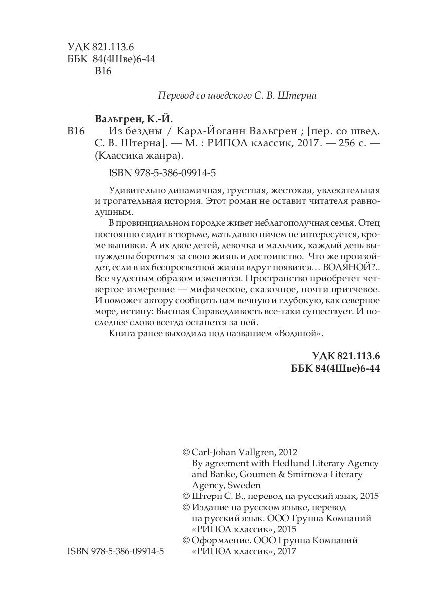 Удивительно динамичная, грустная, жестокая, увлекательная и трогательная история. Этот роман не оставит читателя равнодушным. В провинциальном городке живет неблагополучная семья. Отец постоянно сидит в тюрьме, мать давно ничем не интересуется, кроме выпивки. А их двое детей, девочка и мальчик, каждый день вынуждены бороться за свою жизнь и достоинство. Что же произойдет, если в их беспросветной жизни вдруг появится... ВОДЯНОЙ?.. Все чудесным образом изменится. Пространство приобретет четвертое измерение - мифическое, сказочное, почти притчевое. И поможет автору сообщить нам вечную и глубокую, как северное море, истину: Высшая Справедливость все-таки существует. И последнее слово всегда останется за ней. Книга ранее выходила под названием «Водяной».| Издательство | Рипол Классик |