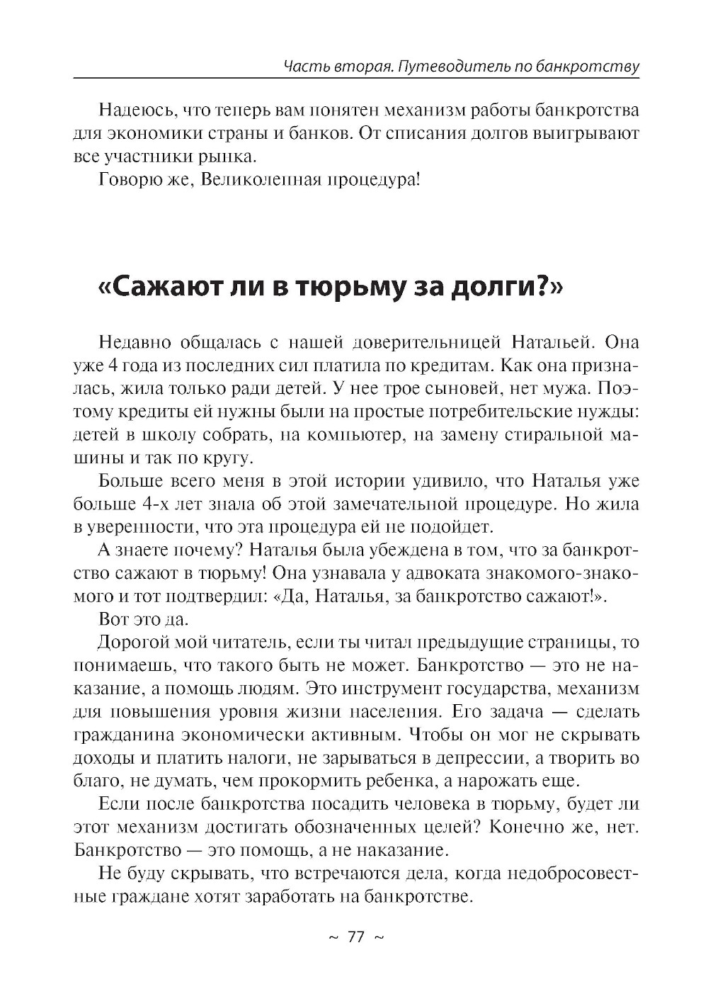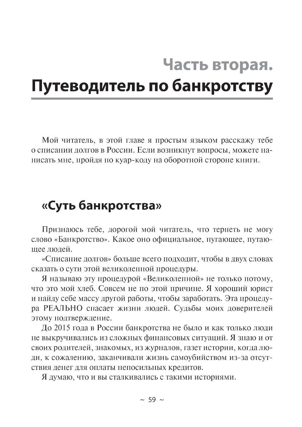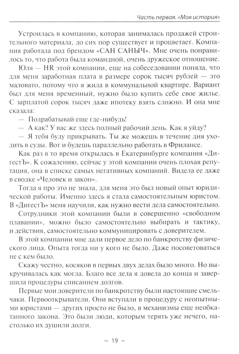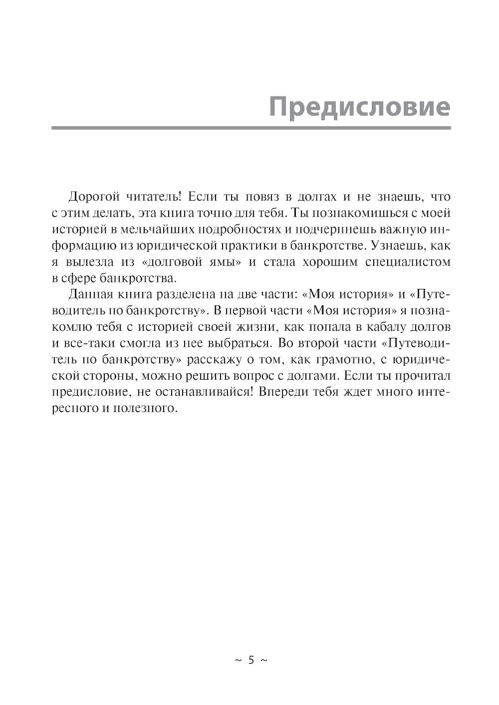 Дорогой читатель! Если ты повяз в долгах и не знаешь, что с этим делать, эта книга точно для тебя. Ты познакомишься с моей историей в мельчайших подробностях и почерпнешь важную информацию из юридической практики в банкротстве. Узнаешь, как я вылезла из «долговой ямы» и стала хорошим специалистом в сфере банкротства. Данная книга разделена на две части: «Моя история» и «Путеводитель по банкротству». В первой части «Моя история» я познакомлю тебя с историей своей жизни, как попала в кабалу долгов и все-таки смогла из нее выбраться. Во второй части «Путеводитель по банкротству» расскажу о том, как грамотно, с юридической стороны, можно решить вопрос с долгами. Если ты прочитал предисловие, не останавливайся! Впереди тебя ждет много интересного и полезного.