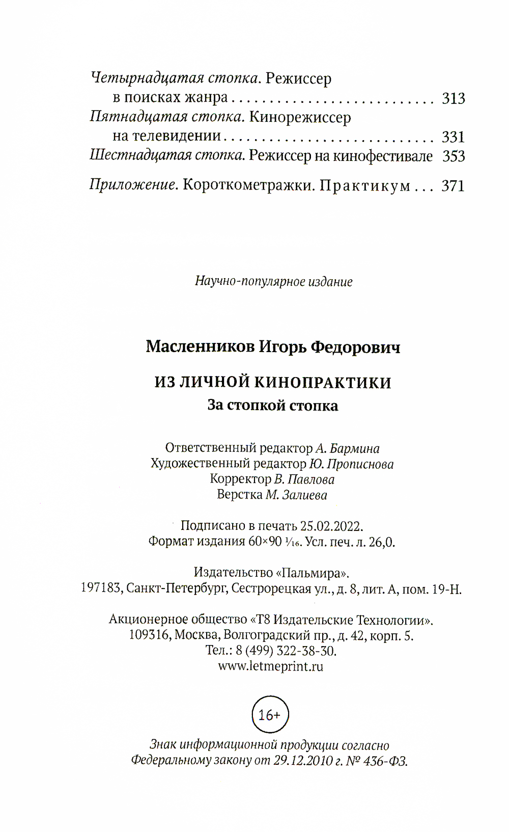 Настоящее издание основано на курсах лекций «Режиссура игрового фильма», прочитанных И. Ф. Масленниковым в СПБГУКиТ и ВГИКе в 1998-2011 годах. Но это не теоретический курс по кинорежиссуре. Скорее, это сборник воспоминаний, наблюдений и заметок, основанных на опыте, накопленном за сорок лет практической работы в киноиндустрии. Написанная в легком, изящном, ироничном стиле, книга может стать как учебным пособием для студентов кинематографических специальностей, так и занятным чтением для всех, кто интересуется кино.| Издательство | Т8 RUGRAM |