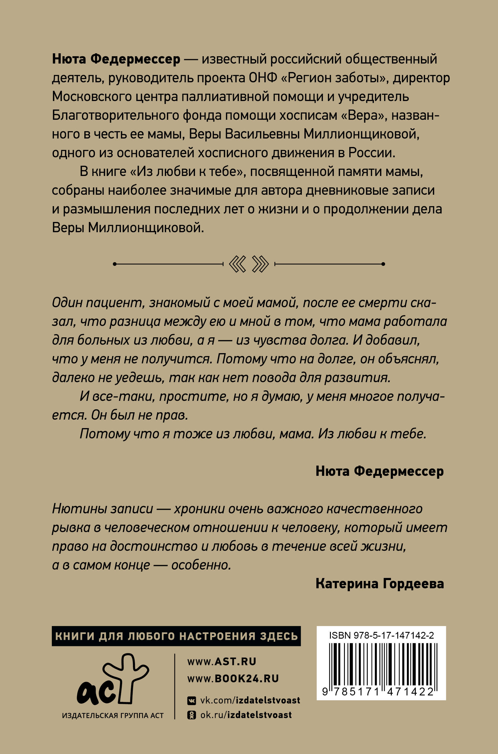 Нюта Федермессер - известный российский общественный деятель, руководитель проекта ОНФ «Регион заботы», директор Московского центра паллиативной помощи и учредитель Благотворительного фонда помощи хосписам «Вера», названного в честь ее мамы, Веры Васильевны Миллионщиковой, одного из основателей хосписного движения в России. В книге «Из любви к тебе», посвященной памяти мамы, собраны наиболее значимые для автора дневниковые записи и размышления последних лет о жизни и о продолжении дела Веры Миллионщиковой. «Один пациент, знакомый с моей мамой, после ее смерти сказал, что разница между ею и мной в том, что мама работала для больных из любви, а я - из чувства долга. И добавил, что у меня не получится. Потому что на долге, он объяснял, далеко не уедешь, так как нет повода для развития. И все-таки, простите, но я думаю, у меня многое получается. Он был не прав. Потому что я тоже из любви, мама. Из любви к тебе». - Нюта Федермессер «Нютины записи - хроники очень важного качественного рывка в человеческом отношении к человеку, который имеет право на достоинство и любовь в течение всей жизни, а в самом конце - особенно». - Катерина Гордеева| Издательство | ИЗДАТЕЛЬСТВО "АСТ" |