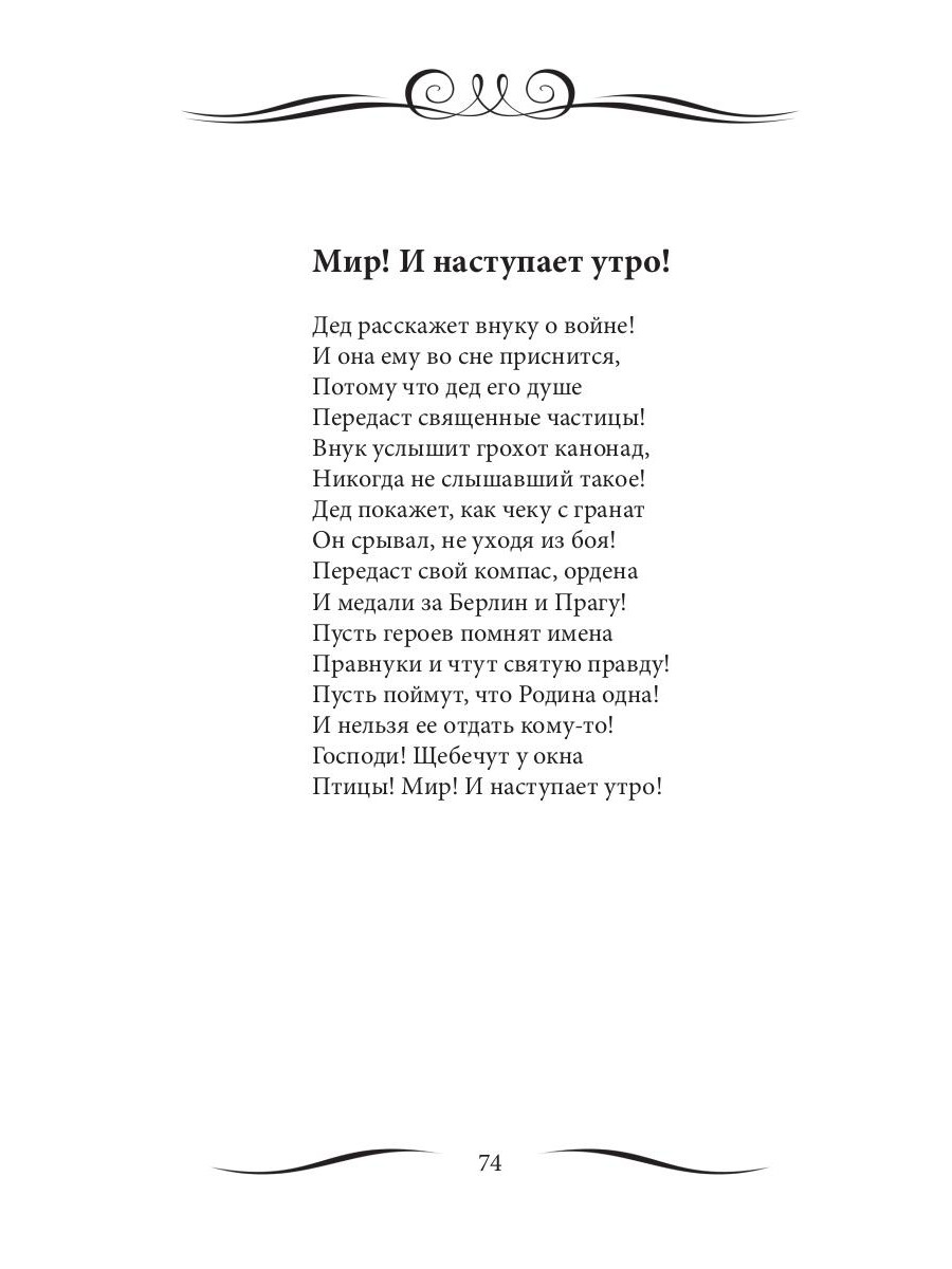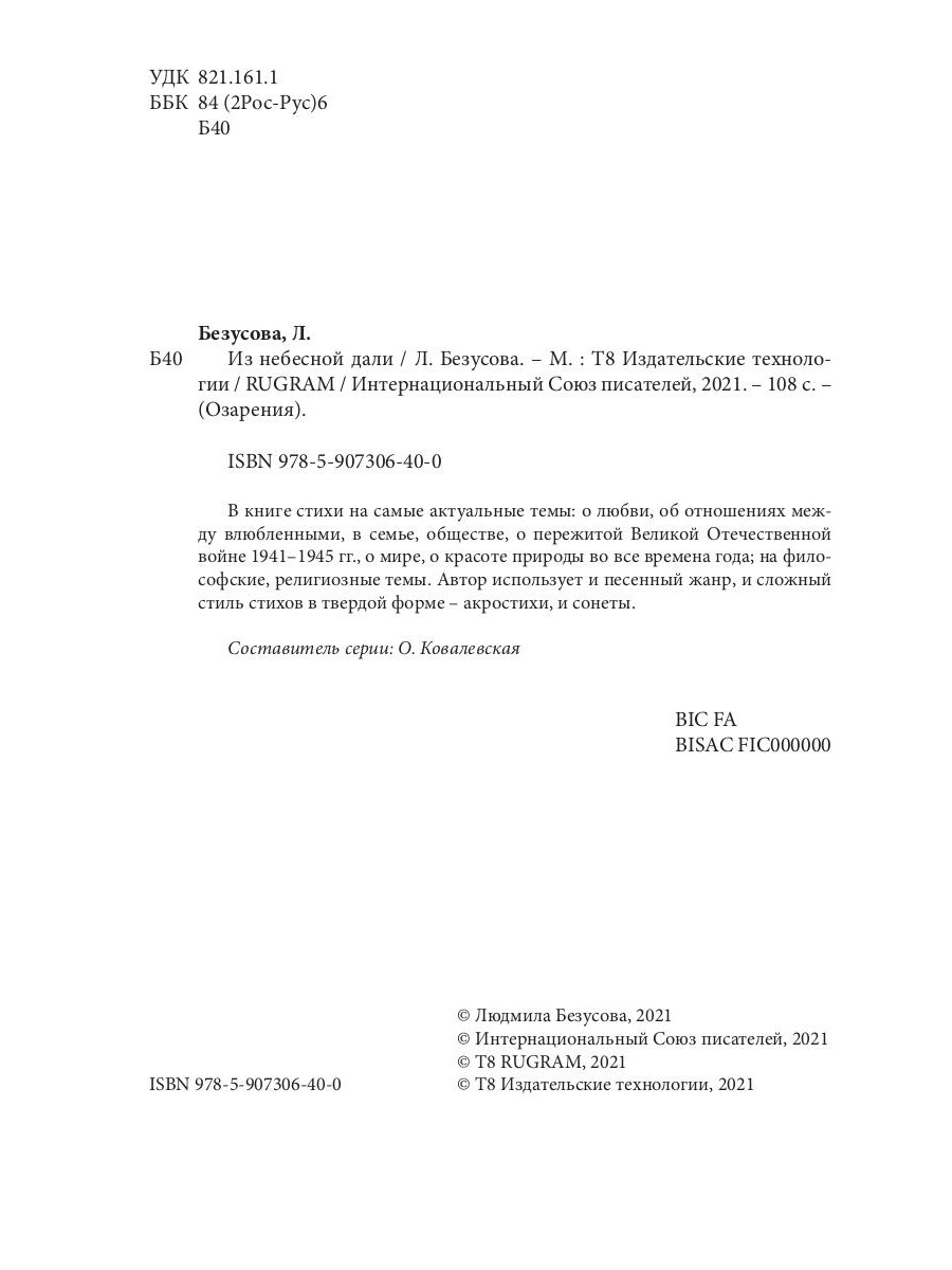 В книге стихи на самые актуальные темы: о любви, об отношениях между влюбленными, в семье, обществе, о пережитой Великой Отечественной войне 1941-1945 гг., о мире, о красоте природы во все времена года; на философские, религиозные темы. Автор использует и песенный жанр, и сложный стиль стихов в твердой форме - акростихи, и сонеты.| Издательство | Т8 RUGRAM |