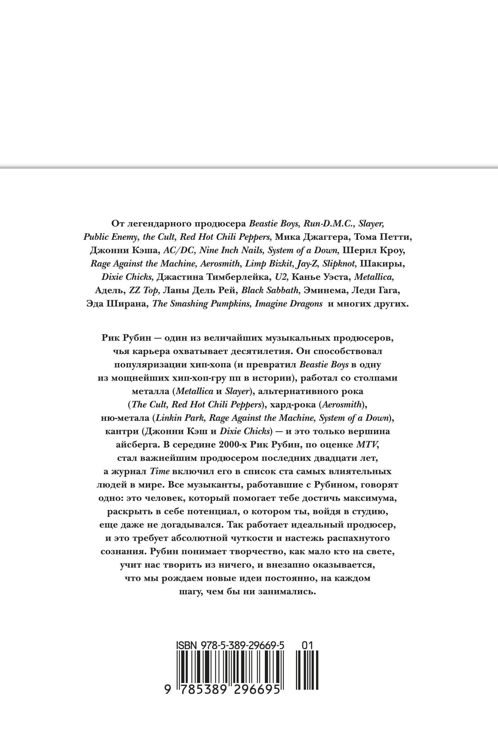 Бестселлер «Из ничего: искусство создавать искусство» великого музыкального продюсера Рика Рубина - руководство по творческому мышлению и творческому подходу к решению задач в любой области. Эта книга написана прозрачным языком и говорит о сложных вещах простыми словами. Она поддерживает нашу веру в собственные творческие силы, когда нам просто нужна поддержка, и дарит случайные озарения или мягко направляет, когда кажется, будто мы зашли в тупик, и нам нужна вспышка вдохновения. Продюсерская карьера Рика Рубина охватывает десятилетия. Он способствовал популяризации хип-хопа (и превратил Beastie Boys в одну из мощнейших хип-хоп-групп в истории), работал со столпами металла (Metallica и Slayer), альтернативного рока (The Cult, Red Hot Chili Peppers), хард-рока (Aerosmith), ню-метала (Linkin Park, Rage Against the Machine, System of a Down), кантри (Джонни Кэш и Dixie Chicks) - и это только вершина айсберга. В середине 2000-х Рик Рубин, по оценке MTV, стал важнейшим продюсером последних 20 лет, а журнал Time включил его в список ста самых влиятельных людей в мире. Все музыканты, работавшие с Рубином, говорят одно: это человек, который помогает тебе достичь максимума, раскрыть в себе потенциал, о котором ты, войдя в студию, еще даже не догадывался. Так работает идеальный продюсер, и это требует абсолютной чуткости и настежь распахнутого сознания. Рубин понимает творчество, как мало кто на свете, учит нас творить из ничего, и внезапно оказывается, что мы рождаем новые идеи постоянно, на каждом шагу, чем бы ни занимались. Читайте книгу подряд и следуйте за автором - или открывайте ее на случайной странице и используйте то, что там найдете, в любом порядке. Смотрите, что получится. Пути творчества нелинейны и неисповедимы, а творить способны мы все. Стильное издание в тканевом переплете, с ленточкой ляссе и на прекрасной бумаге станет универсальным подарком - в том числе для тех, кто так или иначе практикует или хотел бы практиковать творческий подход к любому занятию.| Издательство | Издательство АЗБУКА ООО |