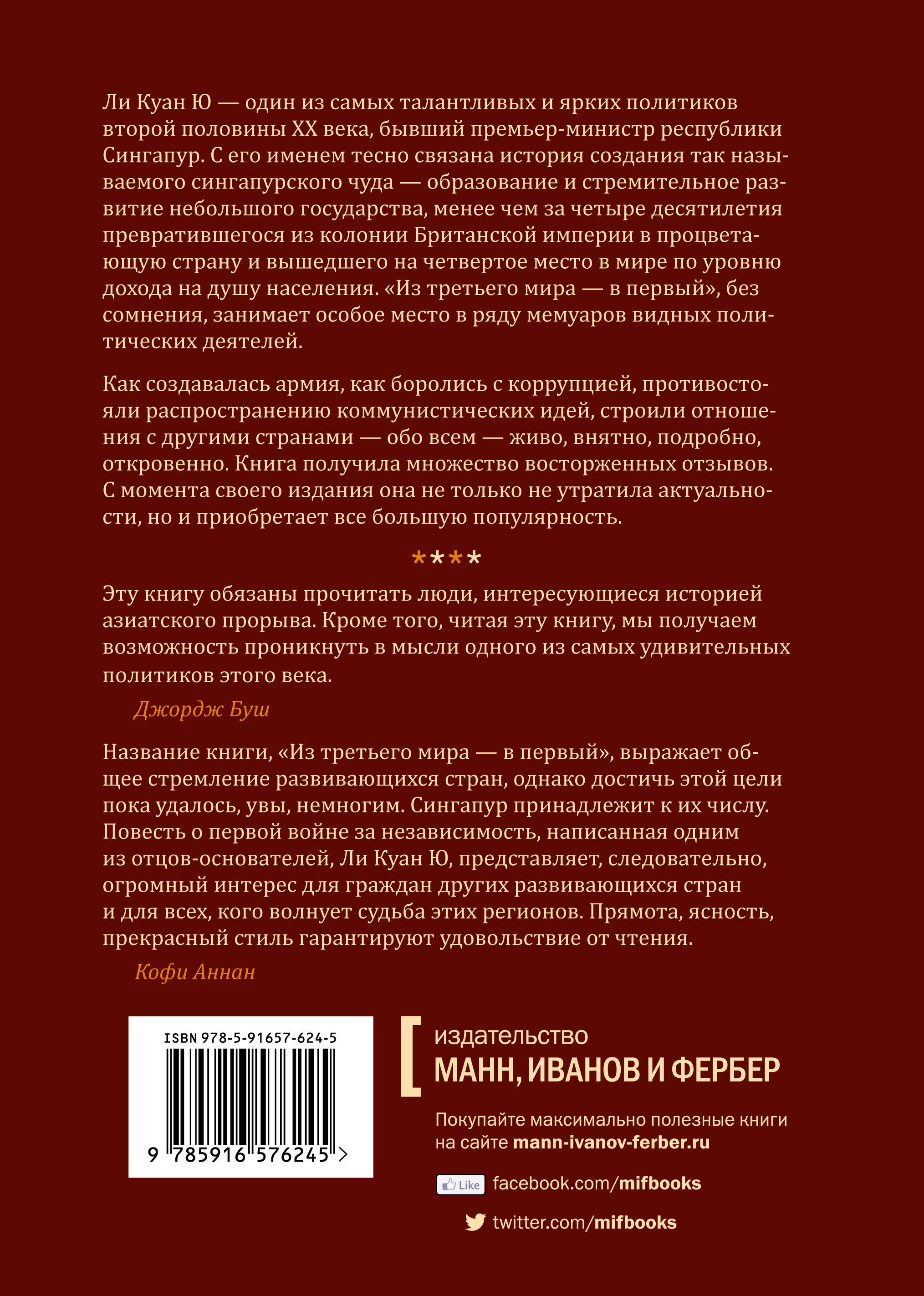 Когда крохотный Сингапур в 1965 году получил независимость, никто не верил, что ему удастся выжить. Каким же образом фактория Великобритании превратилась в процветающую столицу Азиатского региона с лучшим в мире аэропортом, крупнейшей авиалинией, ключевым торговым портом и заняла четвертое место в мире по уровню дохода на душу населения? История "сингапурского чуда" рассказана здесь человеком, который был не просто очевидцем этих драматических событий, но творцом перемен - бывшим премьер-министром страны Ли Куан Ю.| Издательство | Манн, Иванов и Фербер |