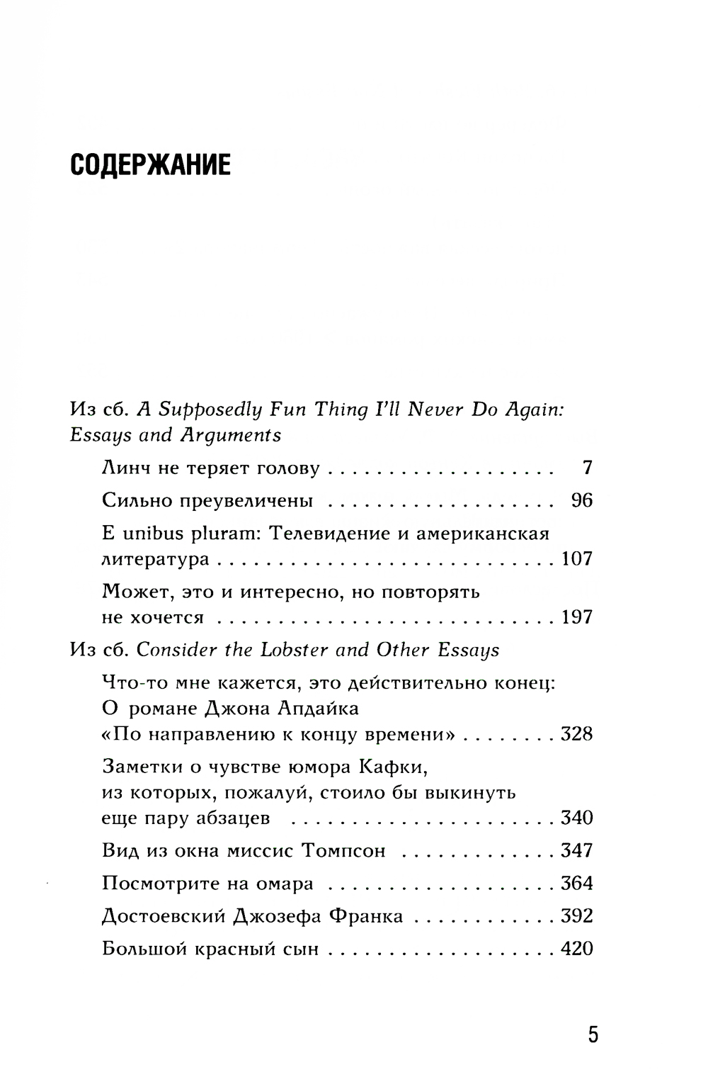 В книге представлены избранные эссе Дэвида Фостера Уоллеса - автора «Бесконечной шутки», одного из лучших постмодернистских романов. От телевизионного вуайеризма до тенниса, от фестиваля поедания омаров в штате Мэн до фильмов Дэвида Линча, от Борхеса и Кафки до сомнительного удовольствия путешествовать на борту роскошного круизного лайнера по Карибскому морю, от американского взгляда на Достоевского до церемонии вручения наград за достижения в порнокиноиндустрии - Уоллес насыщает жанр эссе тематическим разнообразием, той же иронией и языковой непринужденностью, которые восхищали читателей его бестселлера.| Издательство | Гонзо |