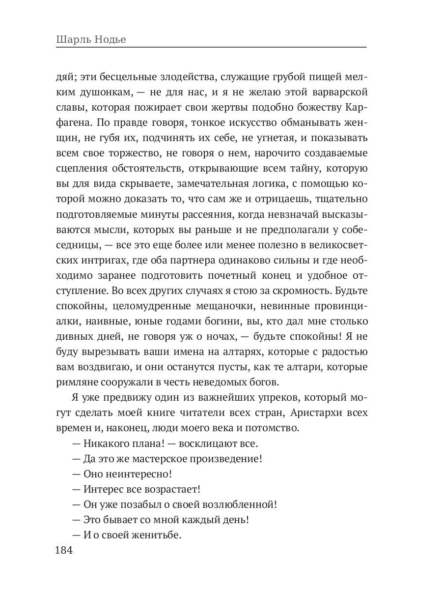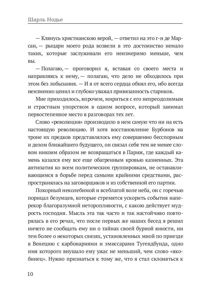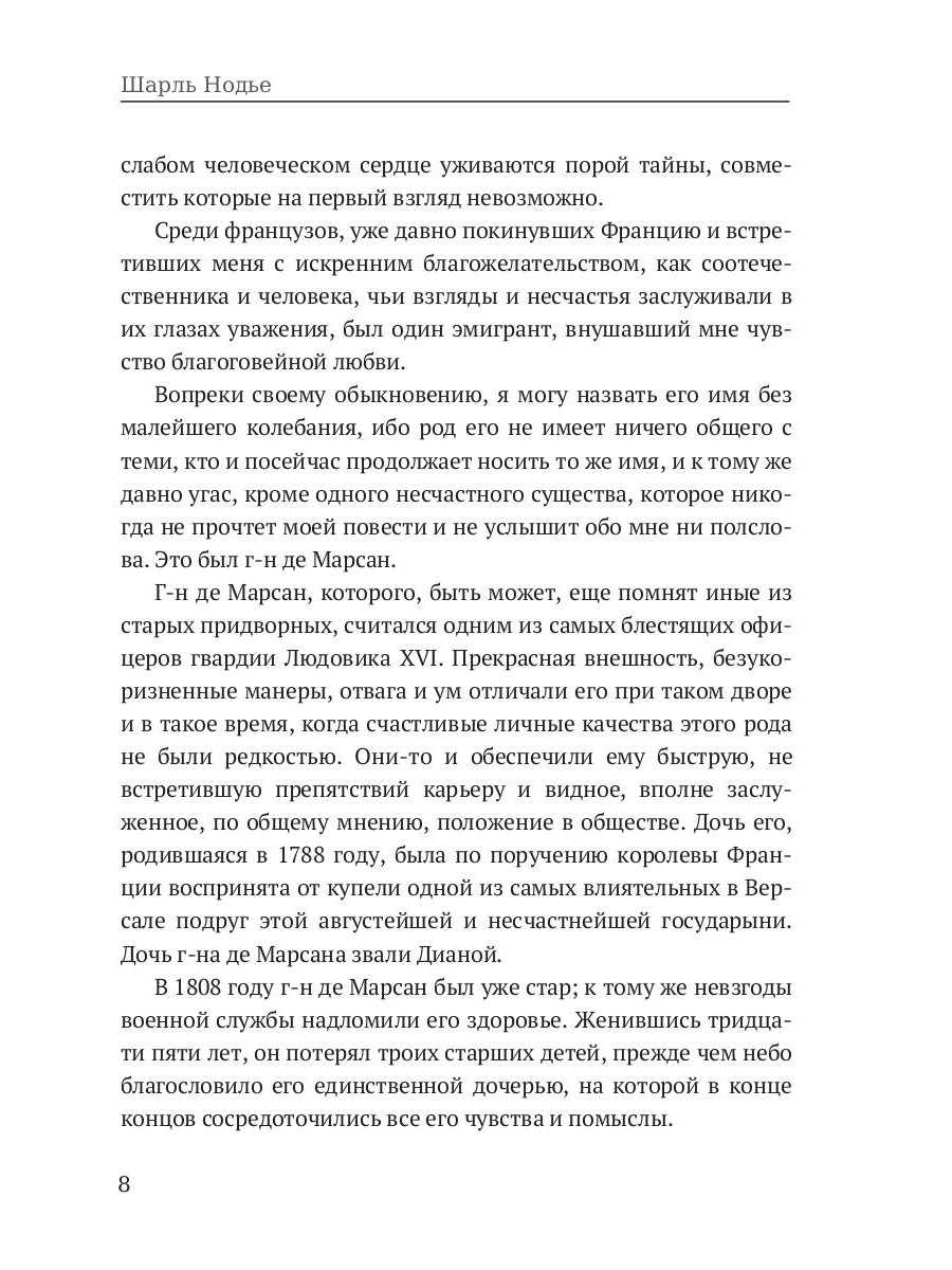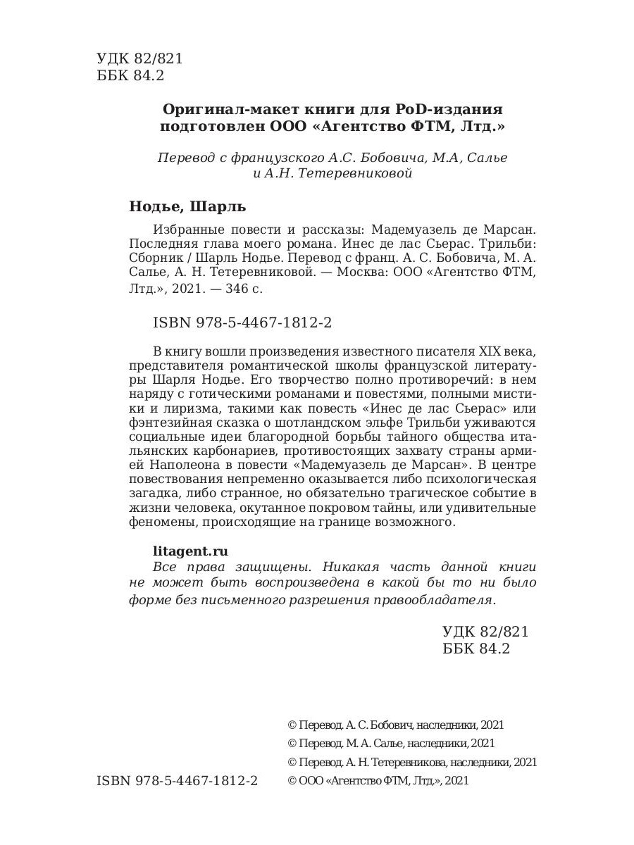 В книгу вошли произведения известного писателя XIX века, представителя романтической школы французской литературы Шарля Нодье. Его творчество полно противоречий: в нем наряду с готическими романами и повестями, полными мистики и лиризма, такими как повесть «Инес де лас Сьерас» или фэнтезийная сказка о шотландском эльфе Трильби уживаются социальные идеи благородной борьбы тайного общества итальянских карбонариев, противостоящих захвату страны армией Наполеона в повести «Мадемуазель де Марсан». В центре повествования непременно оказывается либо психологическая загадка, либо странное, но обязательно трагическое событие в жизни человека, окутанное покровом тайны, или удивительные феномены, происходящие на границе возможного.| Издательство | Т8 RUGRAM |