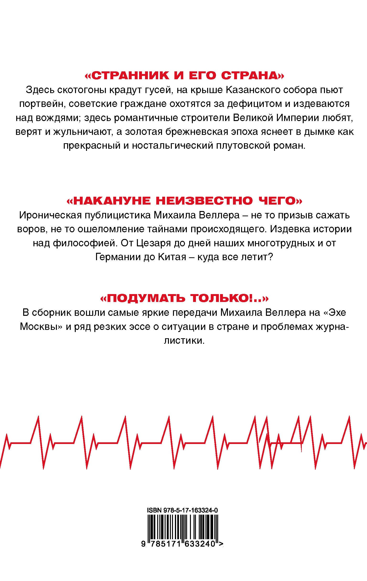 "СТРАННИК И ЕГО СТРАНА" Здесь скотогоны крадут гусей, на крыше Казанского собора пьют портвейн, советские граждане охотятся за дефицитом и издеваются над вождями; здесь романтичные строители Великой Империи любят, верят и жульничают, а золотая брежневская эпоха яснеет в дымке как прекрасный и ностальгический плутовской роман. "НАКАНУНЕ НЕИЗВЕСТНО ЧЕГО" Ироническая публицистика Михаила Веллера - не то призыв сажать воров, не то ошеломление тайнами происходящего. Издевка истории над философией. От Цезаря до дней наших многотрудных и от Германии до Китая - куда все летит? "ПОДУМАТЬ ТОЛЬКО!.." В сборник вошли самые яркие передачи Михаила Веллера на "Эхе Москвы" и ряд резких эссе о ситуации в стране и проблемах журналистики.| Издательство | Издательство "АСТ" |