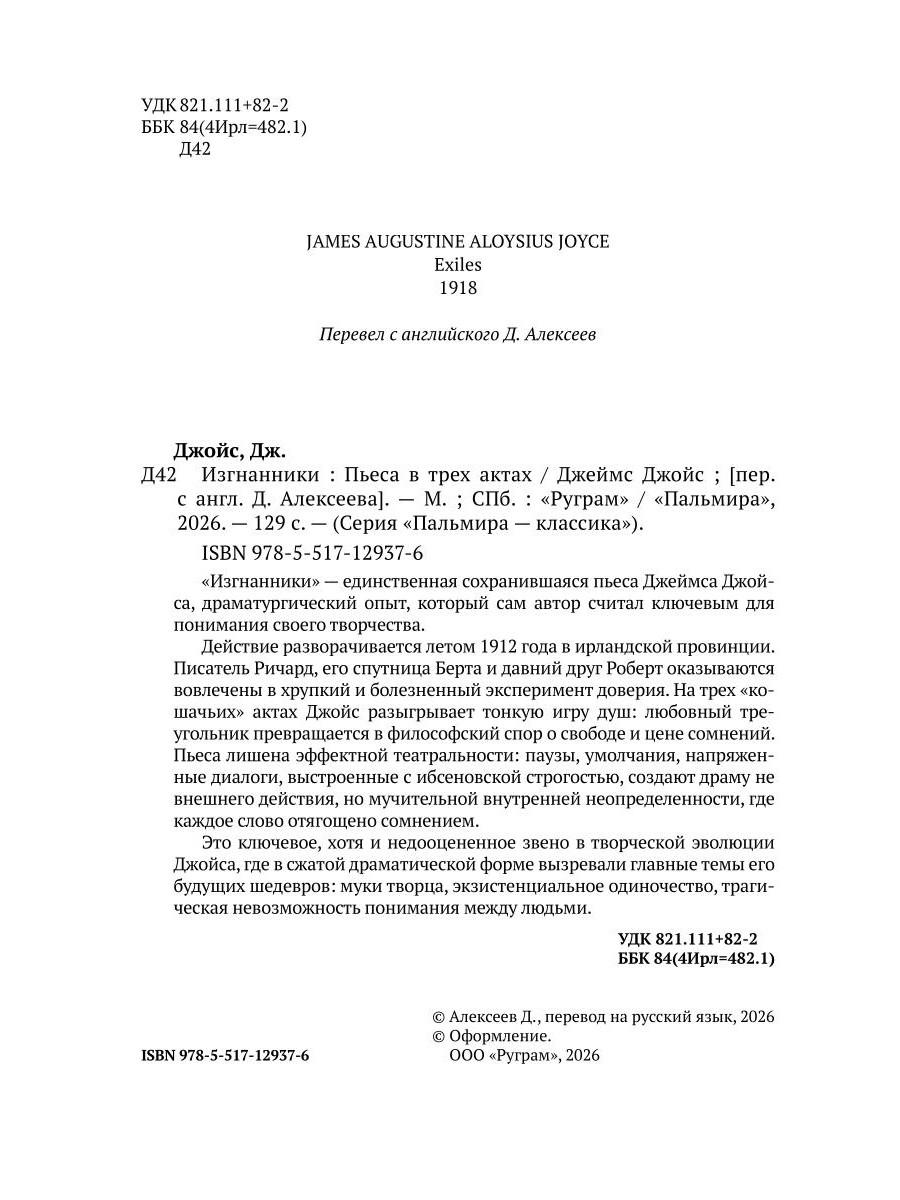 «Изгнанники» - единственная сохранившаяся пьеса Джеймса Джойса, драматургический опыт, который сам автор считал ключевым для понимания своего творчества. Действие разворачивается летом 1912 года в ирландской провинции. Писатель Ричард, его спутница Берта и давний друг Роберт оказываются вовлечены в хрупкий и болезненный эксперимент доверия. На трех «кошачьих» актах Джойс разыгрывает тонкую игру душ: любовный треугольник превращается в философский спор о свободе и цене сомнений. Пьеса лишена эффектной театральности: паузы, умолчания, напряженные диалоги, выстроенные с ибсеновской строгостью, создают драму не внешнего действия, но мучительной внутренней неопределенности, где каждое слово отягощено сомнением. Это ключевое, хотя и недооцененное звено в творческой эволюции Джойса, где в сжатой драматической форме вызревали главные темы его будущих шедевров: муки творца, экзистенциальное одиночество, трагическая невозможность понимания между людьми.| Издательство | Т8 RUGRAM |