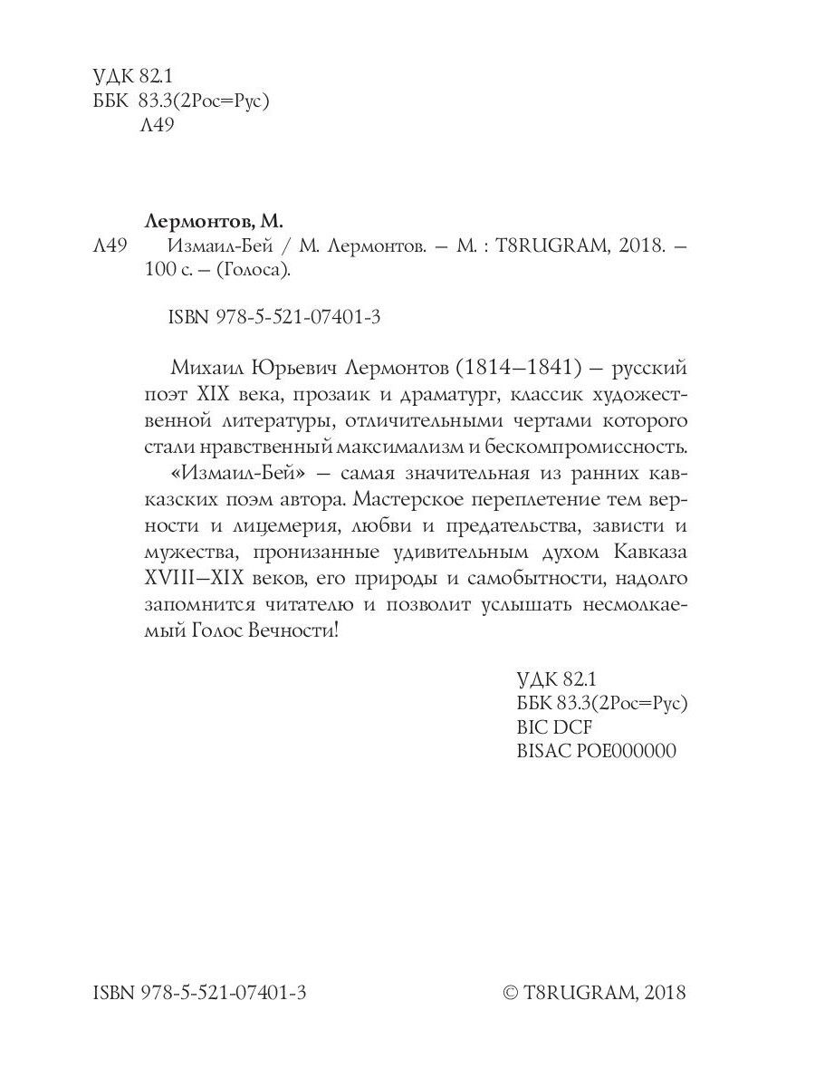 «Измаил-Бей» - самая значительная из ранних кавказских поэм автора. Мастерское переплетение тем верности и лицемерия, любви и предательства, зависти и мужества, пронизанные удивительным духом Кавказа XVIII-XIX веков, его природы и самобытности, надолго запомнится читателю и позволит услышать несмолкаемый Голос Вечности!