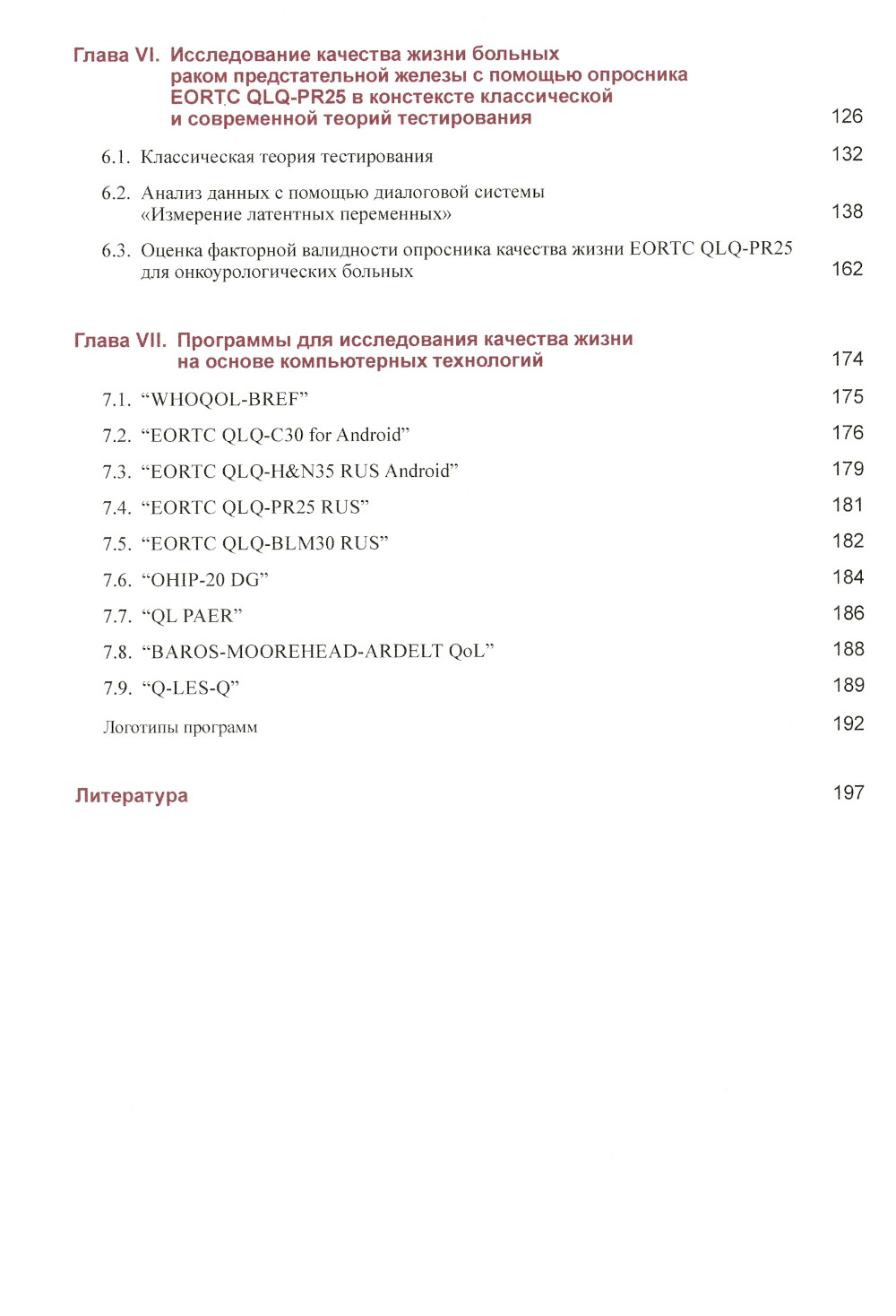 В главе VII обсуждаются созданные в МГМСУ им. А. И. Евдокимова цифровые версии программ "WHOQOL-BREF", "EORTC QLQ-C30 for Android", "EORTC QLQ-H&N35 RUS ANDROID", "EORTC QLQ-PR25 RUS", "EORTC QLQ-BLM30 RUS", "OHIP-20 DG", "QL PAER", "Baros-Moorehead-Ardelt QoL", "Q-LES-Q" для исследования КЖ.