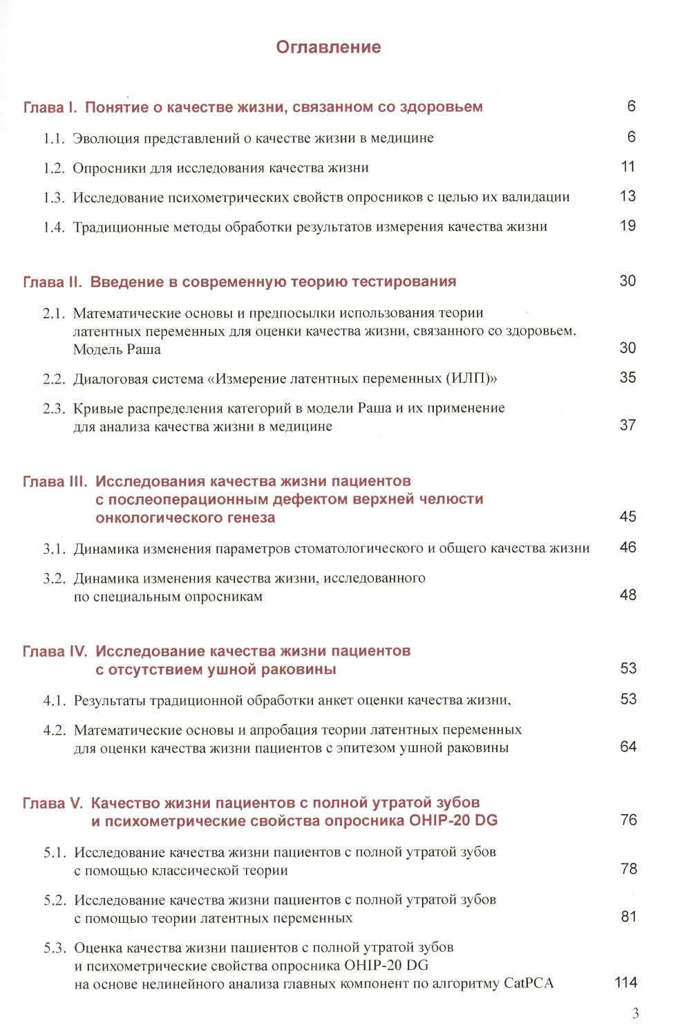 Главы III-VI посвящены конкретным исследованиям уровня КЖ при лечении различных нозологий: у пациентов с послеоперационными дефектами верх ней челюсти онкологического генеза, отсутствием ушной раковины, с полной поте рей зубов и больных раком предстательной железы. Применяли как традиционные методы исследования на базе аддитивной методики, так и современные, основанные на теории латентных переменных. Действительно, использование модели Раша для оценки КЖ имеет предпосылки. Одна из них заключается в том, что само понятие "качество жизни" является типичной латентной переменной, оценить которую удается лишь на основании некоторых индикаторных переменных, таких как результаты ответов по анкетам или опросникам. Представлены результаты кластерного анализа данных опросников КЖ OHIP-20 DG и EORTC QLQ-PR25, а также нелинейного анализа главных компонент методом CatPCA.