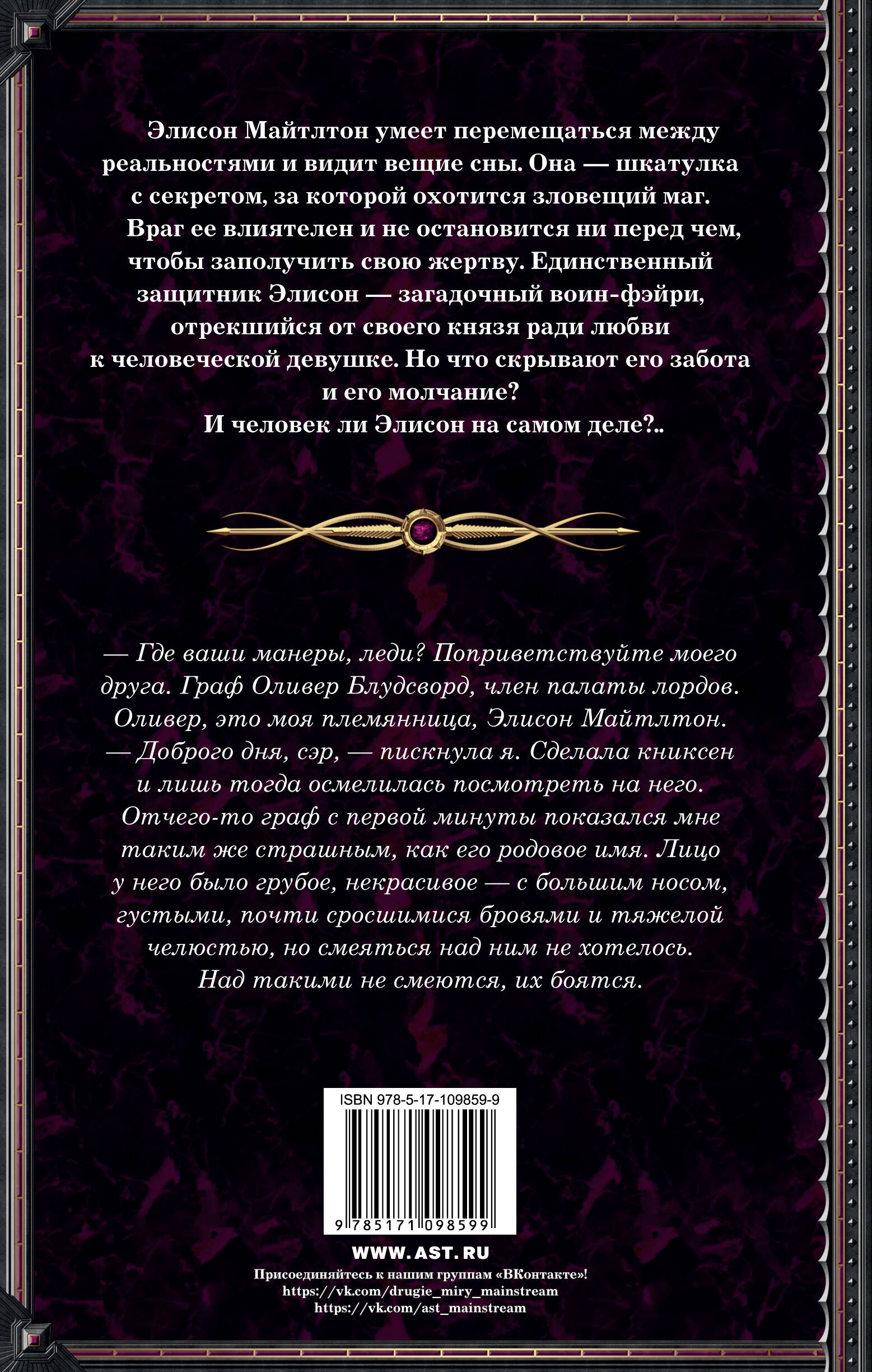 Элисон Майтлтон умеет перемещаться между реальностями и видит вещие сны. Она - шкатулка с секретом, за которой охотится зловещий маг. Враг ее влиятелен и не остановится ни перед чем, чтобы заполучить свою жертву. Единственный защитник Элисон - загадочный воин-фэйри, отрекшийся от своего князя ради любви к человеческой девушке. Но что скрывают его забота и его молчание? И человек ли Элисон на самом деле?..| Издательство | ИЗДАТЕЛЬСТВО "АСТ" |