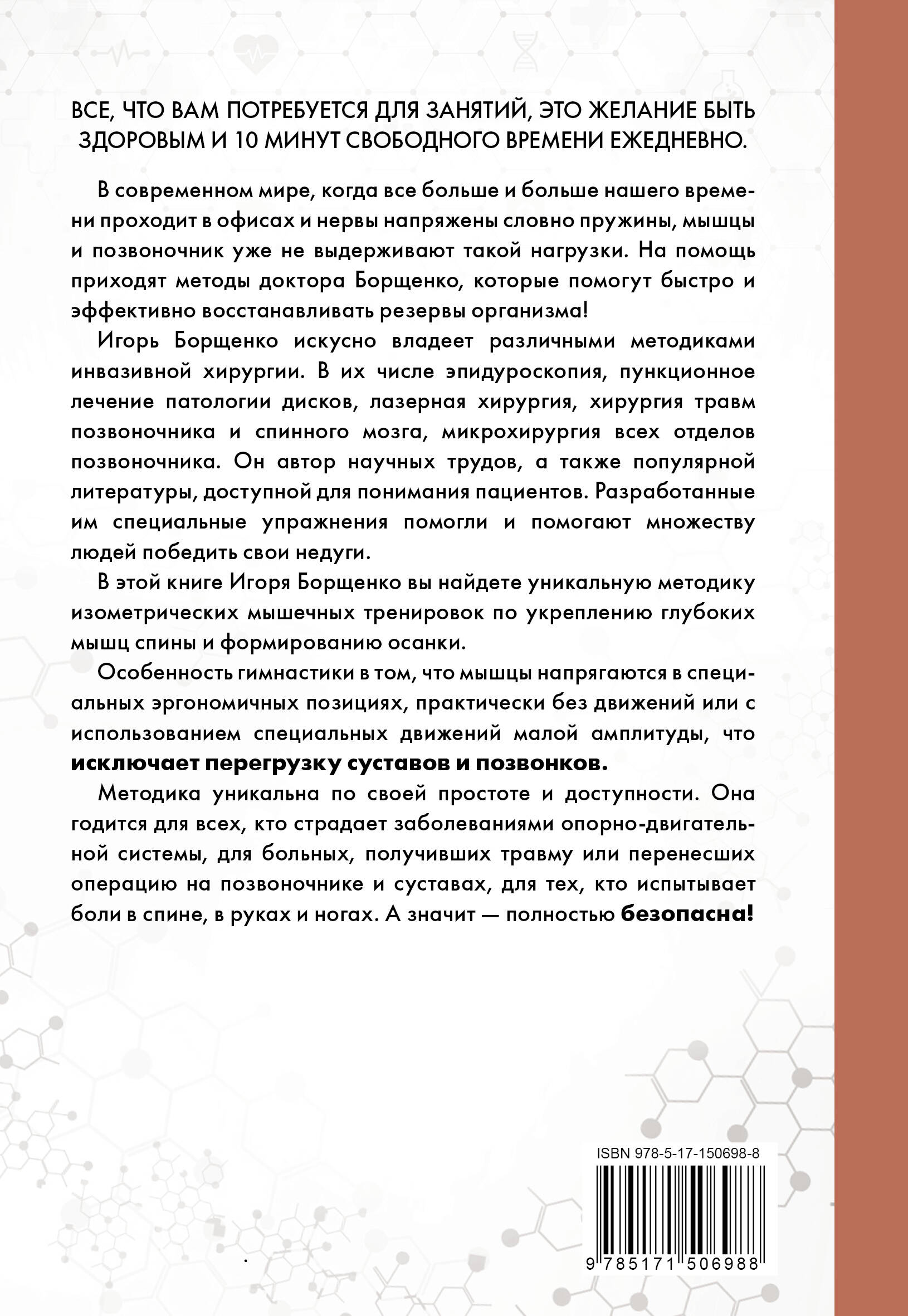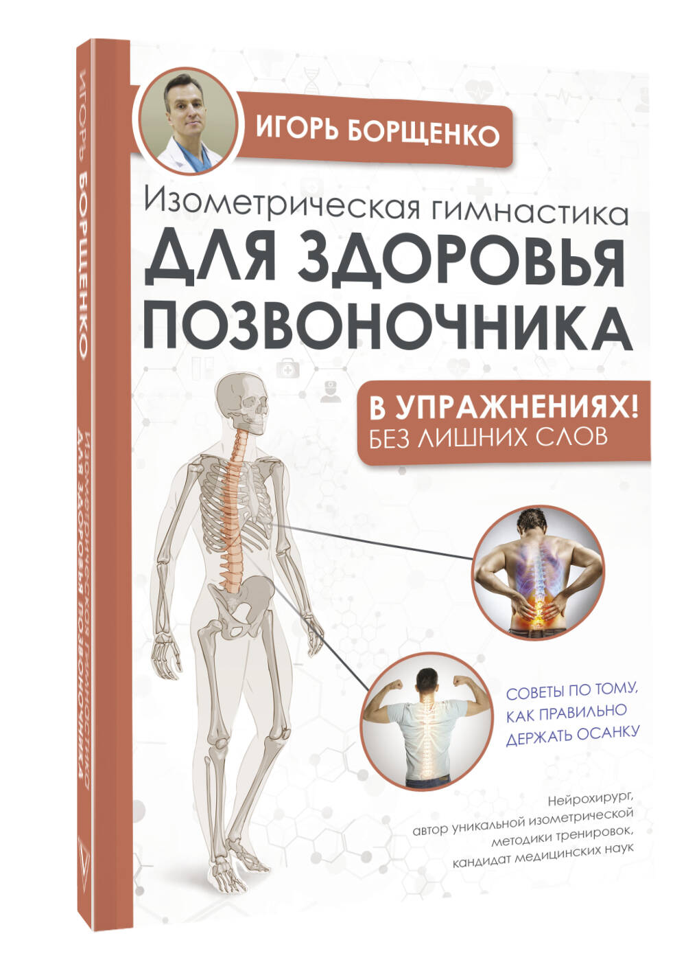 ВСЕ, ЧТО ВАМ ПОТРЕБУЕТСЯ ДЛЯ ЗАНЯТИЙ - ЭТО ЖЕЛАНИЕ БЫТЬ ЗДОРОВЫМ И 10 МИНУТ СВОБОДНОГО ВРЕМЕНИ ЕЖЕДНЕВНО. В современном мире, когда все больше и больше нашего времени проходит в офисах и нервы напряжены, словно пружины, мышцы и позвоночник уже не выдерживает такой нагрузки. На помощь приходят методы доктора Борщенко, которые помогут быстро и эффективно восстанавливать резервы организма! Игорь Борщенко -искусно владеет различными методиками инвазивной хирургии. В их числе эпидуроскопия, пункционное лечение патологии дисков, лазерная хирургия, хирургия травм позвоночника и спинного мозга, микрохирургия всех отделов позвоночника. Он автор научных трудов, а также популярной литературы, доступной для понимания пациентов. Разработанные им специальные упражнения помогли и помогают множеству людей победить свои недуги. В этой книге "Изометрическая гимнастика для здоровья позвоночника - в упражнениях!" Игоря Борщенко вы найдете уникальную методику изометрических мышечных тренировок по укреплению глубоких мышц спины и формированию осанки. Особенность гимнастики в том, что мышцы напрягаются в специальных эргономичных позициях, практически без движений или с использованием специальных движений малой амплитуды, что исключает перегрузку суставов и позвонков. Методика уникальна по своей простоте и доступности. Она годится для всех, кто страдает заболеваниями опорно-двигательной системы, для больных, получивших травму или перенесших операцию на позвоночнике и суставах, для тех, кто испытывает боли в спине, в руках и ногах. А значит - полностью безопасна!| Издательство | ИЗДАТЕЛЬСТВО "АСТ" |