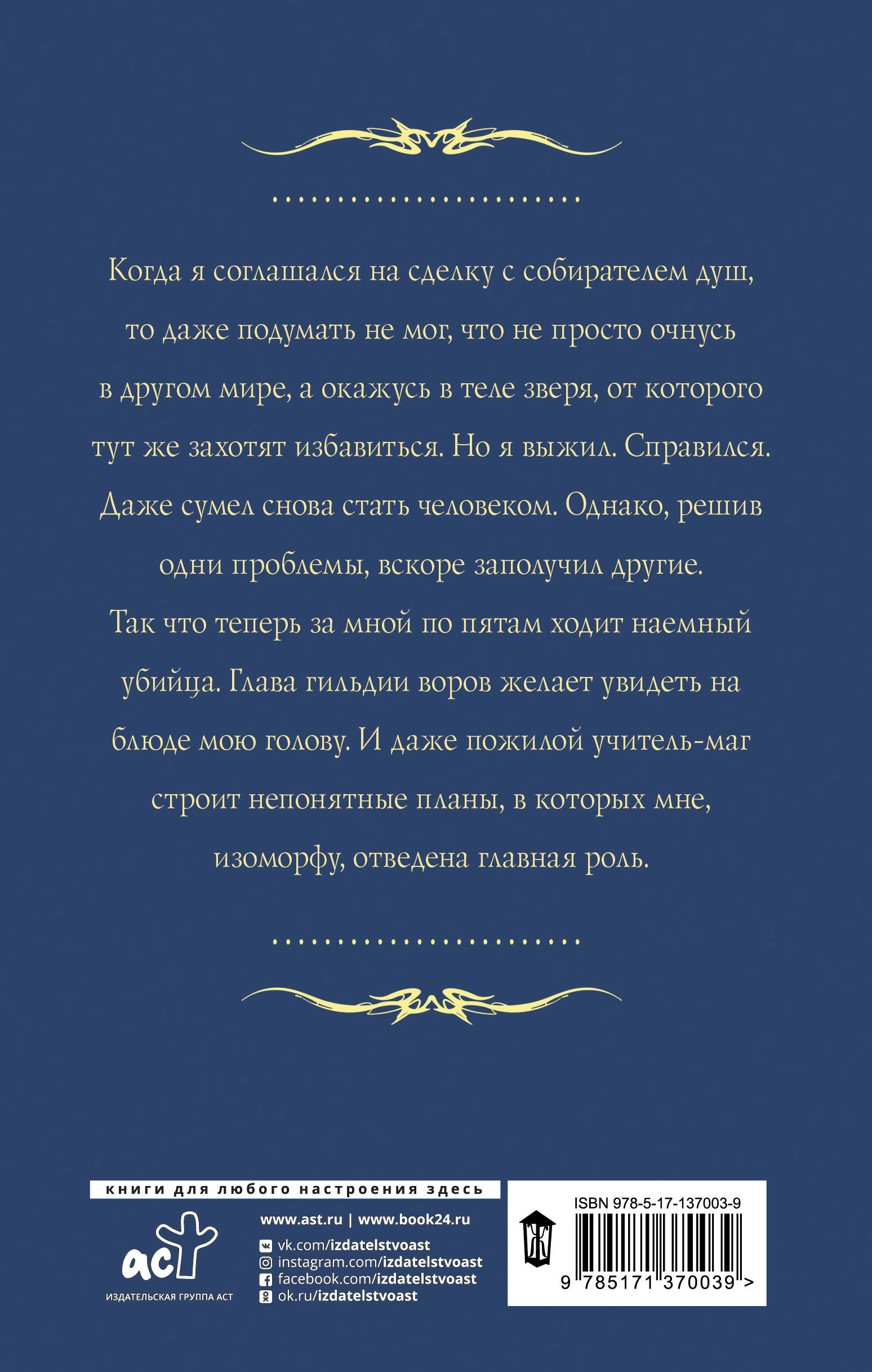 Когда я соглашался на сделку с собирателем душ, то даже подумать не мог, что не просто очнусь в другом мире, а окажусь в теле зверя, от которого тут же захотят избавиться. Но я выжил. Справился. Даже сумел снова стать человеком. Однако, решив одни проблемы, вскоре заполучил другие. Так что теперь за мной по пятам ходит наемный убийца. Глава гильдии воров желает увидеть на блюде мою голову. И даже пожилой учитель-маг строит непонятные планы, в которых мне, изоморфу, отведена главная роль.| Издательство | ИЗДАТЕЛЬСТВО "АСТ" |