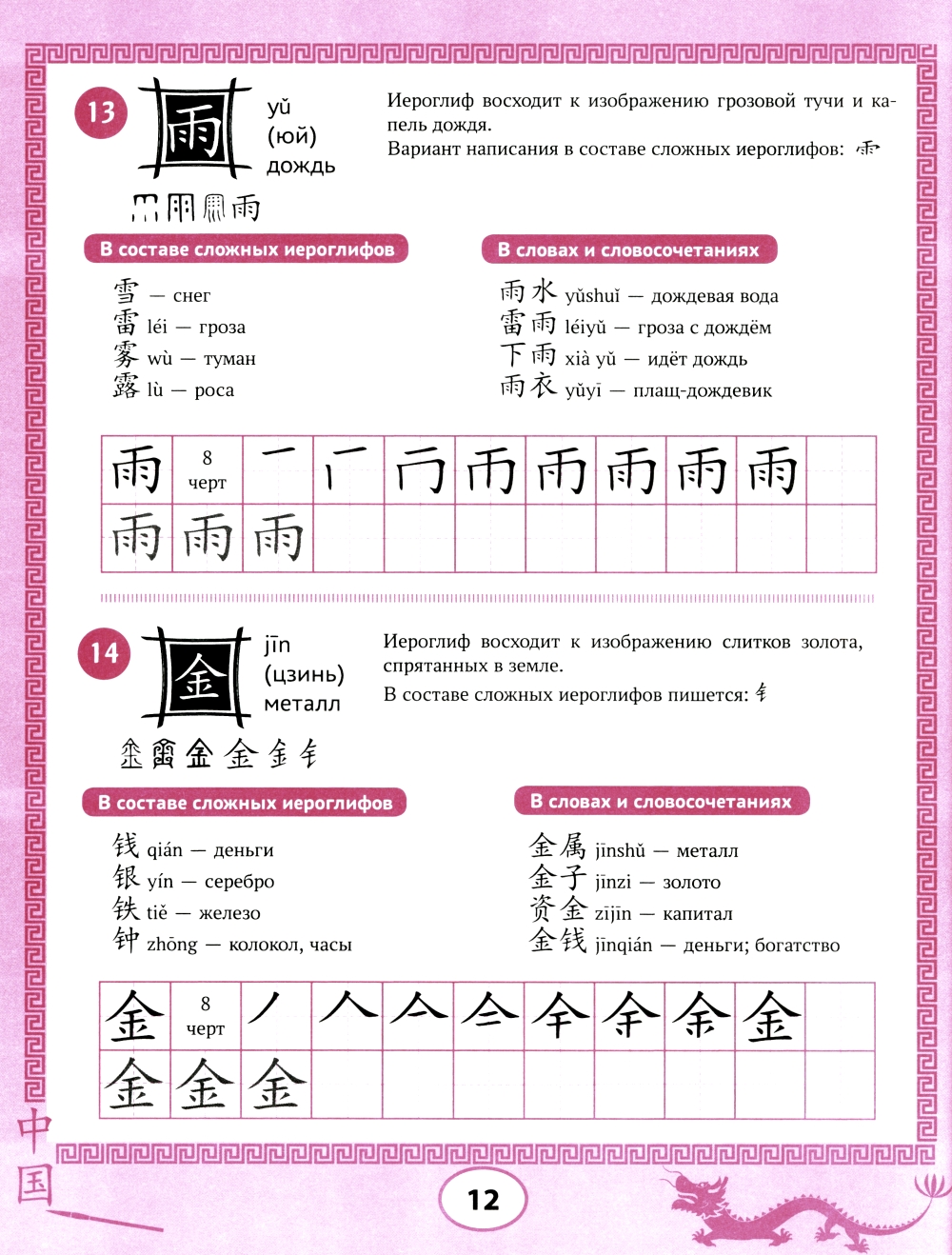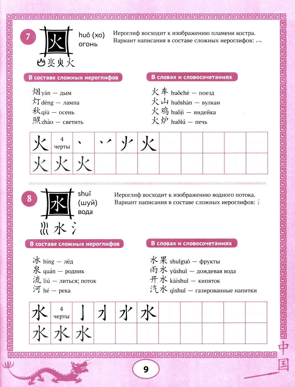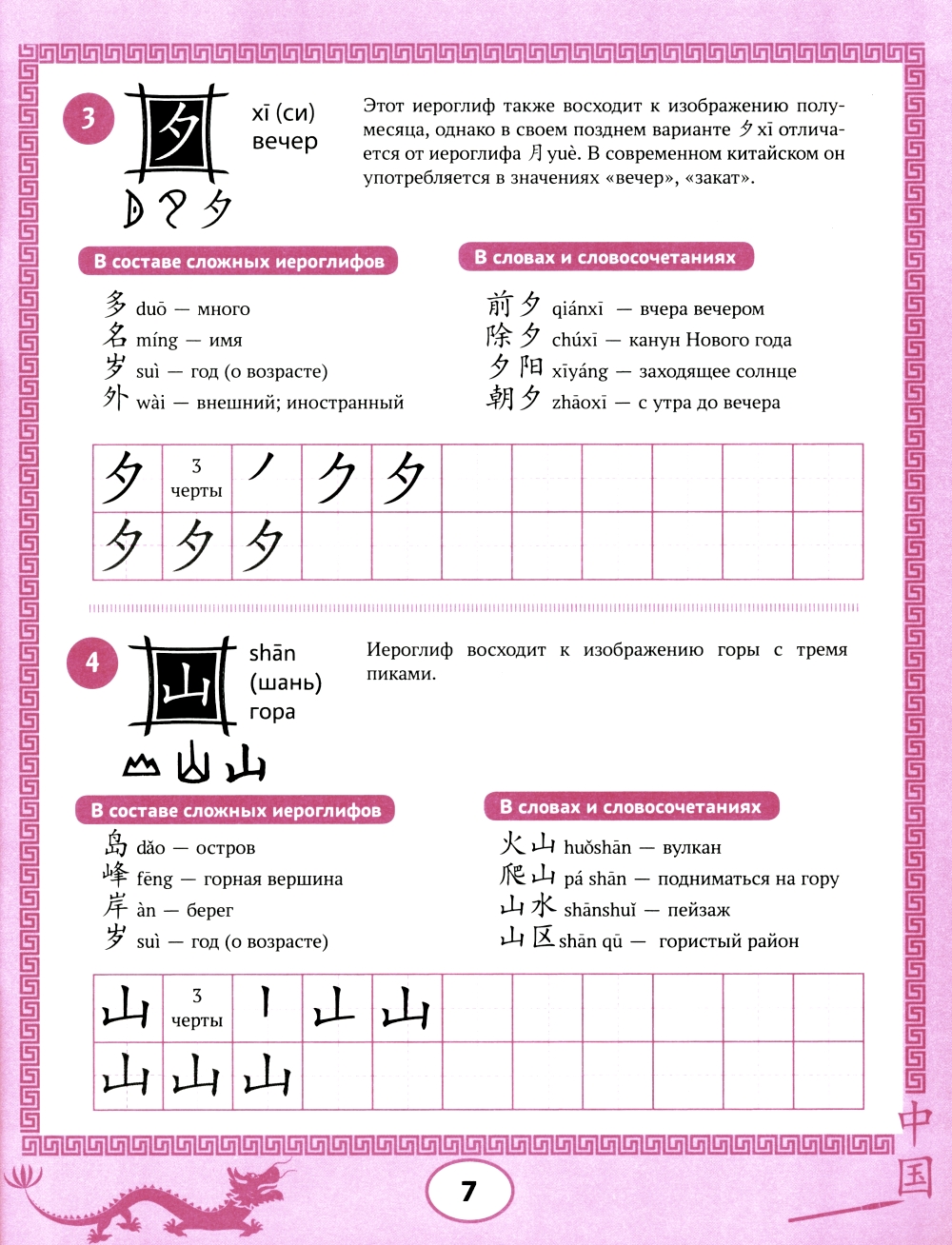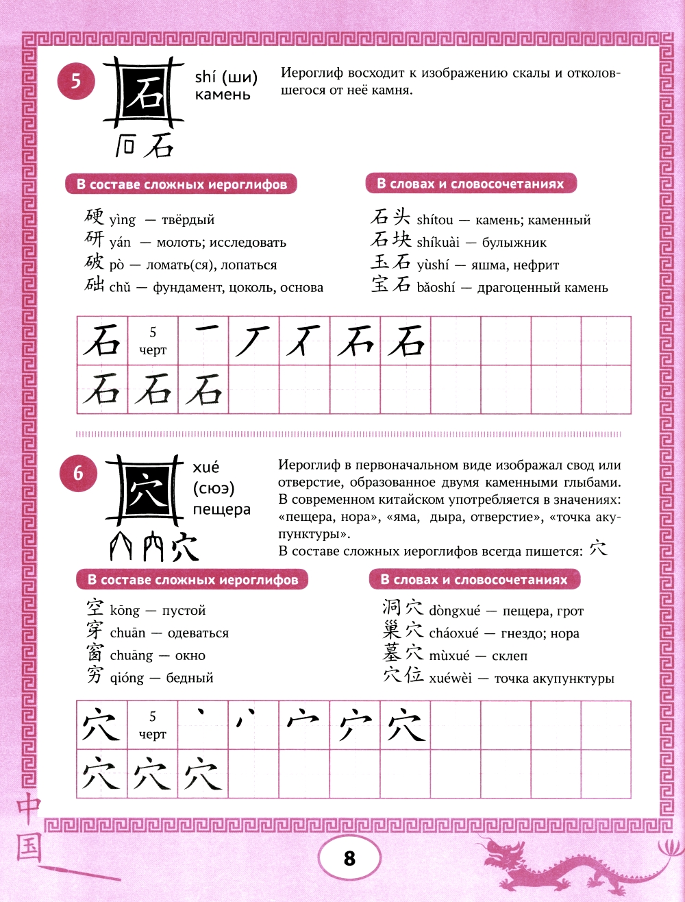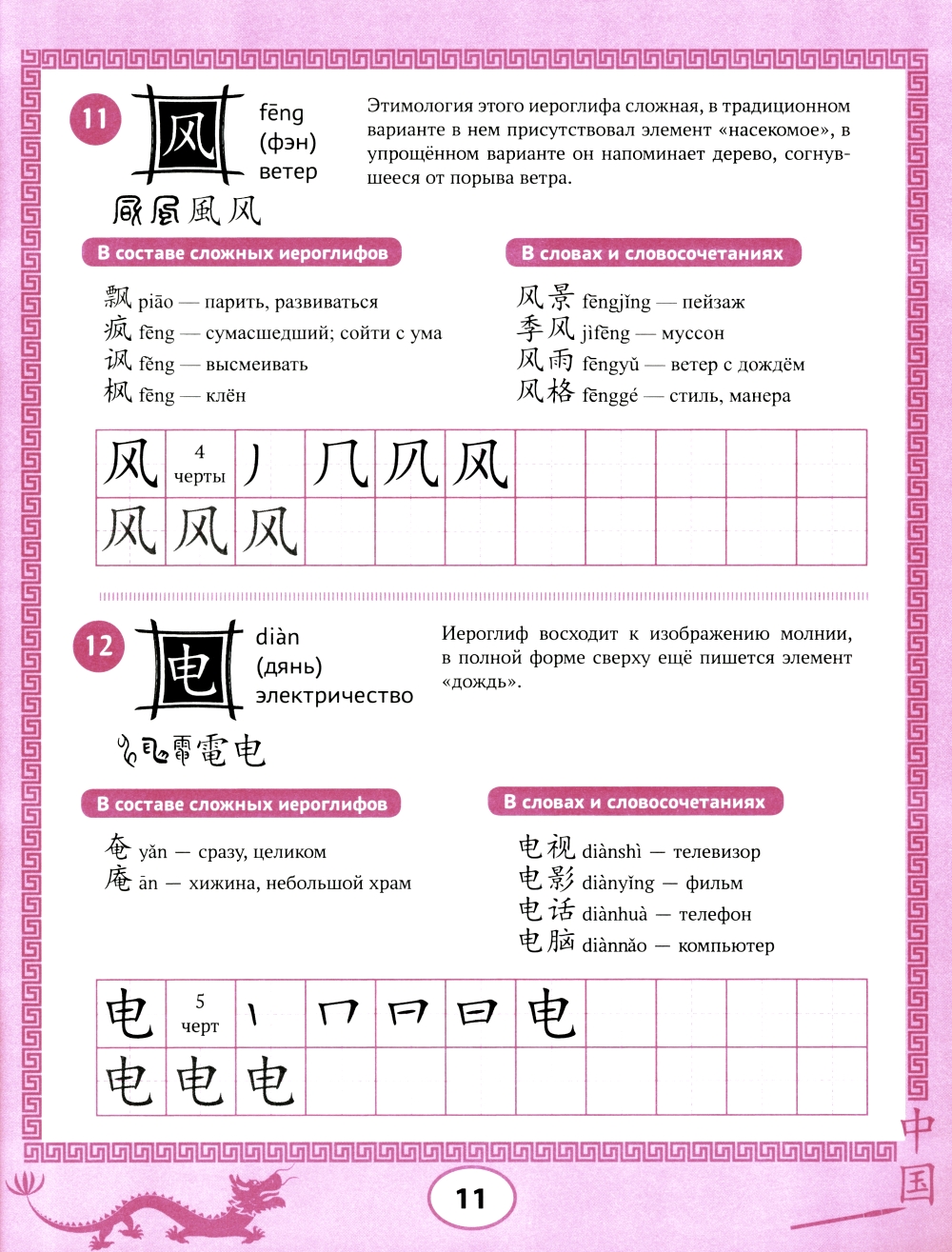 В настоящее время всё больше людей начинают интересоваться китайским языком, однако многих пугает китайская иероглифическая письменность, ведь она сильно отличается от привычной нам алфавитной: в современном китайском языке используется около 5 000.иероглифов. Как их запомнить? Иероглифы делятся на простые и сложные, простых всего около 300, а всё остальное множество сложных иероглифов представляет собой комбинации из простых элементов, которые восходят к пиктографическим изображениям объектов, которые они обозначают. В сборнике представлены 100 базовых простых иероглифов, разделённых на тематические группы. Помимо прописей здесь вы найдёте подробную этимологию каждого иероглифа, список наиболее часто употребляемых иероглифов, компонентами которых они являются, а также перечень слов и словосочетаний с ними, что даст представление о логике китайской письменности. Пусть эти иероглифы станут вашей отправной точкой в изучении китайского языка!