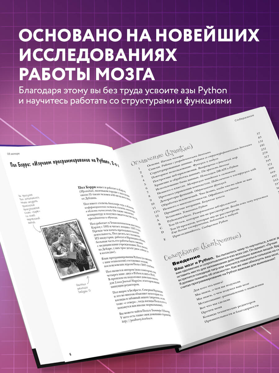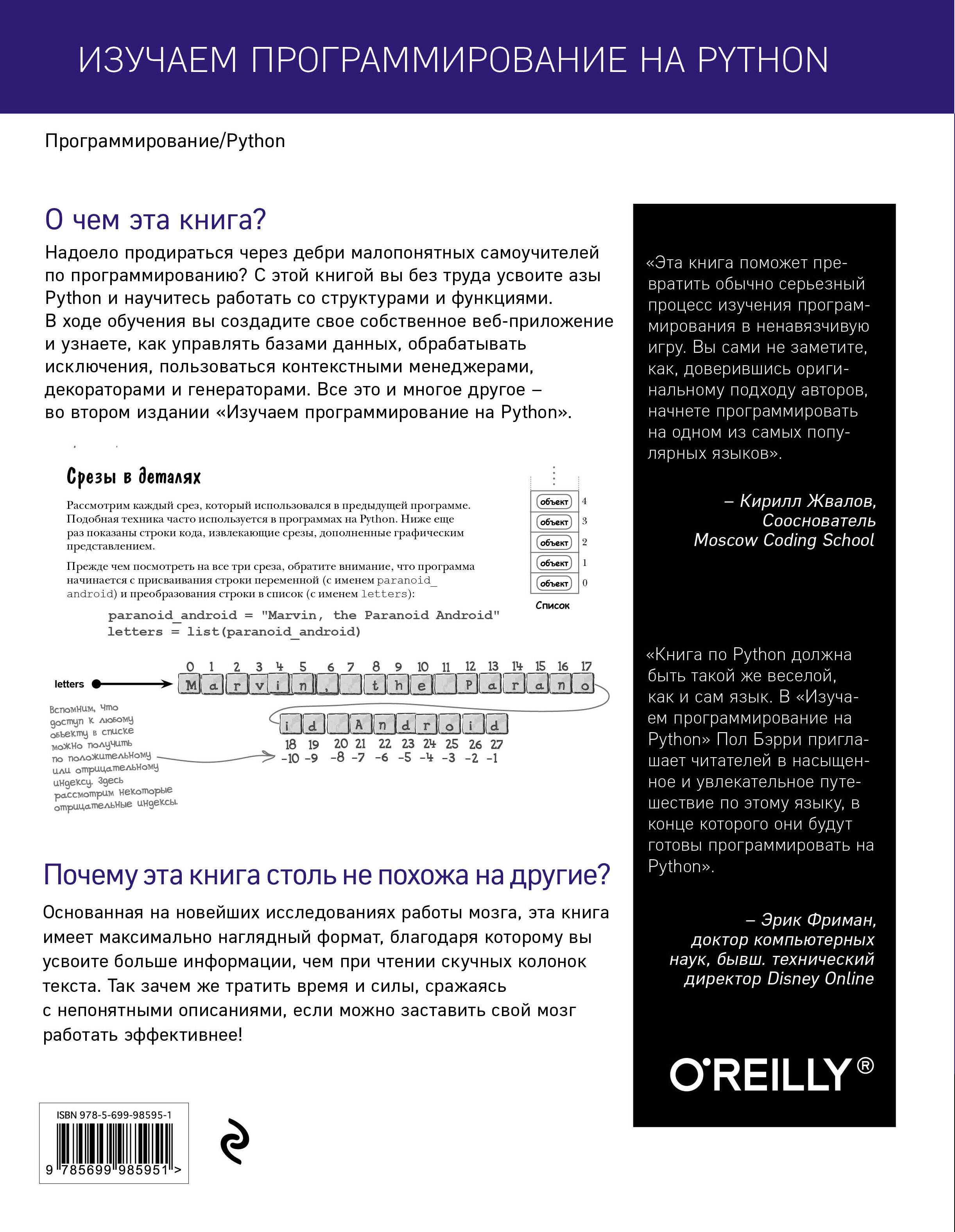 Надоело продираться через дебри малопонятных самоучителей по программированию? С этой книгой вы без труда усвоите азы Python и научитесь работать со структурами и функциями. В ходе обучения вы создадите свое собственное веб-приложение и узнаете, как управлять базами данных, обрабатывать исключения, пользоваться контекстными менеджерами, декораторами и генераторами. Все это и многое другое - во втором издании книги «Изучаем программирование на Python». Почему эта книга не похожа на другие? Основанная на новейших исследованиях работы мозга, эта книга имеет максимально наглядный формат, благодаря которому вы усвоите больше информации, чем при чтении скучных колонок текста. Так зачем же тратить время и силы, сражаясь с непонятными описаниями, если можно заставить свой мозг работать эффективнее! Все, что нужно знать о Python: Не мучайся - используй DB-API. Создавай веб-приложения с Flask. Строй списки, словари, кортежи и множества. Объекты? Декораторы? Генераторы? Они все здесь. Записывай код при помощи модулей.