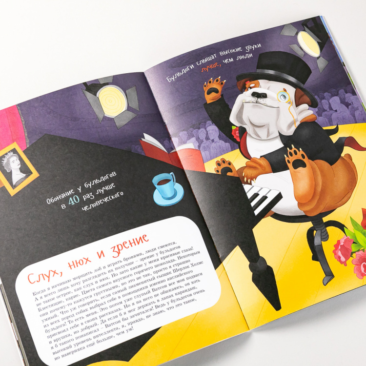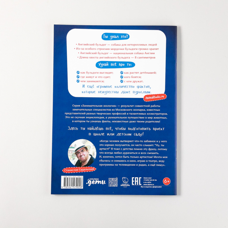 <div class="b-post-content _bookPage"><h2 id="o-chem">О чем</h2><p>Настало время познакомиться с настоящим английским джентльменом - вежливым, скромным, честным и храбрым! Да-да, английский бульдог - это пёс-джентльмен: благородный и преданный своему хозяину. И хотя он кажется серьёзным и суровым, на самом-то деле бульдоги - добрые и ласковые. В этой книжке английский бульдог расскажет тебе о том, что он любит, а что не очень, как о нём заботиться и во что играть. А ещё он поделится с тобой своей тайной бульдожьей мечтой...</p><div class="i-cut"><div class="i-cut__inner"><div class="box _full _noExpand"><div class="b-post-video"><div class="b-post-video__src"><div class="embed-container"><iframe allowfullscreen="" src="https://www.youtube.com/embed/QyrNmoaQZzY"></iframe></div></div></div></div><h2 id="interesnye-fakty">Интересные факты</h2><p></p><ul><li>Английский бульдог - одна из первых описанных пород собак. </li><li>Бульдоги сначала обдумывают команду, а только потом её выполняют. </li><li>Обоняние у бульдогов в 40 раз лучше человеческого. </li><li>Английский бульдог может прыгнуть с места на 2 метра в высоту. </li><li>Если бульдогу нечем заняться, он может спать по 20 часов в сутки. </li><li>До 2 лет английские бульдоги весьма активны, а потом вырастают и становятся солидными. </li><li>Английские бульдоги любят кататься на скейтборде.</li></ul><p></p></div><div class="i-cut__action"><a class="i-cut__activator link-txt _caps-14 _gray _t-bold" data-cut-text-active="Свернуть" data-cut-text-default="Развернуть" href="#">Развернуть</a></div></div></div>| Издательство | Альпина |