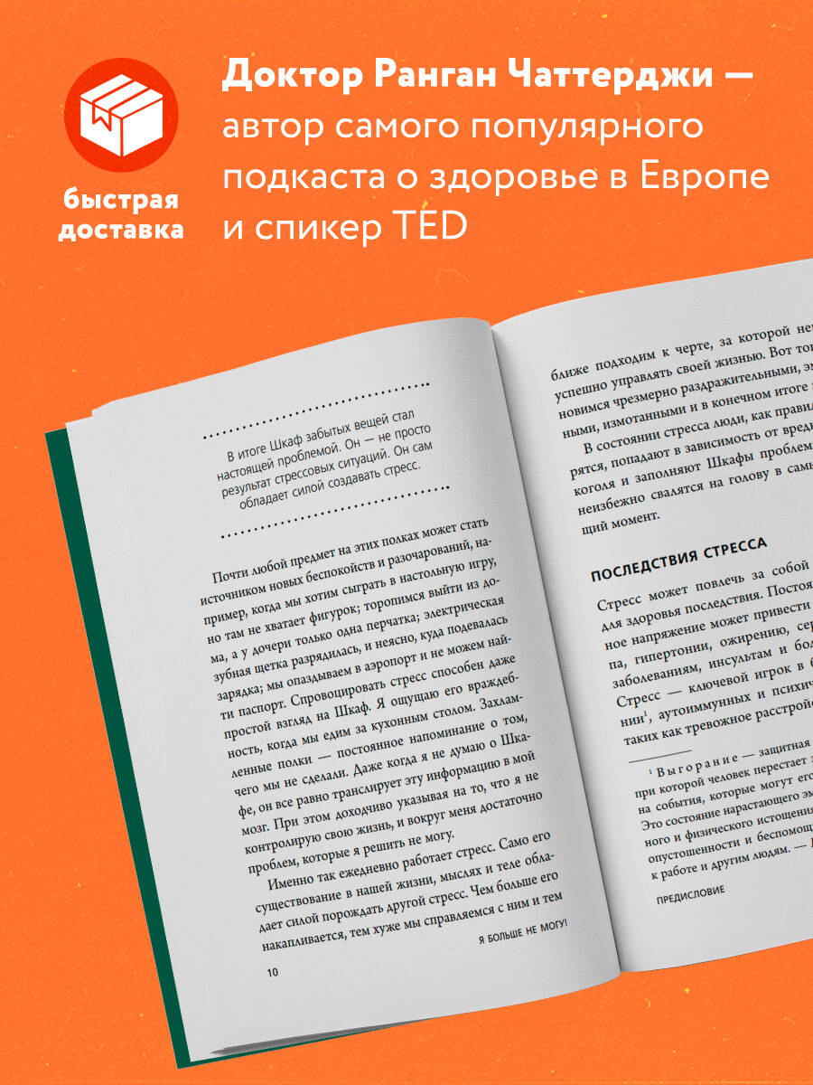 Большие города, высокие скорости, постоянный информационный шум… неудивительно, что около 70% людей, посещающих психолога, жалуются именно на стресс. Доктор Ранган Чаттерджи, автор самого популярного подкаста о здоровье в Европе и спикер TED, знает: чтобы справиться с нарастающим напряжением и эмоциональным выгоранием, не нужно уезжать подальше от цивилизации и избавляться от любых раздражителей. Нет, стресс - всего лишь реакция, которая возникает внутри и поддается корректировке. Поэтому, лишь немного изменив подход к своему телу, сознанию, отношениям и целям, мы с удивлением обнаружим, как прекрасен мир вокруг нас и как мало вещей, на которые на самом деле стоит тратить свои нервы. Из этой книги вы узнаете: - Как правильно планировать время, чтобы жить спокойнее. - Как отделять свои цели от навязанных и следовать им, несмотря ни на что. - Какие прикосновения снимают стресс. - Как абстрагироваться от внешних обстоятельств и сфокусироваться на партнере. - Какие именно продукты влияют на наше психологическое благополучие. - Как вернуть самообладание всего за 2 минуты.| Издательство | ООО "Издательство "Эксмо" |
