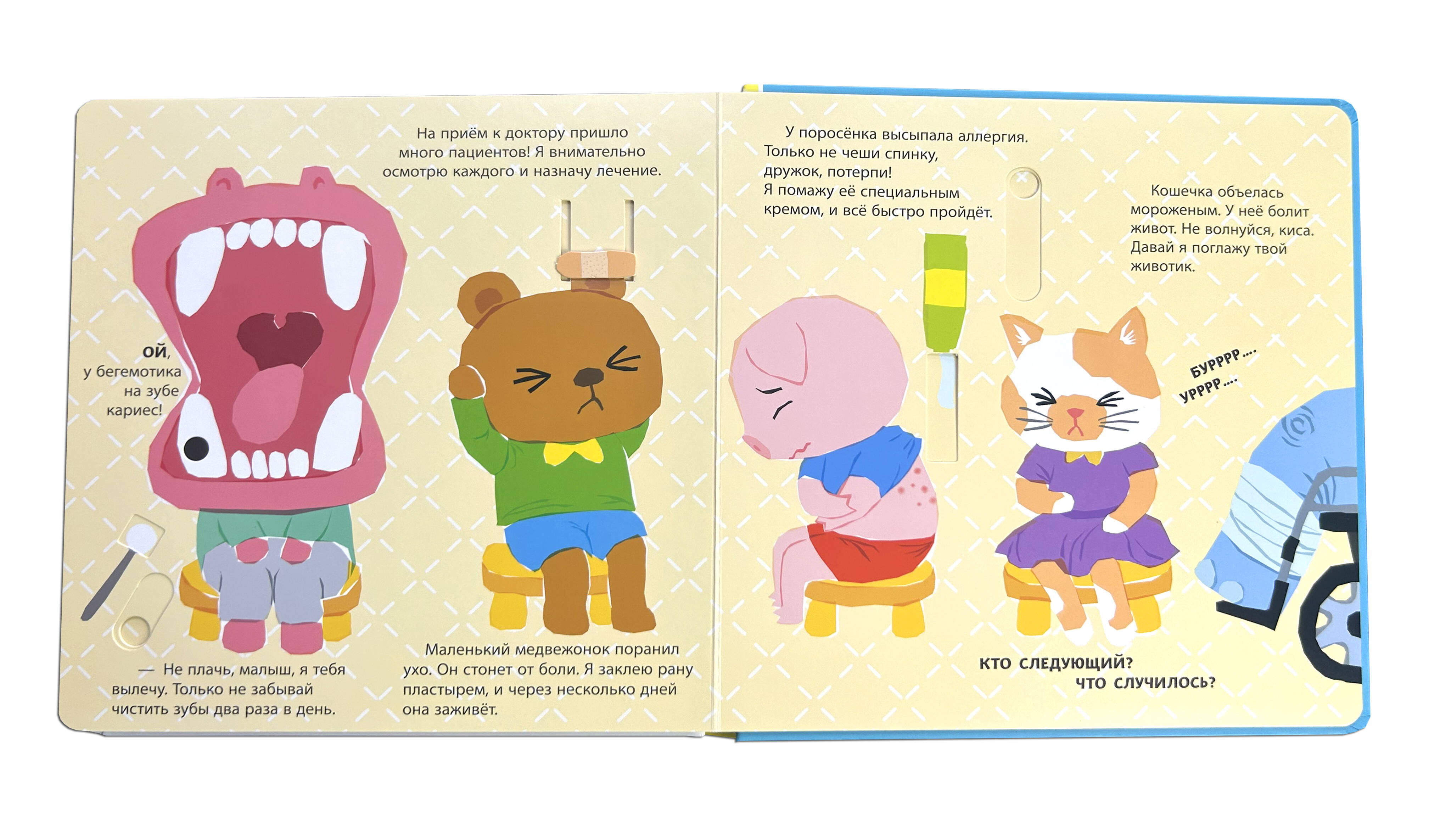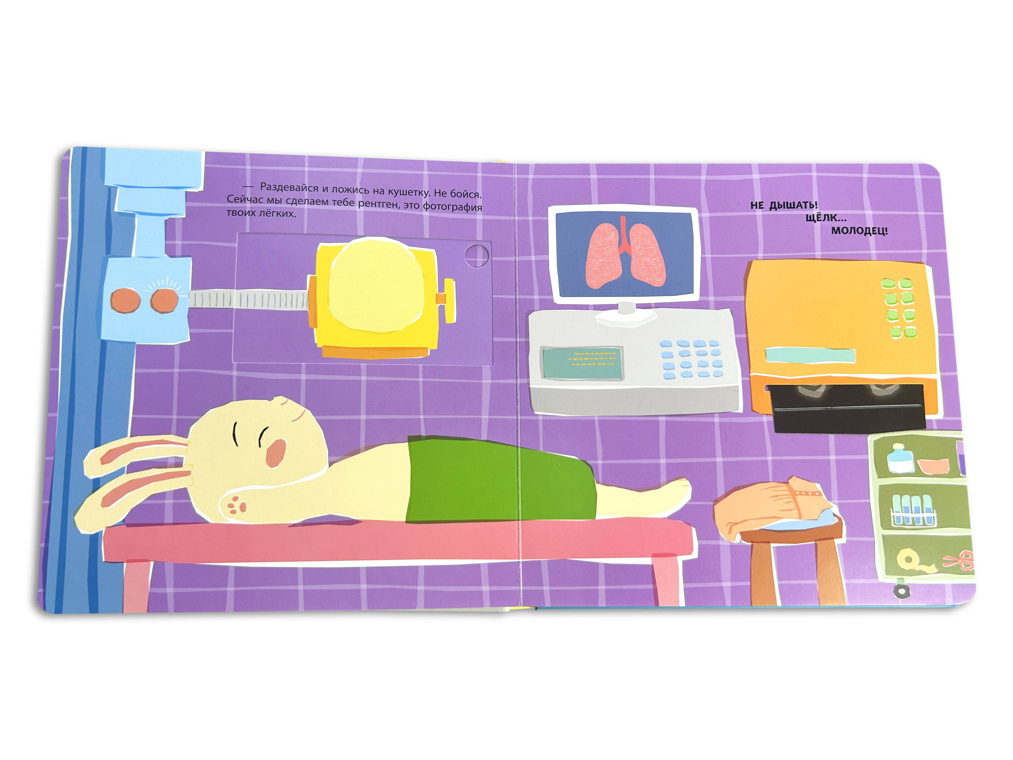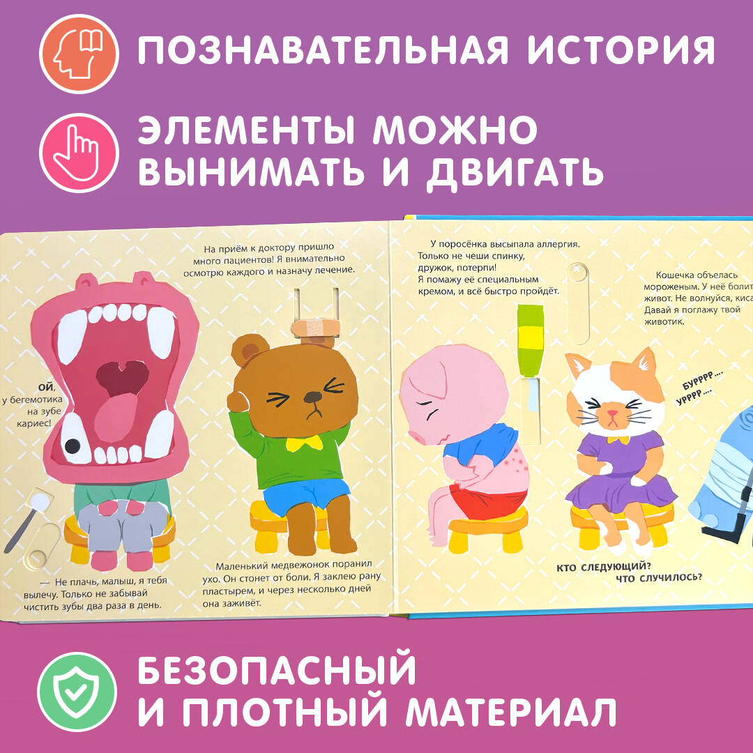26 интерактивных элементов в одной книге-развивашке! Пазлы, клапаны, задвижки, которые можно двигать, крутить, вынимать из книжки. Только безопасные материалы, без звукового модуля и батареек. Играем в доктора! Невероятно увлекательная 3D-книга для детей - на каждом развороте расположены интерактивные элементы, которые выглядят и работают как настоящие медицинские инструменты. Хочешь лечить зверят, как настоящий доктор? Тогда открывай книжку-игрушку, бери разложенные на страничках медицинские инструменты и принимайся за дело! Маленький зайчик заболел. Измерь ему температуру, сделай укол, рентген и ингаляцию, напои лекарством и уложи малыша спать. Все необходимые процедуры ты сможешь выполнить прямо в этой книжке, благодаря подвижным элементам! Похоже, зайчик уже идёт на поправку. Но на последней страничке тебя ждут новые пациенты. Что случилось? Кто следующий? Данная развивающая книга отлично подходит для детей 3-4 лет. Интерактивные элементы помогают в развитии мелкой моторики. Познаём мир вместе!