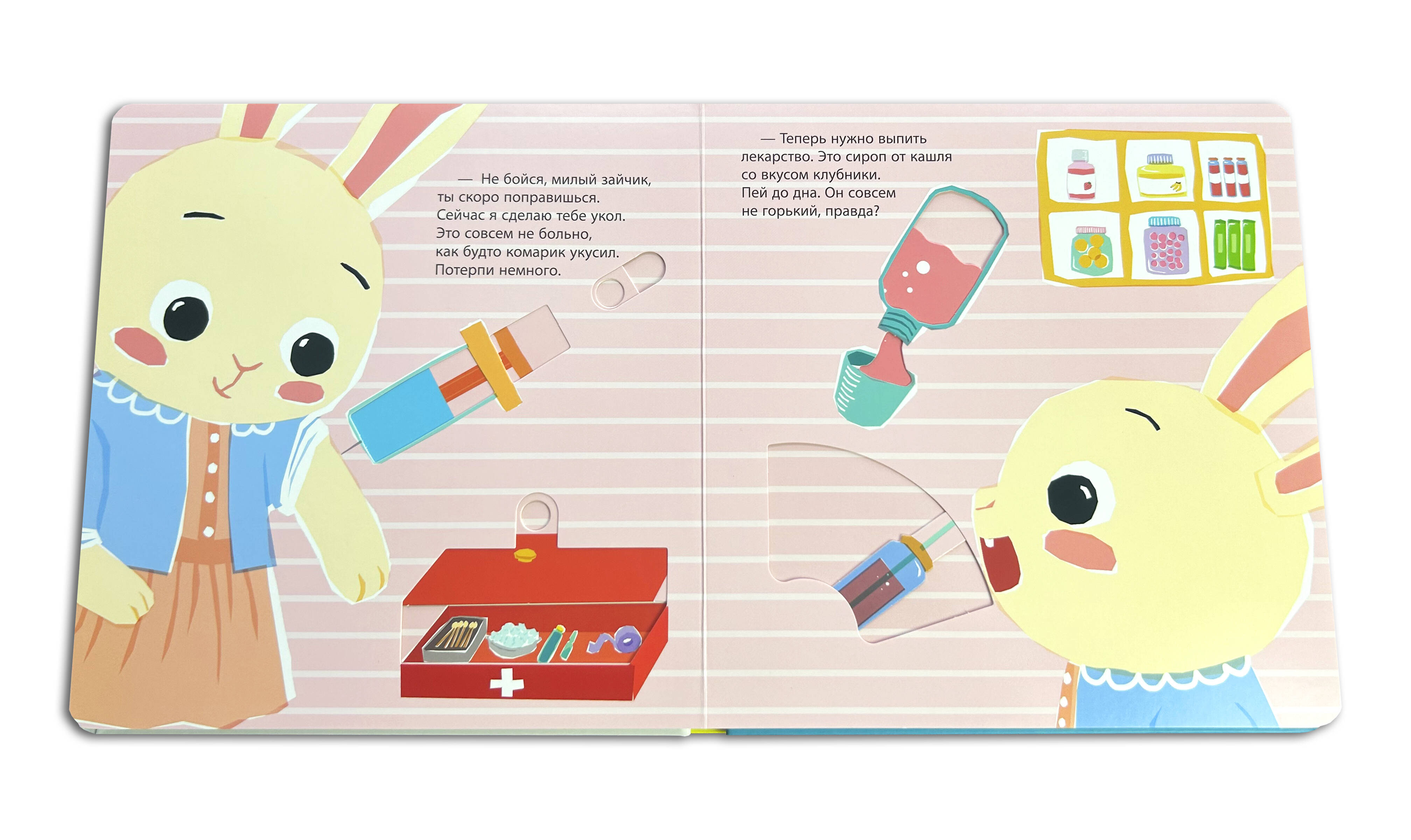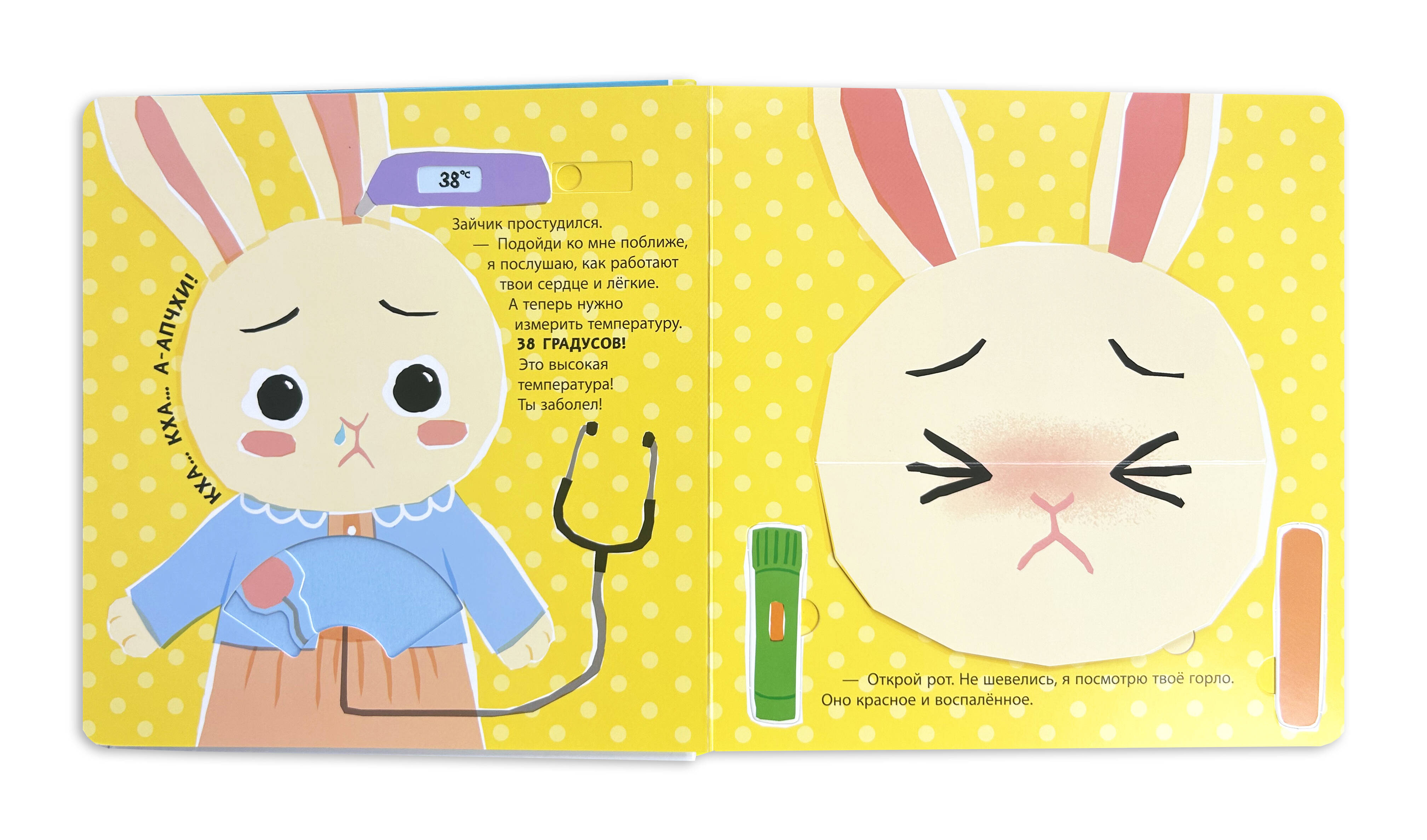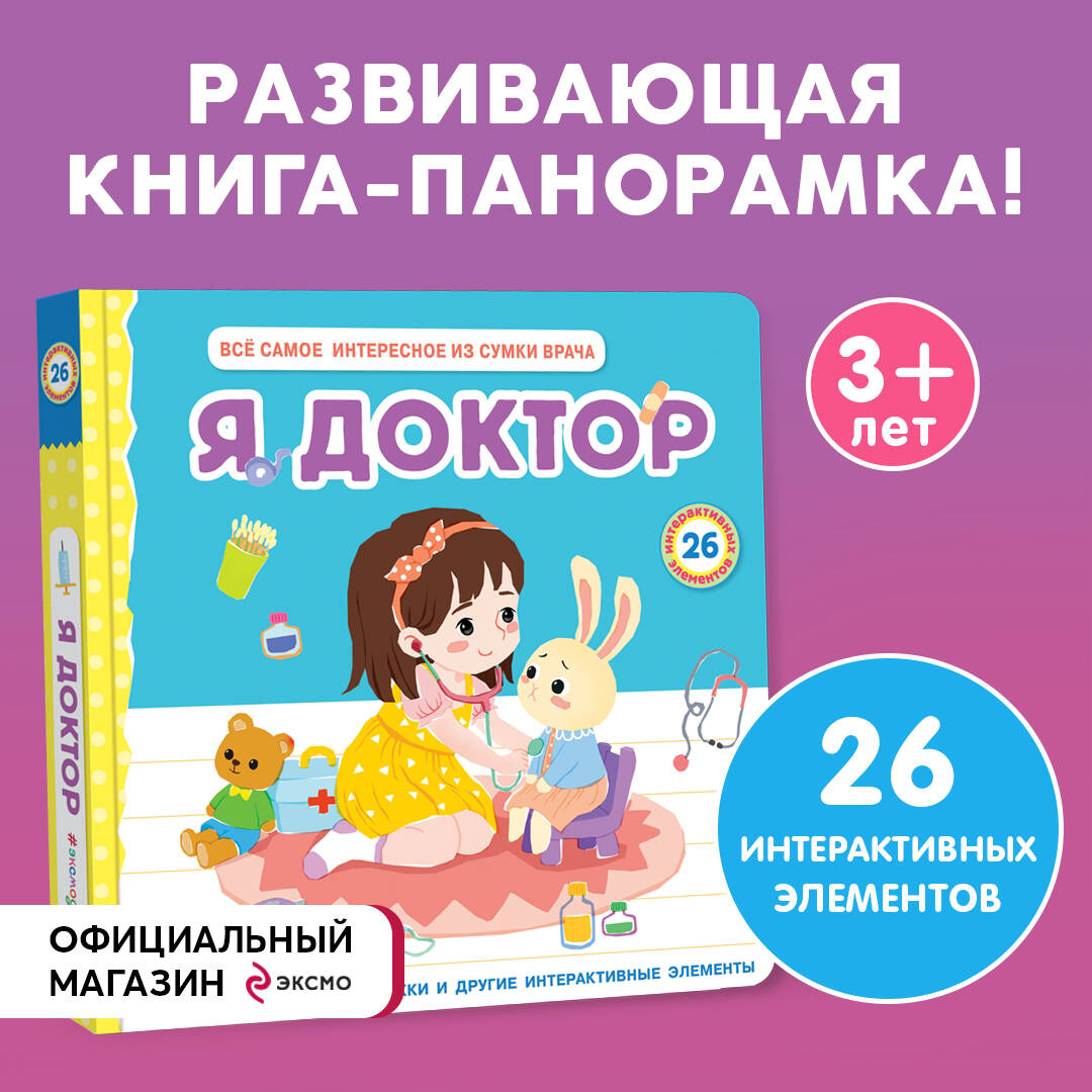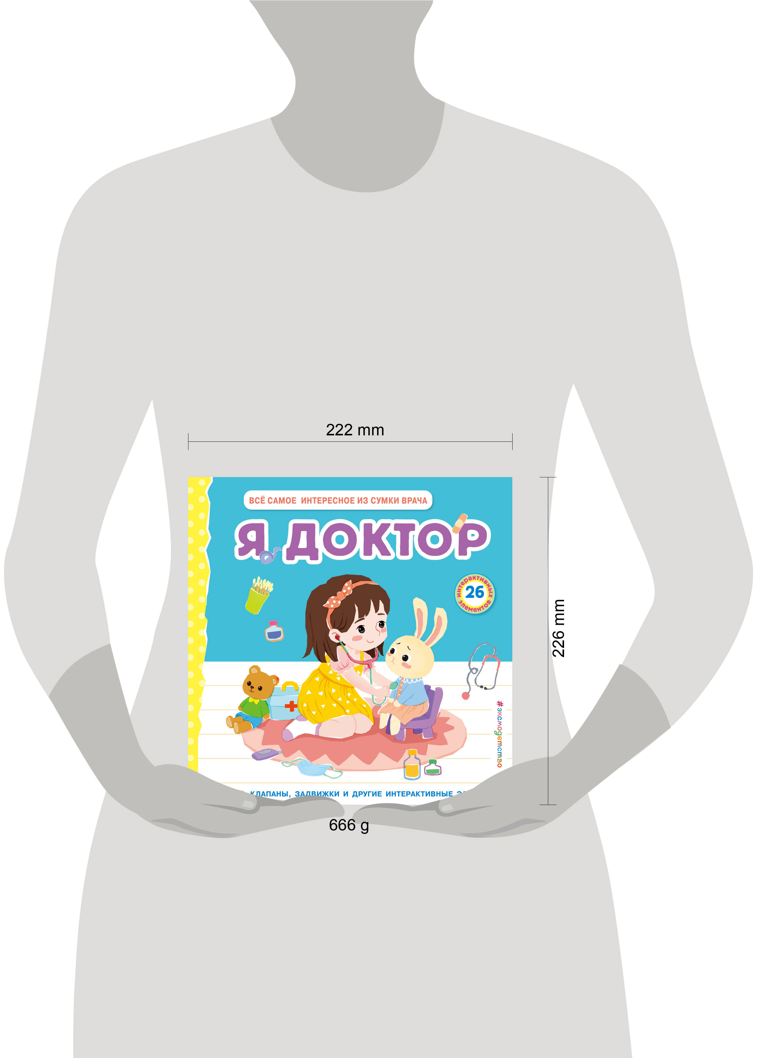 26 интерактивных элементов в одной книге-развивашке! Пазлы, клапаны, задвижки, которые можно двигать, крутить, вынимать из книжки. Только безопасные материалы, без звукового модуля и батареек. Играем в доктора! Невероятно увлекательная 3D-книга для детей - на каждом развороте расположены интерактивные элементы, которые выглядят и работают как настоящие медицинские инструменты. Хочешь лечить зверят, как настоящий доктор? Тогда открывай книжку-игрушку, бери разложенные на страничках медицинские инструменты и принимайся за дело! Маленький зайчик заболел. Измерь ему температуру, сделай укол, рентген и ингаляцию, напои лекарством и уложи малыша спать. Все необходимые процедуры ты сможешь выполнить прямо в этой книжке, благодаря подвижным элементам! Похоже, зайчик уже идёт на поправку. Но на последней страничке тебя ждут новые пациенты. Что случилось? Кто следующий? Данная развивающая книга отлично подходит для детей 3-4 лет. Интерактивные элементы помогают в развитии мелкой моторики. Познаём мир вместе!