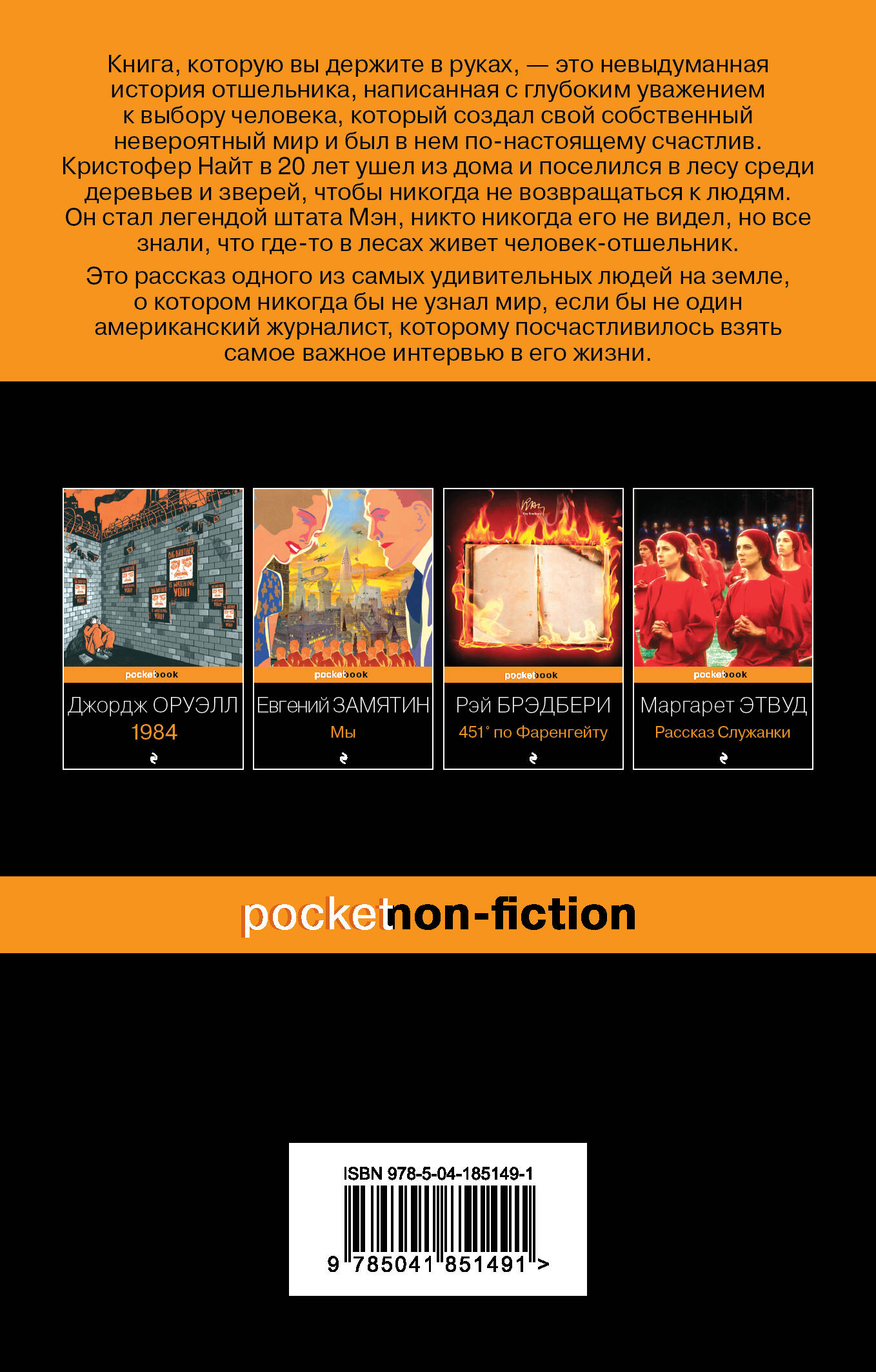 Бестселлер, который разошелся тиражом в 27 000 экземпляров! Книга, которую вы держите в руках, это невыдуманная история настоящего отшельника, написанная с глубоким уважением к выбору человека, который создал свой собственный невероятный мир и был в нем по-настоящему счастлив. Это рассказ одного из самых удивительных людей на земле, о котором никогда бы не узнал мир, если бы не один американский журналист, которому посчастливилось взять самое важное интервью в его жизни. Кристофер Найт в 20 лет ушел из дома и поселился в лесу среди деревьев и зверей, чтобы никогда не возвращаться к людям. 27 лет он жил один и обрастал своим собственным миром вне цивилизации. Он изобрел свою систему выживания: ни разу за десятки лет не разводил костра (дым от огня могут заметить, и тогда его найдут), научился виртуозно взламывать замки любой сложности, чтобы добыть себе пропитание в ближайших домах, воровал книги великих авторов и пластинки композиторов, чтобы проводить время только с лучшими из людей. Он стал легендой штата Мэн, никто никогда его не видел, но все знали, что где-то в лесах живет человек-отшельник. Когда Найта поймали, он рассказал свою историю только одному человеку на земле и никогда больше не давал интервью...| Издательство | ООО "Издательство "Эксмо" |