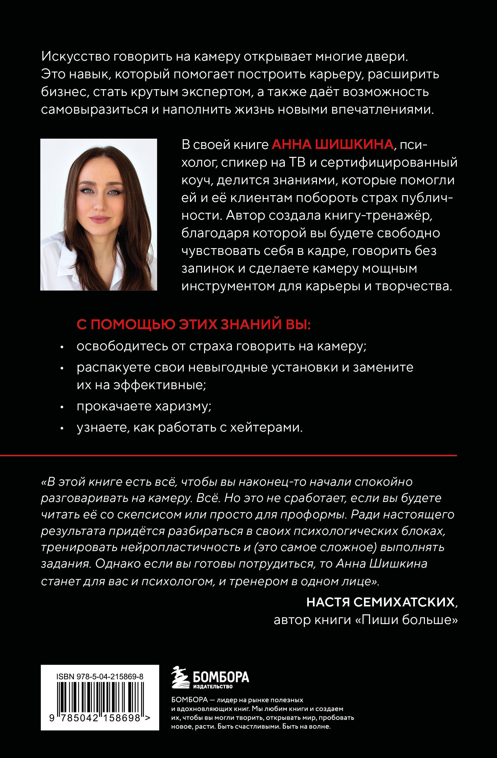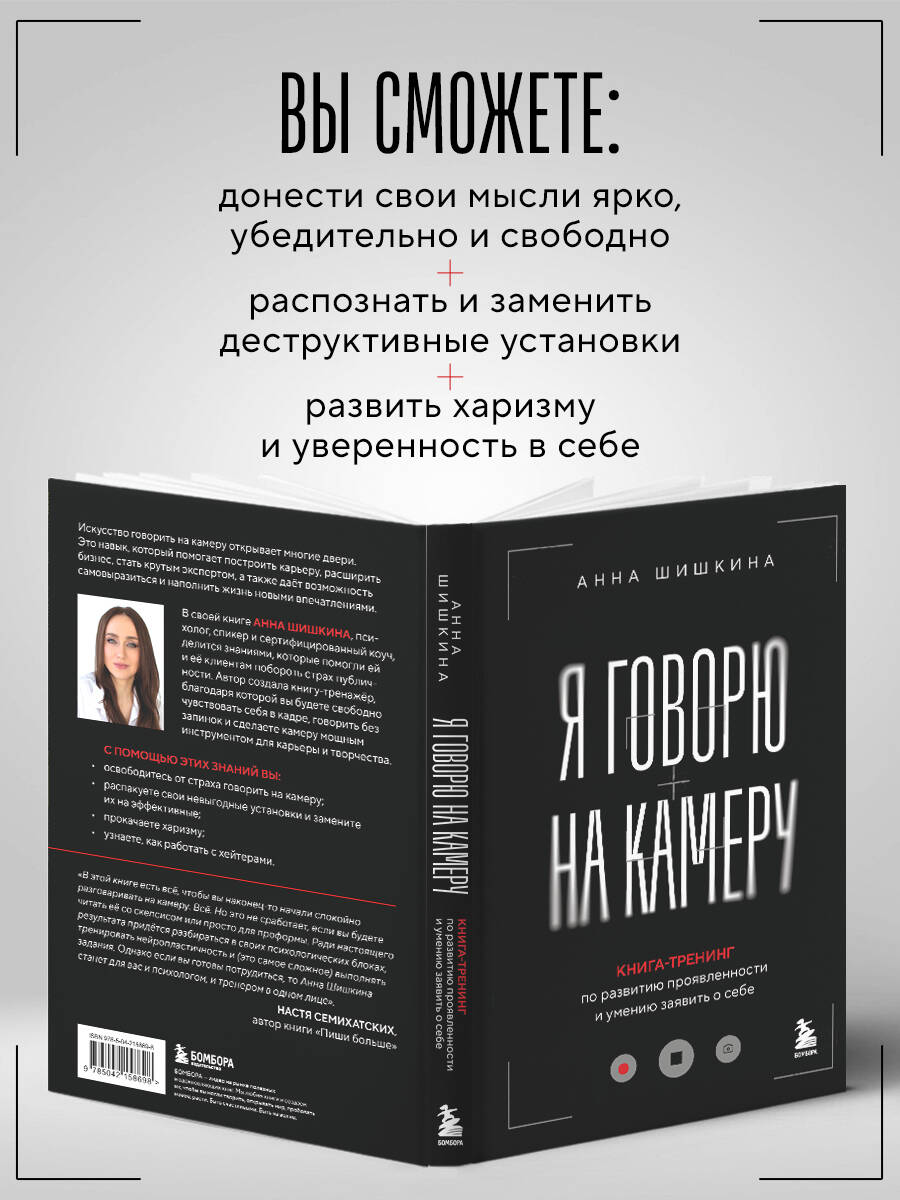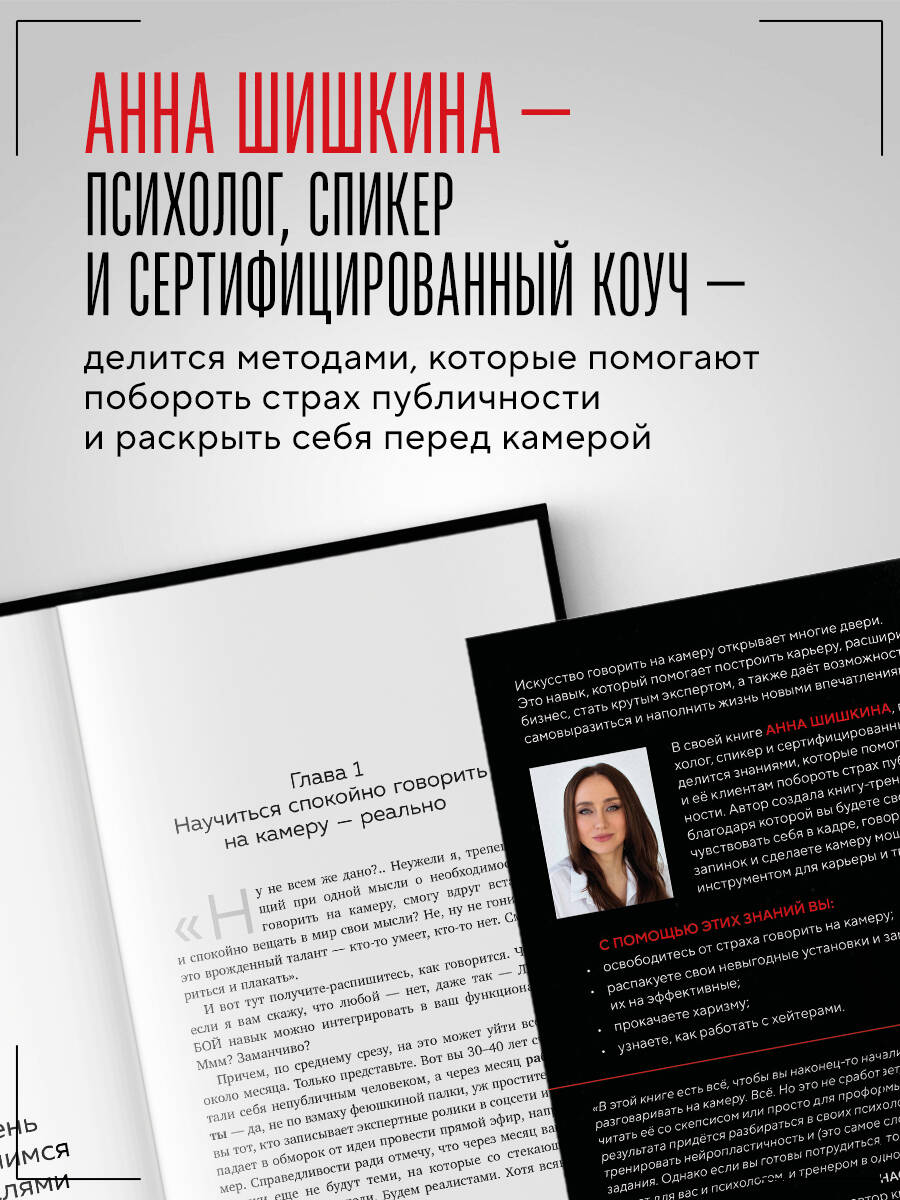 Искусство говорить на камеру открывает многие двери. Это навык, который помогает построить карьеру, расширить бизнес, стать крутым экспертом, а также дает возможность самовыразиться и наполнить жизнь новыми впечатлениями. В своей книге Анна Шишкина, психолог, спикер на ТВ и сертифицированный коуч, делится знаниями, которые помогли ей и ее клиентам побороть страх публичности. Автор создала книгу-тренажёр, благодаря которому вы будете свободно чувствовать себя в кадре, говорить без запинок и сделаете камеру мощным инструментом для карьеры и творчества. С помощью этих знаний вы: - Освободитесь от страха говорить на камеру. - Распакуете свои невыгодные установки и замените их на эффективные. - Прокачаете харизму. - Узнаете, как работать с хейтерами. «В этой книге есть всё, чтобы вы наконец-то начали спокойно разговаривать на камеру. Всё. Но это не сработает, если вы будете читать её со скепсисом или просто для проформы. Ради настоящего результата придётся разбираться в своих психологических блоках, тренировать нейропластичность и (это самое сложное) выполнять задания. Однако если вы готовы потрудиться, то Анна Шишкина станет для вас и психологом, и тренером в одном лице. И ваши социальные сети начнут заполняться долгожданными видео с вами в главной роли. Удачи на этом непростом и волнительном пути!» - Настя Семихатских, автор книги «Пиши больше»| Издательство | ООО "Издательство "Эксмо" |