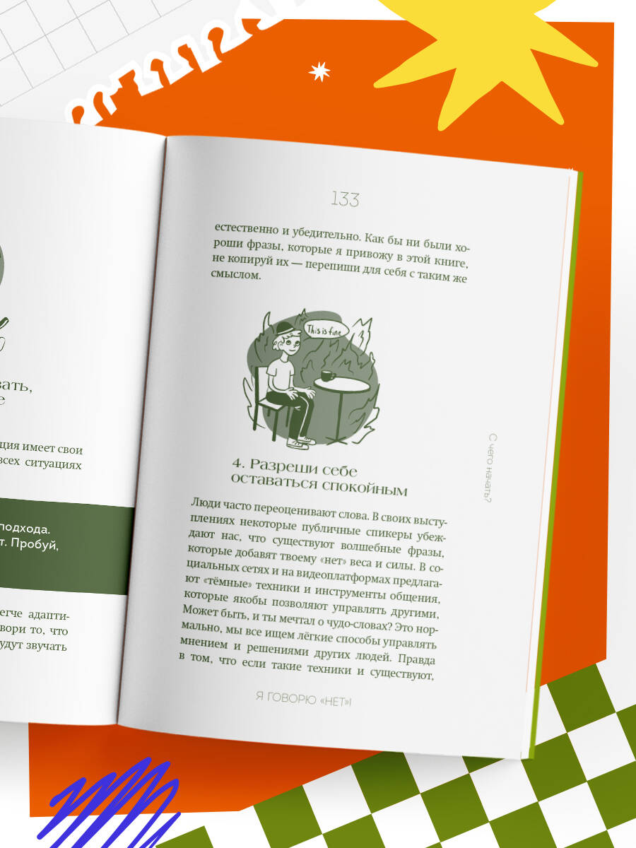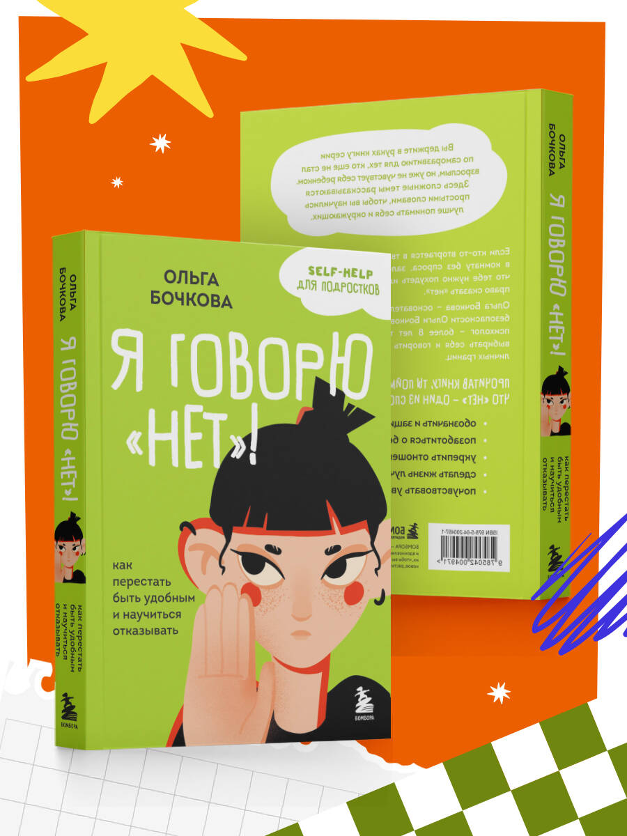 Self-help для подростков - серия книг по саморазвитию для тех, кто еще не стал взрослым, но уже не чувствует себя ребенком. Здесь сложные темы рассказывают простыми словами, чтобы каждый подросток научился лучше понимать себя и окружающих. Если кто-то вторгается в твое пространство - хочет зайти в твою комнату без спроса, залезть к тебе в телефон или сказать, что тебе нужно похудеть или поправиться, - ты имеешь право сказать «нет». Ольга Бочкова - семейный психолог, игровой терапевт, педагог - объяснит, что в большинстве случаев у тебя есть выбор. Ты сам решаешь, что для тебя приемлемо, а что нет. Нарушение личного пространства можно легко спутать с шуткой или «полезным» советом. Не стоит вестись даже на фразы «Да это же шутка», «Мы просто по приколу». Важно, как реагируешь на это ты и твое тело. Если хочешь брать контроль в свои руки, важно учиться говорить волшебное слово «нет». Прочитав книгу, ты поймешь, что «нет» - один из способов: - обозначить и защитить свои личные границы; - укрепить отношения с собой и другими; - сделать жизнь лучше, понятнее, спокойнее; - почувствовать уверенность и силу. ЦИТАТЫ: Ты поймешь, что говорить нет - не значит отказаться от всех возможностей. Люди гораздо лучше нас слышат и понимают и с большей охотой соблюдают наши границы, когда мы прямо, спокойно и уверенно говорим об этом. Если услышишь «нет» от своего друга, возьми себя в руки. Не уговаривай, а ответь: «Ну ладно». Важно знать, что доставляет тебе удовольствие, а что забирает силы и настроение. Чем лучше ты знаешь, чего ты хочешь, а что тебе не подходит, тем спокойнее можешь соглашаться или, наоборот, отметать лишнее, невзирая на неодобрение близких.| Издательство | ООО "Издательство "Эксмо" |