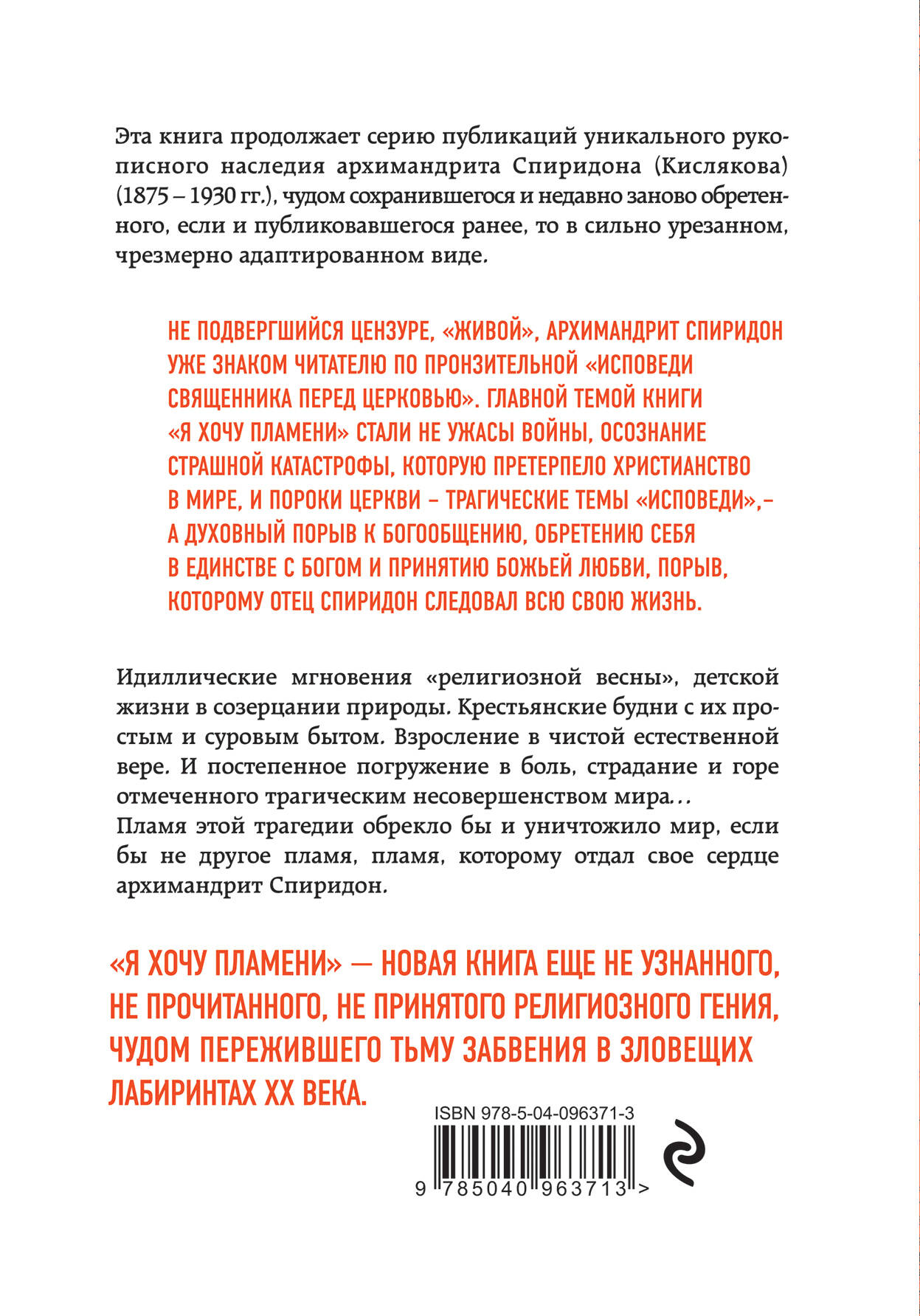 Уникальное рукописное наследие архимандрита Спиридона (Кислякова), чудом сохранившееся и теперь выпускающееся полностью, без цензуры, теперь в новой, отдельной, серии, в которую включена и ранее вышедшая «Исповедь священника перед Церковью». «Я хочу пламени» - новая книга еще не узнанного, не прочитанного, не принятого, религиозного гения, чудом пережившего тьму забвения в зловещих лабиринтах ХХ века.| Издательство | ООО "Издательство "Эксмо" |