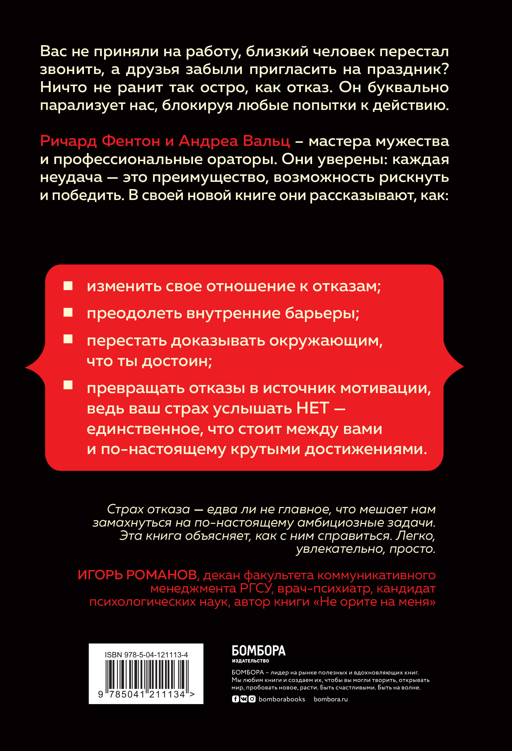 Вас не приняли на работу, близкий человек перестал звонить, а друзья забыли пригласить на праздник? Ничто не ранит так остро, как отказ. Он буквально парализует нас, блокируя любые попытки к действию. Ричард Фентон и Андреа Вальц - мастера мужества и профессиональные ораторы. Они уверены: каждая неудача - это преимущество, возможность рискнуть и победить. В своей новой книге они рассказывают, как: · изменить свое отношение к отказам; · преодолеть внутренние барьеры; · перестать доказывать окружающим, что ты достоин; · превращать отказы в источник мотивации, ведь ваш страх услышать НЕТ - единственное, что стоит между вами и по-настоящему крутыми достижениями.| Издательство | ООО "Издательство "Эксмо" |