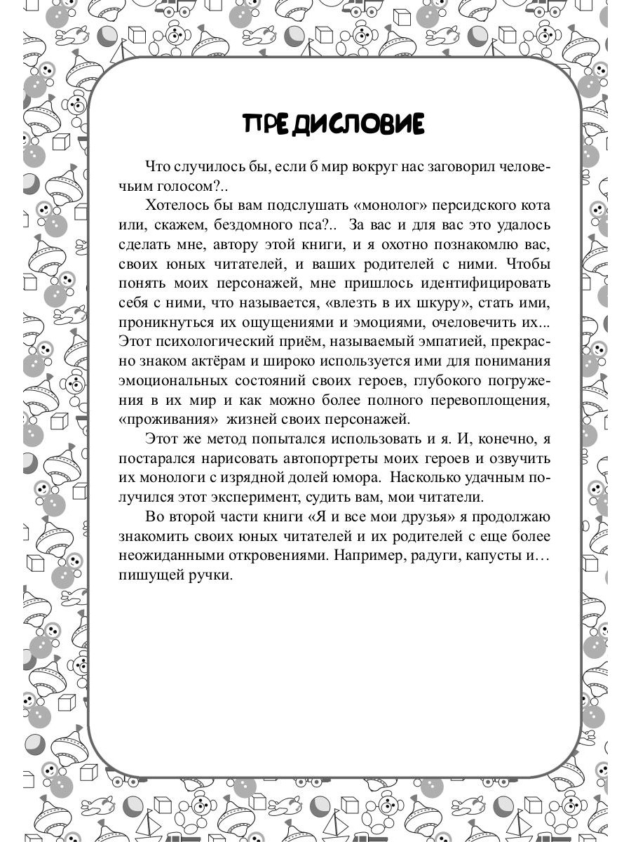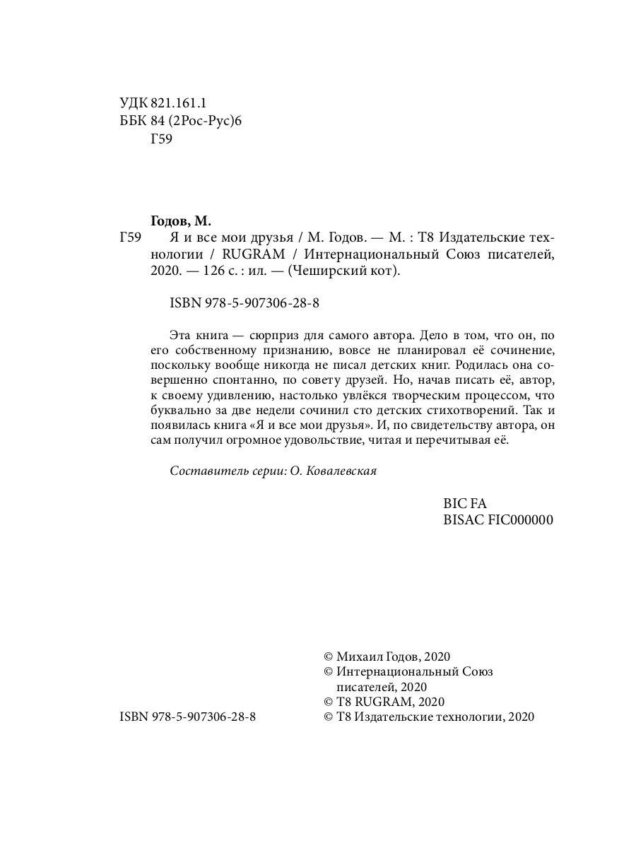 Эта книга - сюрприз для самого автора. Дело в том, что он, по его собственному признанию, вовсе не планировал её сочинение, поскольку вообще никогда не писал детских книг. Родилась она совершенно спонтанно, по совету друзей. Но, начав писать её, автор, к своему удивлению, настолько увлёкся творческим процессом, что буквально за две недели сочинил сто детских стихотворений. Так и появилась книга «Я и все мои друзья». И, по свидетельству автора, он сам получил огромное удовольствие, читая и перечитывая её.| Издательство | Т8 RUGRAM |