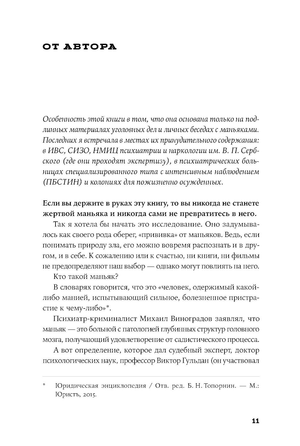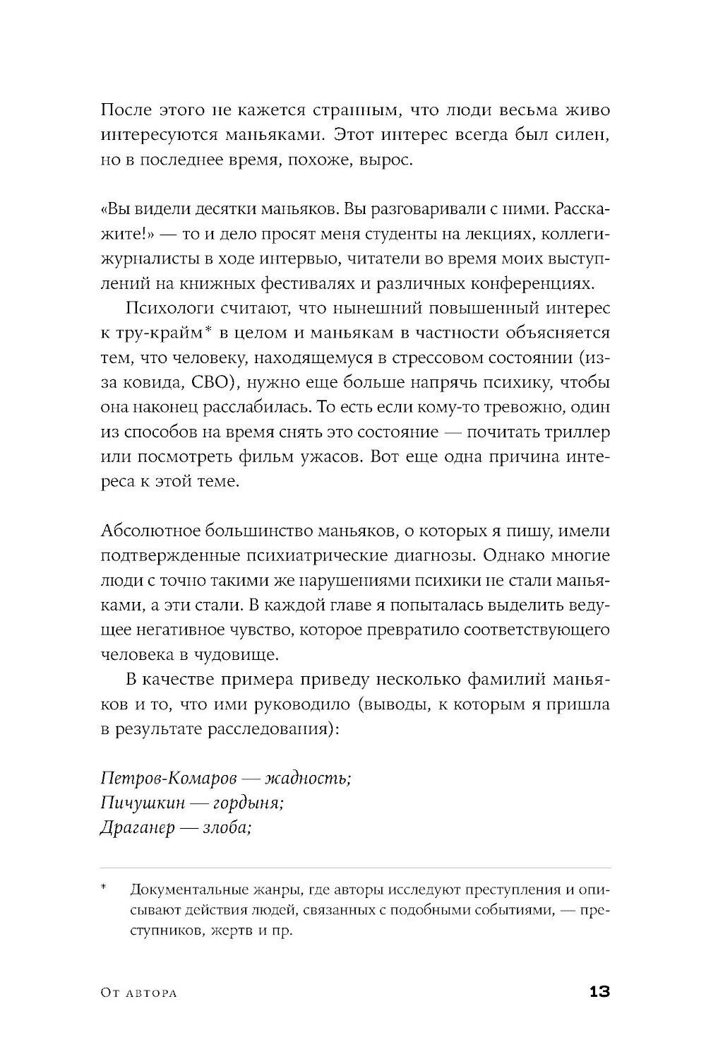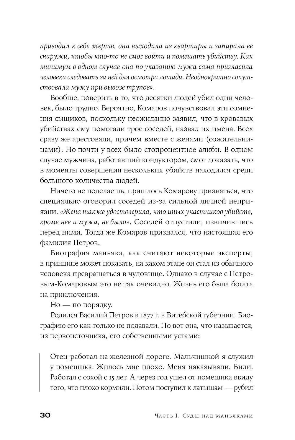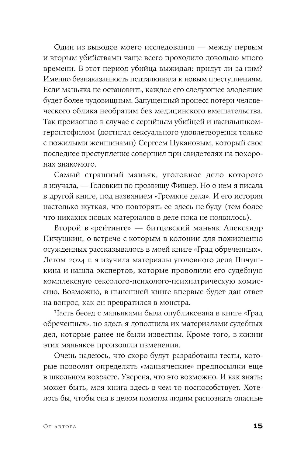 Новая книга известного российского журналиста и правозащитника Евы Меркачёвой посвящена серийным убийствам. Она - о российских маньяках. Исторический и архивный материал, уникальные иллюстрации, описание уголовных дел, действий маньяков и следствия, комментарии экспертов. Рассказывая максимально подробно страшные реальные истории, происходившие зачастую незаметно для большинства в нашей обыденной действительности, автор обстоятельно разбирается в том, откуда берутся маньяки, как их распознать, как предотвратить превращение человека в маньяка и как самому не стать жертвой злодеяния.| Издательство | Альпина Паблишер |