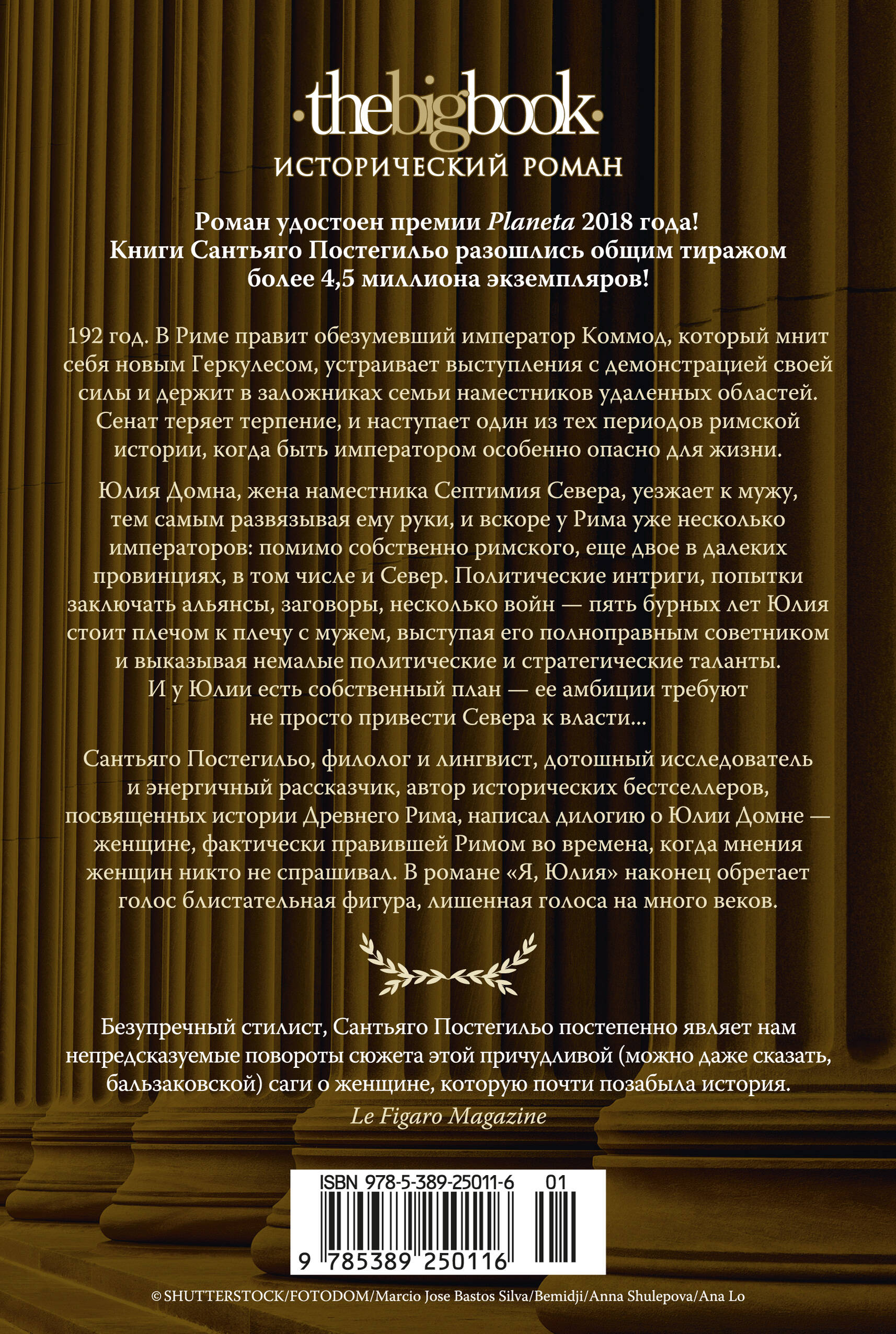 Впервые на русском - роман о римской императрице Юлии Домне от автора романов «Рим - это я» и «Рим, проклятый город» Сантьяго Постегильо, автора многочисленных бестселлеров, посвященных истории Древнего Рима. 192 год. В Риме правит обезумевший император Коммод, который мнит себя новым Геркулесом, устраивает показательные выступления с демонстрацией своей нечеловеческой силы и держит в заложниках семьи наместников удаленных областей. Сенат теряет остатки терпения, и наступает один из тех периодов римской истории, когда быть императором особенно опасно для жизни. После смерти Коммода Юлия Домна, жена наместника Септимия Севера, уезжает к мужу, тем самым развязывая ему руки, и вскоре у Рима оказывается несколько императоров: помимо собственно римского, еще двое в далеких провинциях, в том числе и Север. Политические интриги, попытки заключать альянсы, заговоры, несколько войн - пять бурных лет Юлия стоит плечом к плечу с мужем, выступая его полноправным советником и выказывая немалые политические и стратегические таланты. И у Юлии есть собственный план - ее амбиции требуют не просто привести Септимия Севера к власти... Сантьяго Постегильо, филолог и лингвист, дотошный исследователь и энергичный рассказчик, написал дилогию о Юлии Домне - женщине, фактически правившей Римом во времена, когда мнения женщин никто не спрашивал. В романе «Я, Юлия» наконец обретает голос блистательная фигура, лишенная голоса на много веков. Эта эффектная книга станет прекрасным подарком любому, кто то и дело думает о Римской империи, а также всем, кого интересуют эпизоды истории, которым традиционно достается меньше внимания.| Издательство | Издательство АЗБУКА ООО |