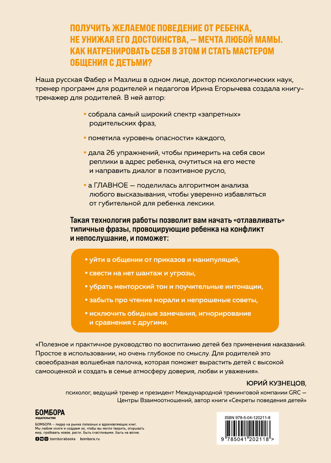 Почему ваши искренние желания, намерения и готовность действовать во благо ребенка приводят к совершенно иным результатам, чем вы ожидали? Бывает так, что он не хочет вас слушать и намеренно игнорирует просьбы, резко говорит в ответ. Вы не можете попросить его что-нибудь сделать и чувствуете, что ребенок подрывает ваш авторитет. Ирина Егорычева уверена, что дело в способах общения. Зачастую мы не отдаем себе отчет, какие слова используем и как воздействуем на своего ребенка. Эта книга - самоучитель-тренажер. В ней есть упражнения, которые помогут мамам и папам точно понять чувства ребенка и начать менять то, что вас не устраивает в отношениях с ним. Здесь вы найдете: - 26 упражнений, чтобы примерить на себя реплики в адрес ребенка и направить диалог в позитивное русло; - самый широкий спектр «запретных» родительских фраз; - эффективный алгоритм анализа любого высказывания, чтобы избавиться от губительных для ребенка фраз; - как уйти от приказов и манипуляций, исключить обидные замечания, игнорирование и сравнения с другими; - удобную рабочую тетрадь для самоанализа и фиксирования вашего прогресса. Ирина Егорычева - педагог, доктор психологических наук и профессор кафедры социальной психологии, практический психолог, тренер программ для родителей и педагогов, автор более 50 публикаций и нескольких диагностических методик. Русская Фабер и Мазлиш в одном лице.| Издательство | ООО "Издательство "Эксмо" |