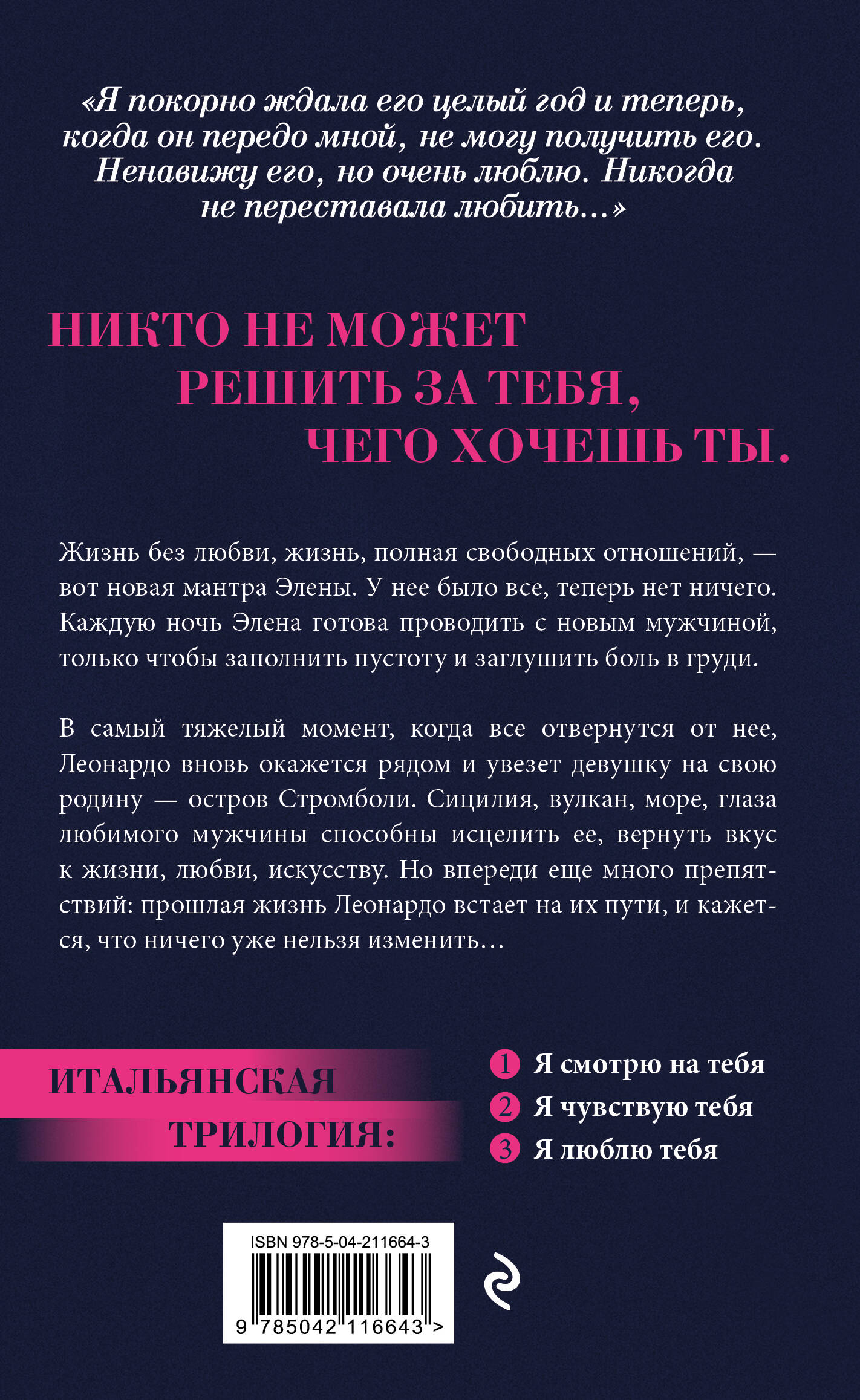«Я покорно ждала его целый год и теперь, когда он передо мной, не могу получить его. Ненавижу его, но очень люблю. Никогда не переставала любить…» Никто не может решить за тебя, чего хочешь ты. Жизнь без любви, жизнь, полная свободных отношений - вот новая мантра Элены. У нее было все, теперь нет ничего. Каждую ночь Элена готова проводить с новым мужчиной, только чтобы заполнить пустоту и заглушить боль в груди. В самый тяжелый момент, когда все отвернутся от нее, Леонардо вновь окажется рядом и увезет девушку на свою родину - остров Стромболи. Сицилия, вулкан, море, глаза любимого мужчины способны исцелить ее, вернуть вкус к жизни, любви, искусству. Но впереди еще много препятствий: прошлая жизнь Леонардо встает на их пути, и кажется, что ничего уже нельзя изменить… Итальянская трилогия: 1. «Я смотрю на тебя» 2. «Я чувствую тебя» 3. «Я люблю тебя»
