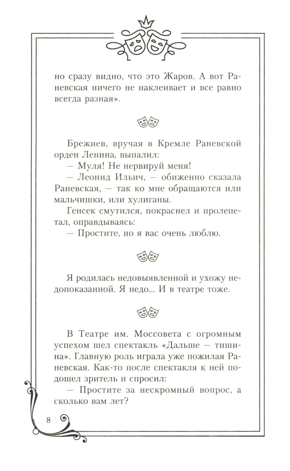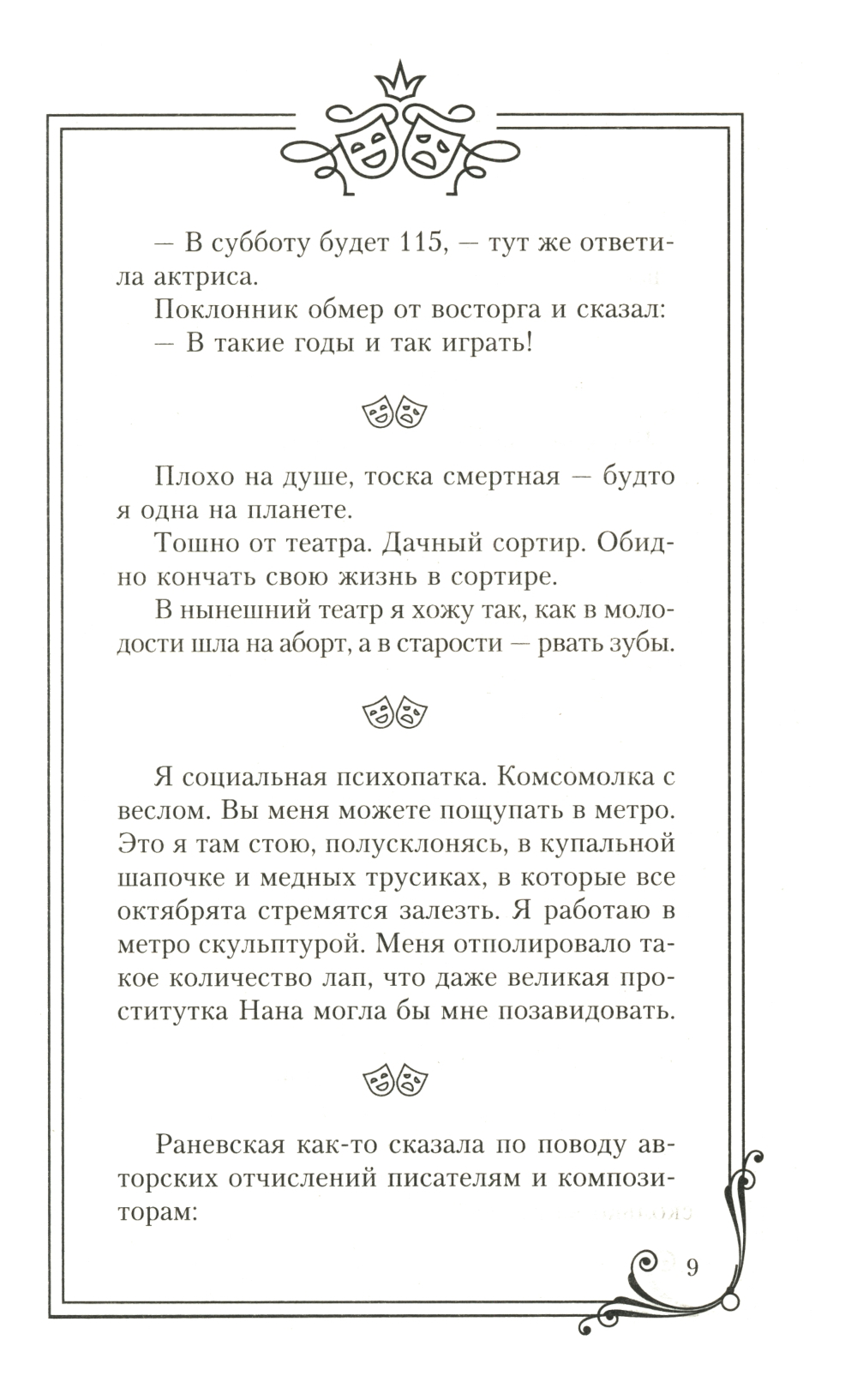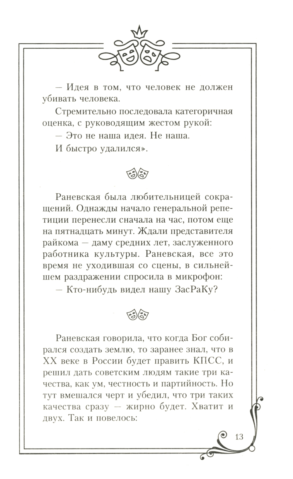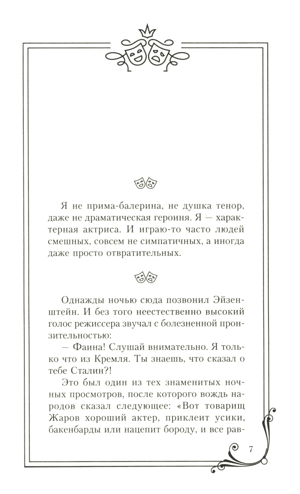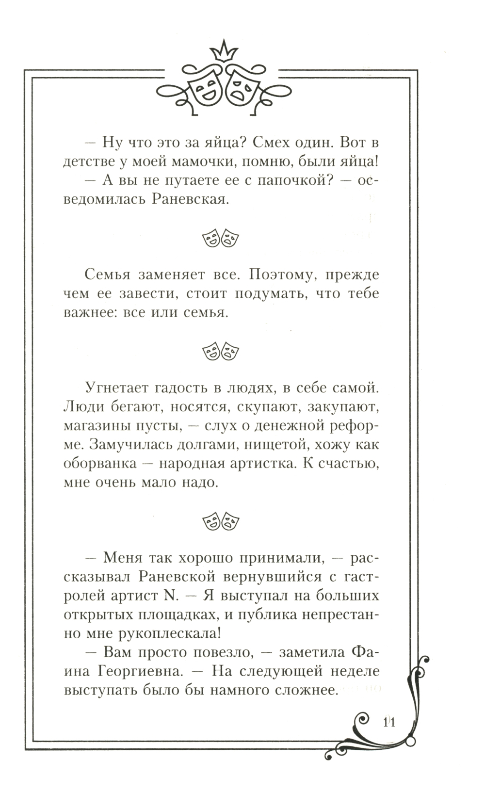 Фаина Георгиевна Раневская российская и советская актриса театра и кино, народная артистка СССР, кавалер ордена Ленина, лауреат трех Сталинских премий, ее именем в 1986 году был назван астероид... Самобытная и талантливая, она долгие годы своей жизни отдала театру, однако больше знакома нам по ярким и запоминающимся киноролям. Но большинство из нас любят и помнят ее не за это. Умная и самоироничная, она колола языком как жалом, но в то же время была ранимая. Она могла запросто раздать половину зарплаты нуждающимся и подбрасывала подарки в карманы уходящим гостям... Эта удивительная женщина была воплощением противоречия: хотела любить, но была одинока. Одни искали с ней встреч, другие избегали, одни боготворили, другие боялись и впадали в ступор, попав под словесный «обстрел» ее парадоксальной натуры. Именно острословие и искрометный юмор сделали Фаину Георгиевну любимицей многих. В беседах Раневская не стеснялась в выражениях, ее гениальные фразы разбирались на цитаты и сразу разлетались по городам и весям. Она была неудобной актрисой на сцене, а иногда и человеком в быту, потому, что остро реагировала на фальшь и ложь. Ее язвительная мудрость была, есть и будет актуальной.| Издательство | Центрполиграф |
