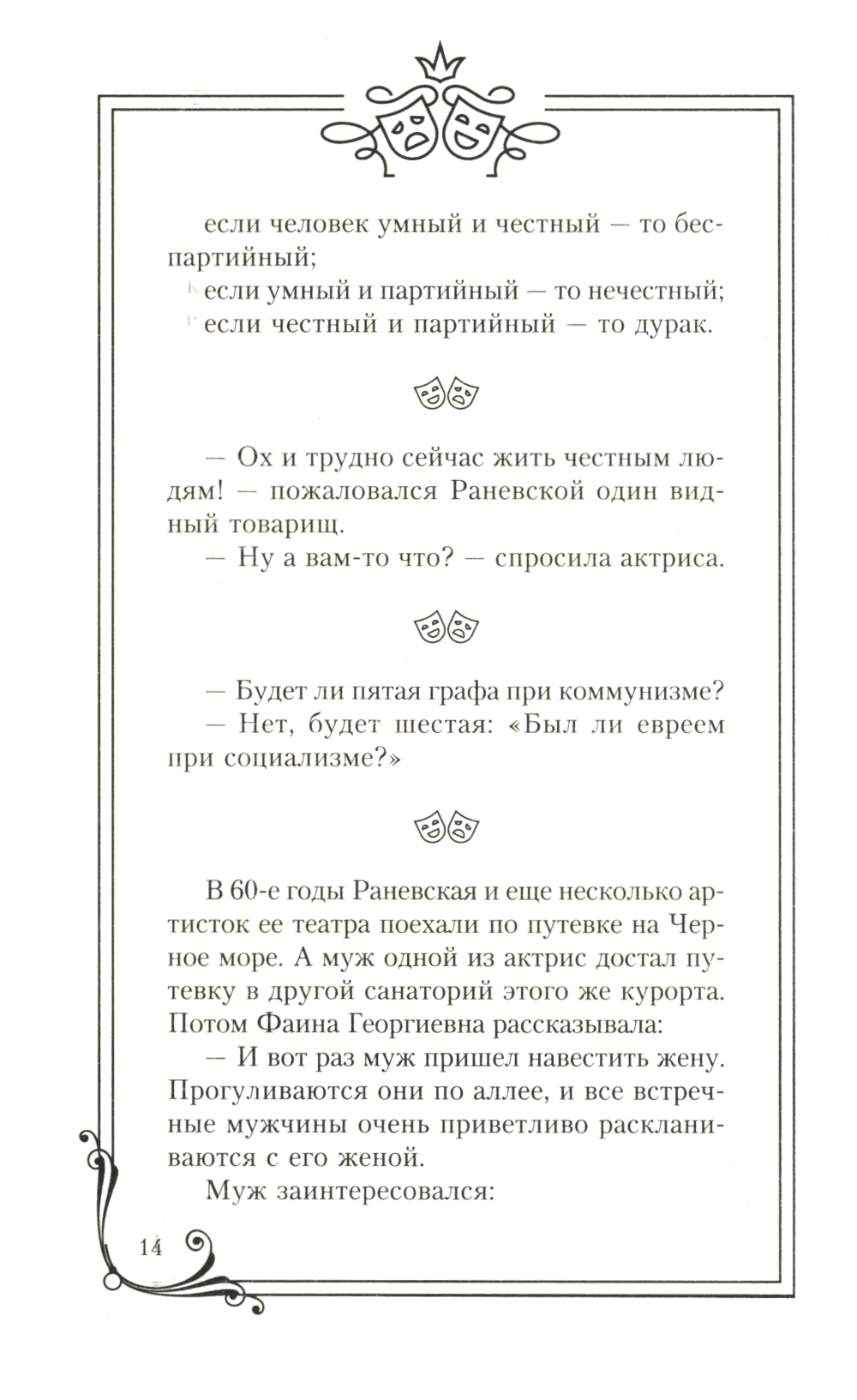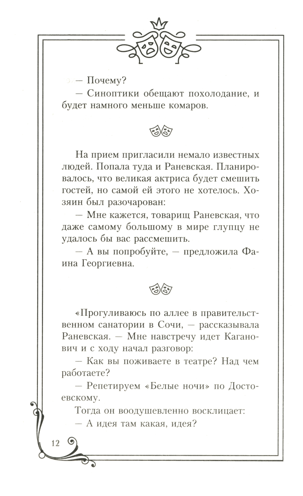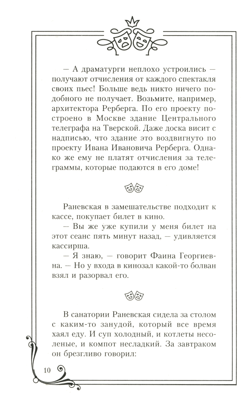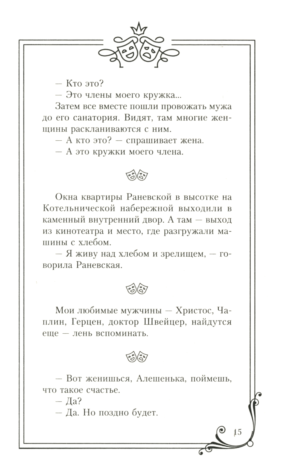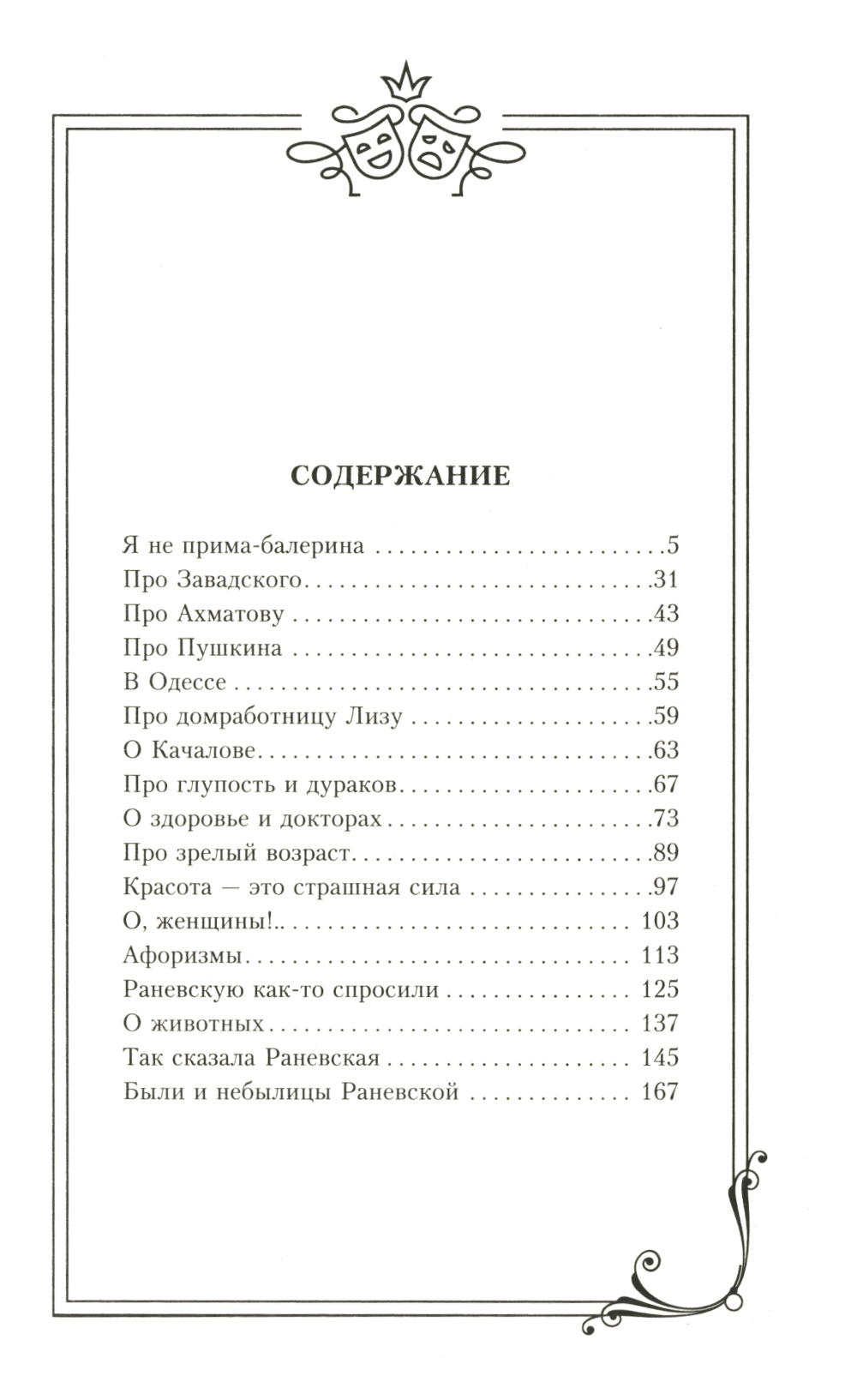 Фаина Георгиевна Раневская российская и советская актриса театра и кино, народная артистка СССР, кавалер ордена Ленина, лауреат трех Сталинских премий, ее именем в 1986 году был назван астероид... Самобытная и талантливая, она долгие годы своей жизни отдала театру, однако больше знакома нам по ярким и запоминающимся киноролям. Но большинство из нас любят и помнят ее не за это. Умная и самоироничная, она колола языком как жалом, но в то же время была ранимая. Она могла запросто раздать половину зарплаты нуждающимся и подбрасывала подарки в карманы уходящим гостям... Эта удивительная женщина была воплощением противоречия: хотела любить, но была одинока. Одни искали с ней встреч, другие избегали, одни боготворили, другие боялись и впадали в ступор, попав под словесный «обстрел» ее парадоксальной натуры. Именно острословие и искрометный юмор сделали Фаину Георгиевну любимицей многих. В беседах Раневская не стеснялась в выражениях, ее гениальные фразы разбирались на цитаты и сразу разлетались по городам и весям. Она была неудобной актрисой на сцене, а иногда и человеком в быту, потому, что остро реагировала на фальшь и ложь. Ее язвительная мудрость была, есть и будет актуальной.| Издательство | Центрполиграф |