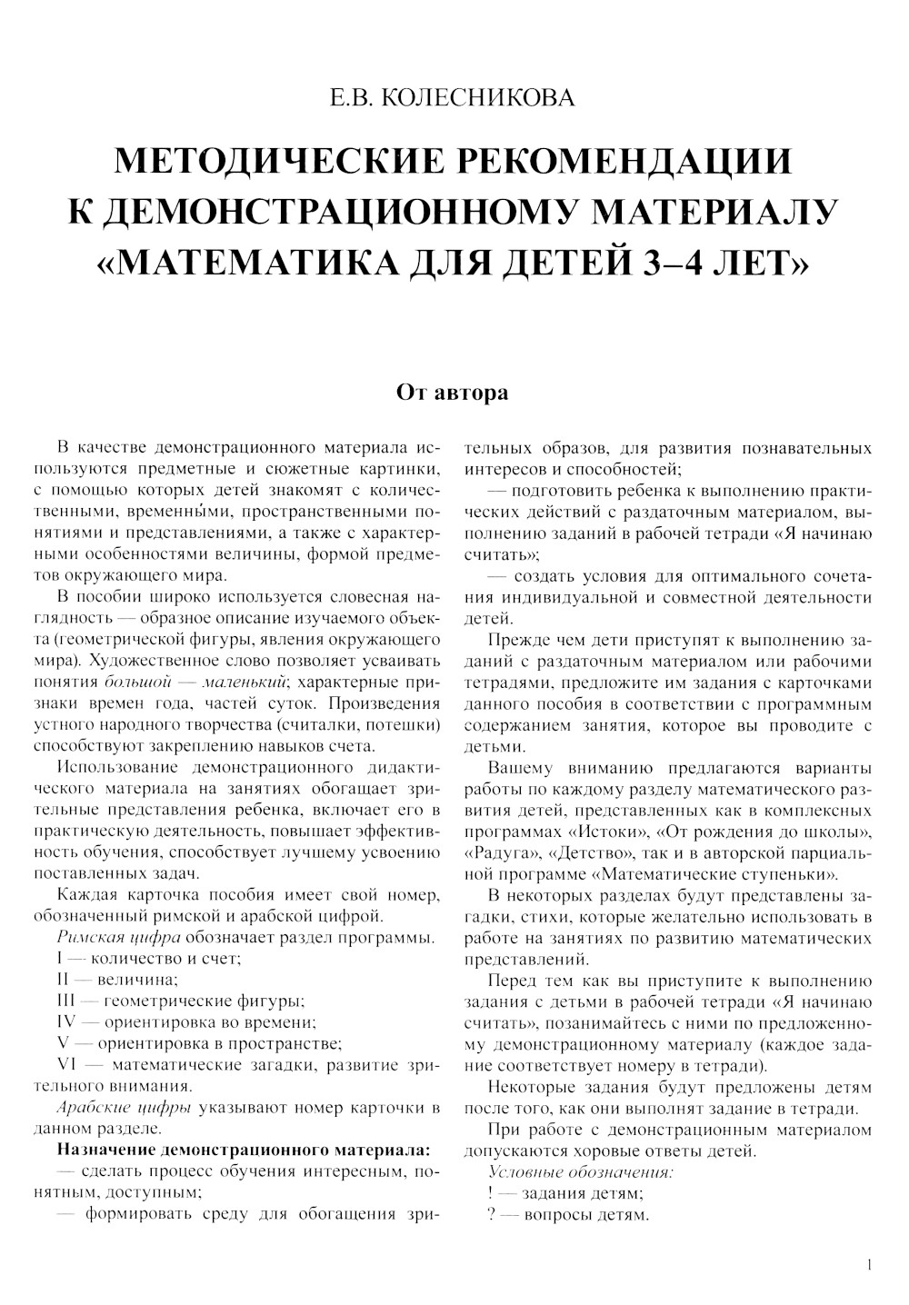 Комплект из 3 книг и демонстрационного материала: Состав комплекта: 1. Я начинаю считать. ЦВЕТНАЯ. Рабочая тетрадь для детей 3-4 лет. 2. Математика для детей 3-4 лет. Метод. пособие к раб. тетради Я начинаю считать. 3. Математика для детей 3-4 года. Демонстрационный материал. 4. Математические ступеньки. Программа развития математических представлений у дошкольников. В организационно-методическое сопровождение программы «Математические ступеньки» для детей 3-4 лет входят: 1) методическое пособие, 2) рабочая тетрадь «Я начинаю считать», 3) демонстрационный материал, 4) книги дополнительного комплекта.| Издательство | Творческий центр Сфера |
