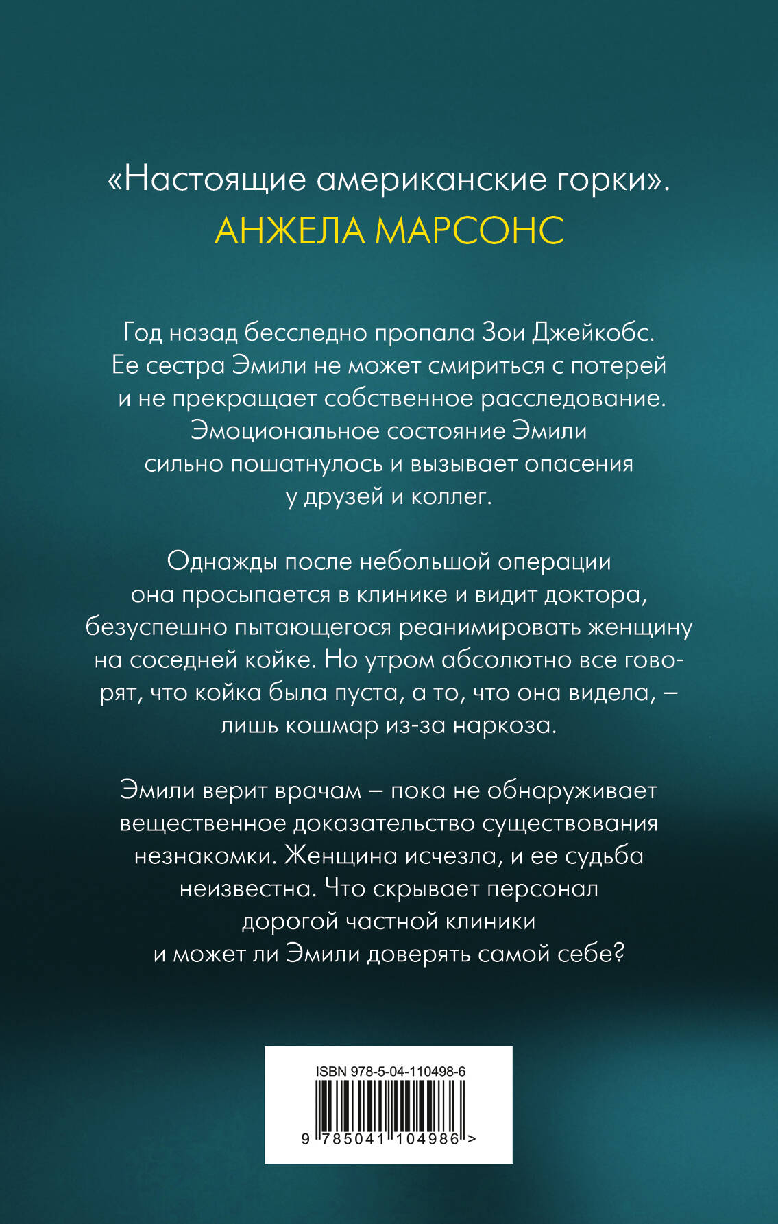 Год назад бесследно пропала Зои Джейкобс. Ее сестра Эмили не может смириться с потерей и не прекращает собственное расследование. Эмоциональное состояние Эмили сильно пошатнулось и вызывает опасения у друзей и коллег. Однажды после небольшой операции она просыпается в клинике и видит доктора, безуспешно пытающегося реанимировать женщину на соседней койке. Но утром абсолютно все говорят, что койка была пуста, а то, что она видела, - лишь кошмар из-за наркоза. Эмили верит врачам - пока не обнаруживает вещественное доказательство существования незнакомки. Женщина исчезла, и ее судьба неизвестна. Что скрывает персонал дорогой частной клиники, и может ли Эмили доверять самой себе?| Издательство | ООО "Издательство "Эксмо" |