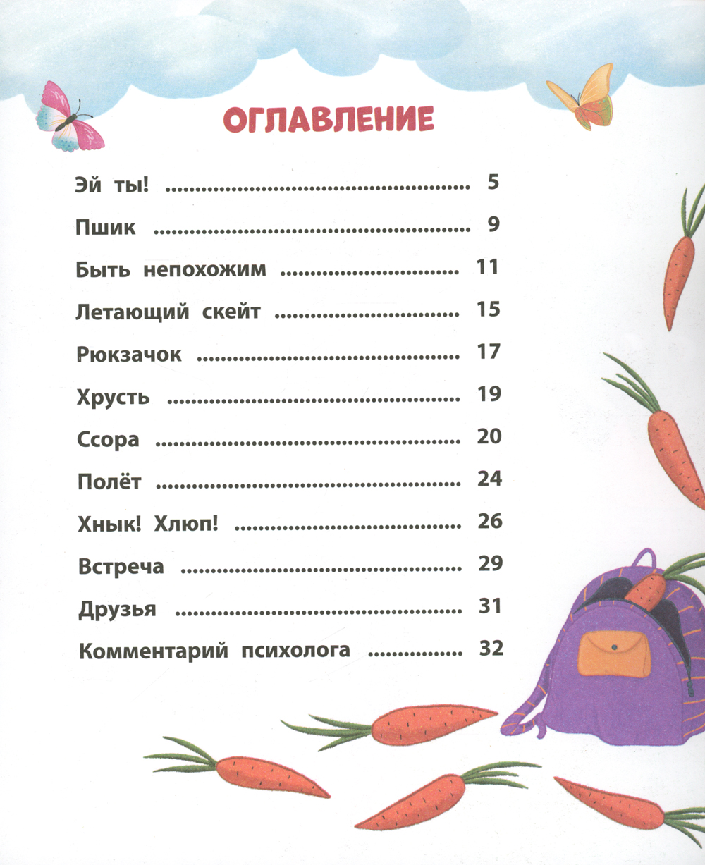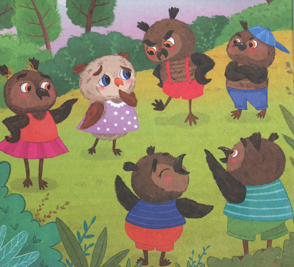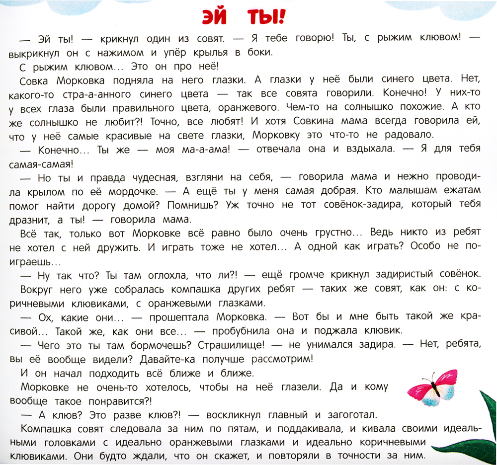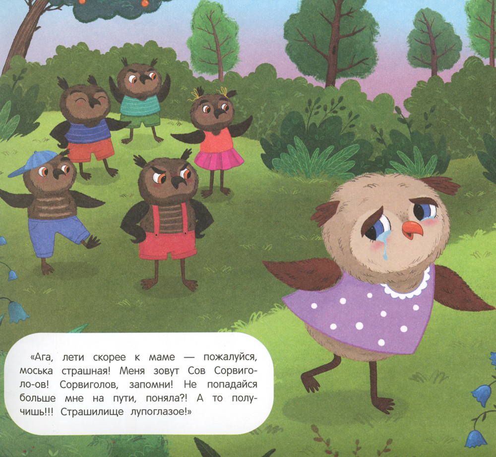 Совка Морковка не такая, как все: у неё синие глаза и рыжий клюв, и она любит есть морковку. За эту свою непохожесть она становится объектом насмешек и травли со стороны таких похожих друг на друга совят с «правильным цветом глаз и клювов». Вместе с Совкой и её лучшим другом Пшиком ребёнок узнает, как избежать обид и что совсем неважно, какого цвета у тебя глаза, какой формы нос и что ты любишь есть. Главное - какой ты сам! История о буллинге сопровождена комментарием психолога Натальи Бербер, объясняющим, как правильно вести себя в таких непростых ситуациях и какую поддержку могут оказать родители.