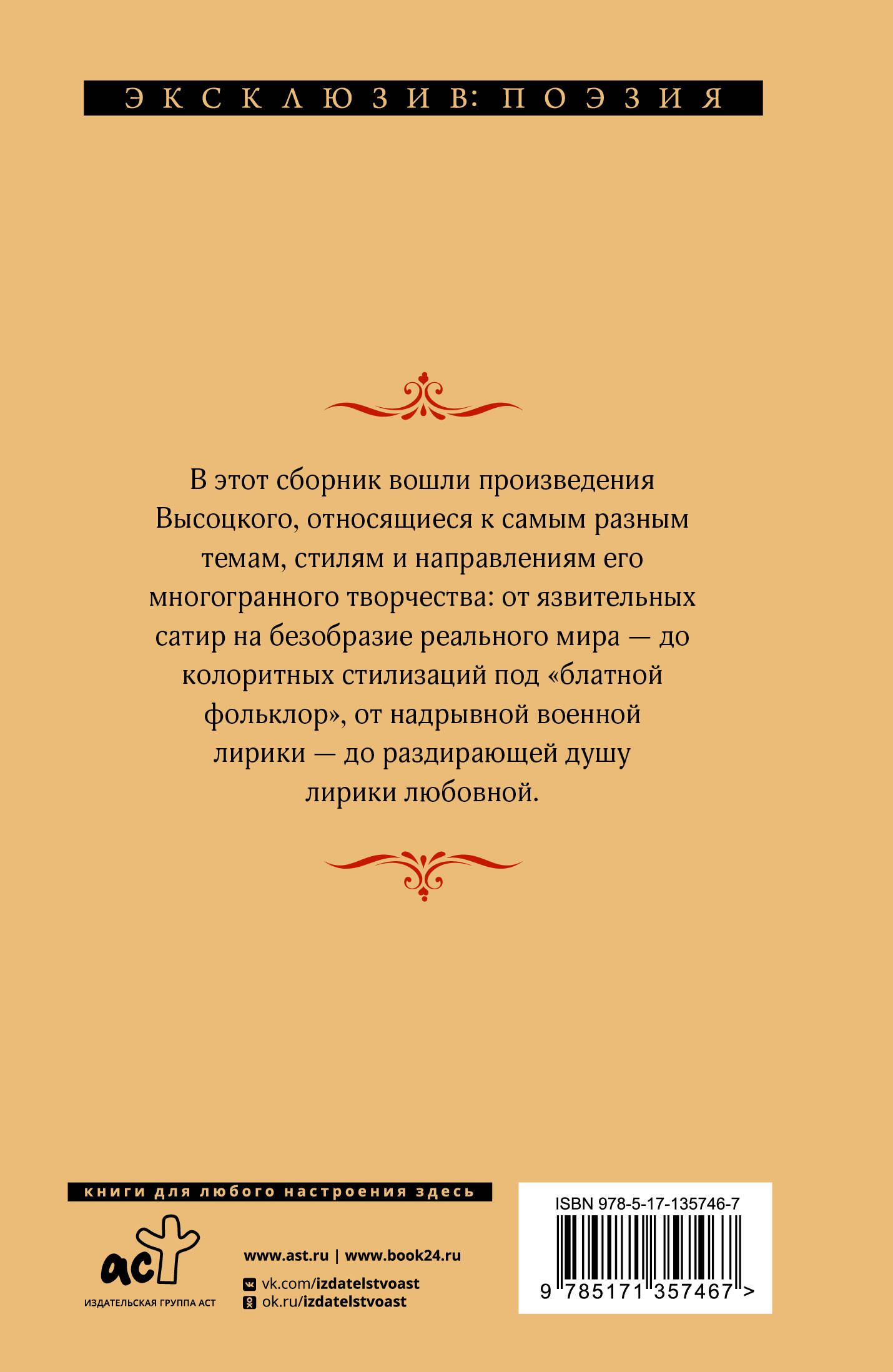 В этот сборник вошли произведения Высоцкого, относящиеся к самым разным темам, стилям и направлениям его многогранного творчества: от язвительных сатир на безобразие реального мира - до колоритных стилизаций под "блатной фольклор", от надрывной военной лирики - до раздирающей душу лирики любовной.| Издательство | Издательство "АСТ" |