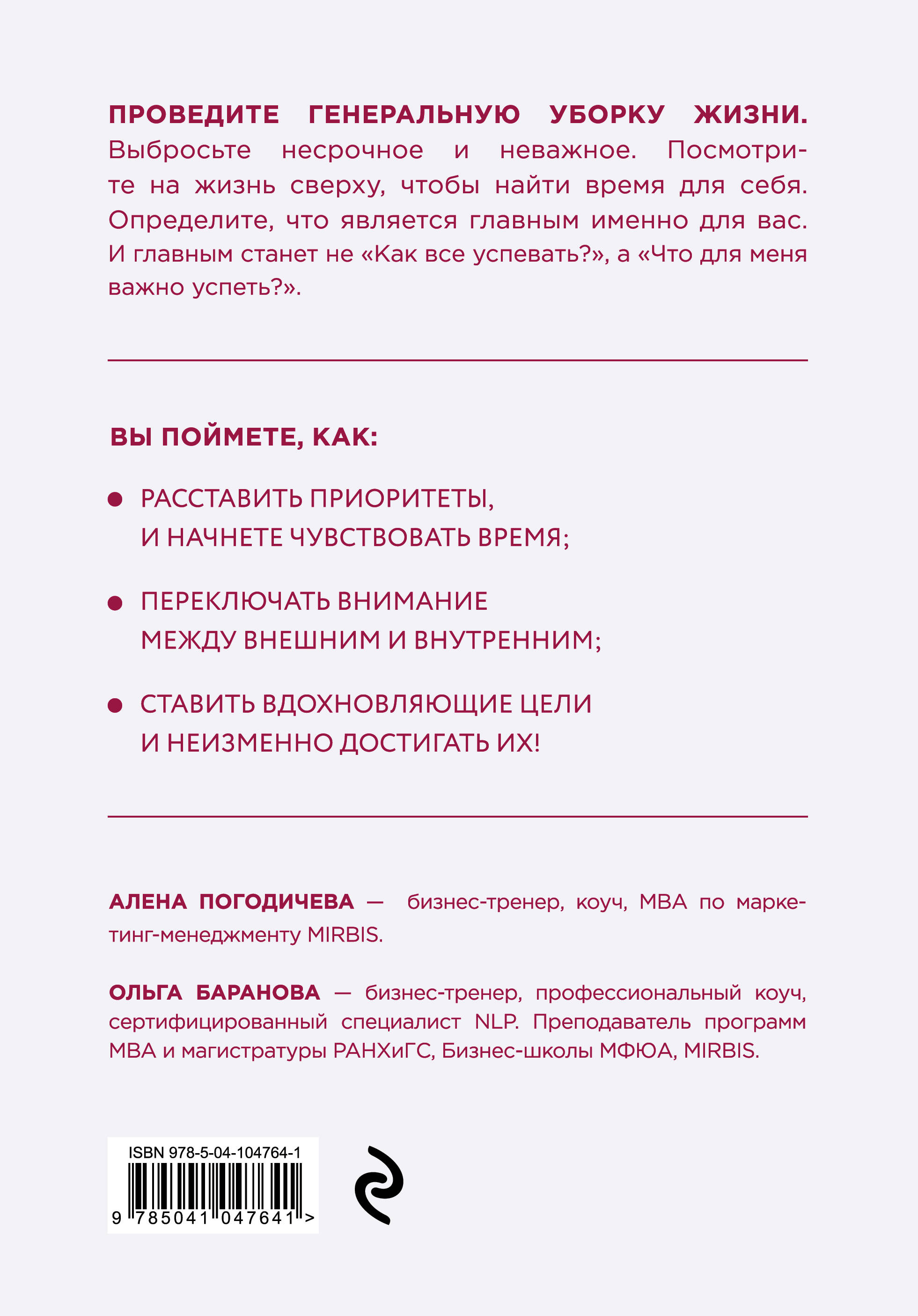 Проведите генеральную уборку жизни. Выбросьте несрочное и неважное. Посмотрите на жизнь сверху, чтобы найти время для себя. Определите, что является главным именно для вас. И главным станет не "Как все успевать?", а "Что для меня важно успеть?"| Издательство | ООО "Издательство "Эксмо" |