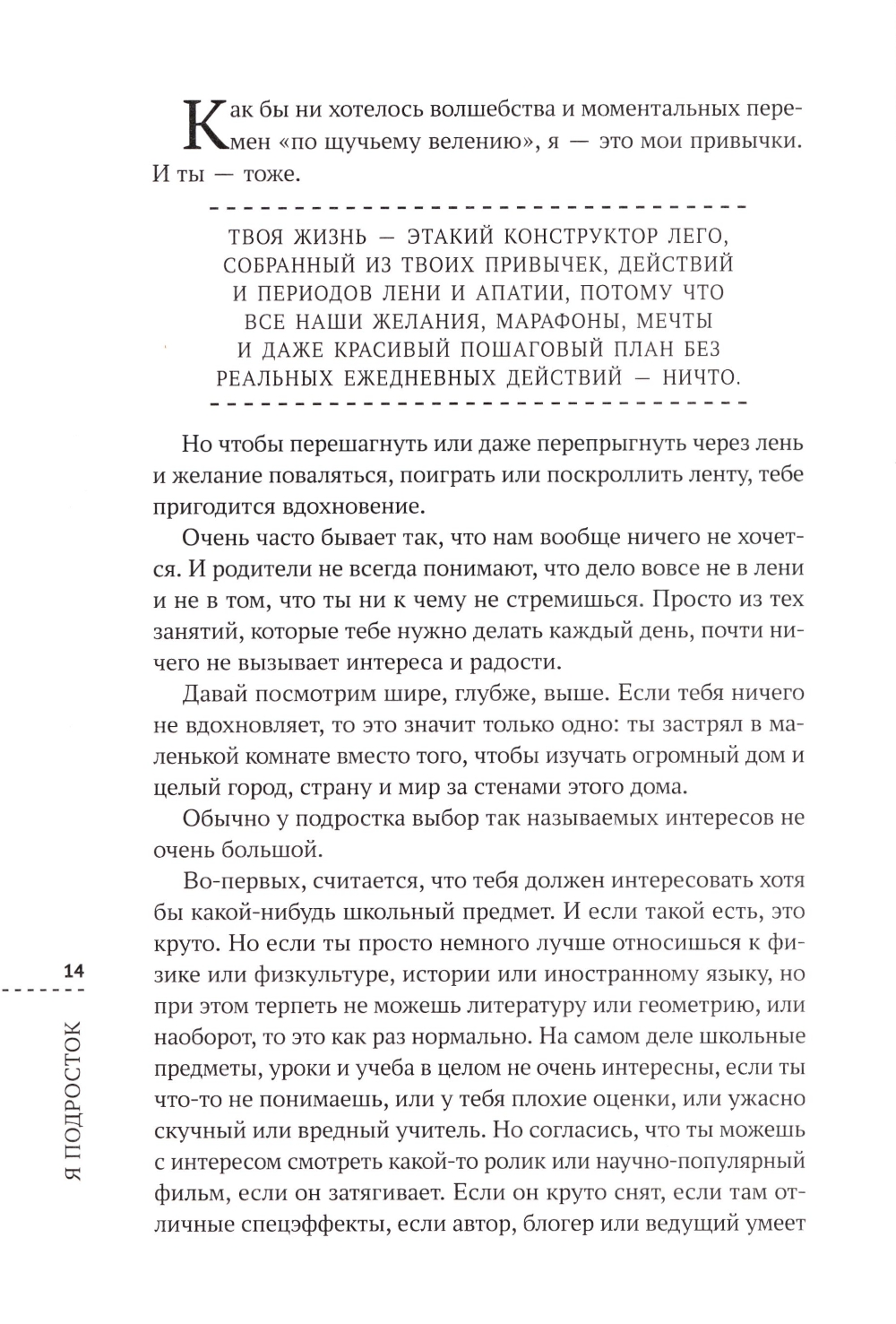 Эта книга о том, как, не прогибаясь под изменчивый мир и не подстраиваясь под чьи-то ожидания, чувствовать себя более уверенно, расслабленно. Как испытывать интерес и радость чаще, а уныние и страх - реже. И о том, как строить свой собственный мир не через постоянную борьбу за право быть собой, а чуть проще, увереннее и веселее. А еще ты найдешь тут конкретные ответы на разные вопросы по безопасности и самозащите, пару интересных глав про личные отношения и интересные тесты, которые помогут тебе лучше понять себя, свои желания и ценности, возможности и таланты.