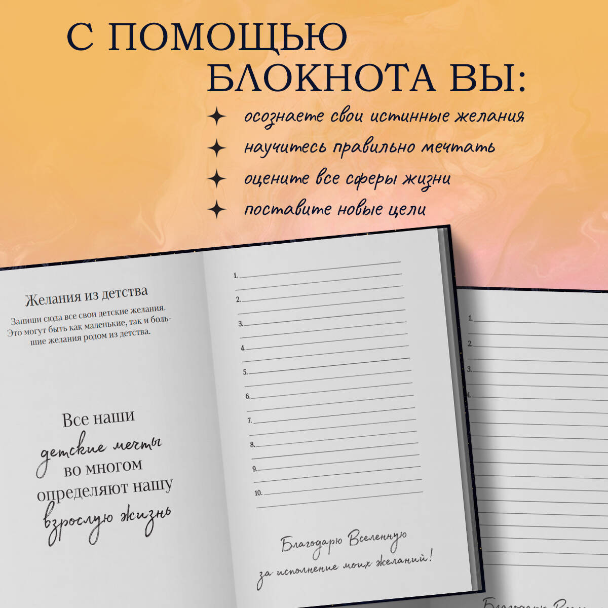Раскройте свои истинные желания! Блокнот желаний - это особый инструмент для воплощения каждой мечты в реальность. Запишите все, что хотите получить от жизни, будь то счастливые отношения, карьерный рост или гармонию внутри себя. С помощью блокнота вы: - Научитесь правильно формулировать свои желания. - Проанализируете сферы вашей жизни, заполнив колесо баланса. - Сможете осознать свои желания в каждой сфере. - Превратите мечты в цель, определив необходимые шаги для выполнения каждого желания. - Вспомните о значимости своей жизни. Блокнот желаний станет прекрасным подарком для тех, кто интересуется самопознанием и осознанностью. Не бойтесь мечтать смело - все желания, записанные в этом блокноте, приведут вас к успеху!