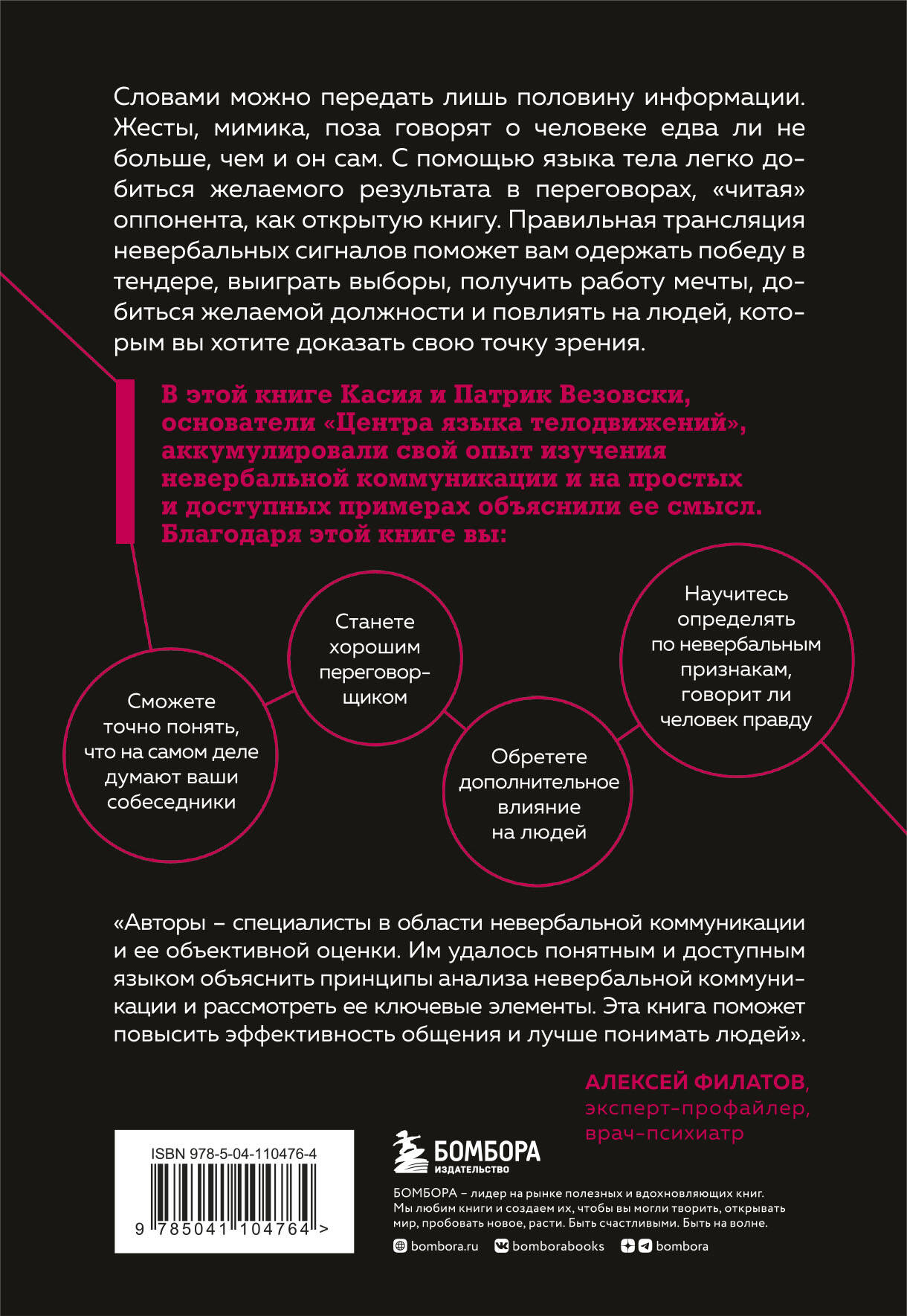 Словами можно передать лишь половину информации. Жесты, мимика, поза говорят о человеке едва ли не больше, чем он сам. С помощью языка тела легко добиться желаемого результата в переговорах, «читая оппонента», как открытую книгу. Правильная трансляция невербальных сигналов поможет вам одержать победу в тендере, выиграть выборы, получить работу мечты, добиться желаемой должности и повлиять на людей, которым вы хотите доказать свою точку зрения.