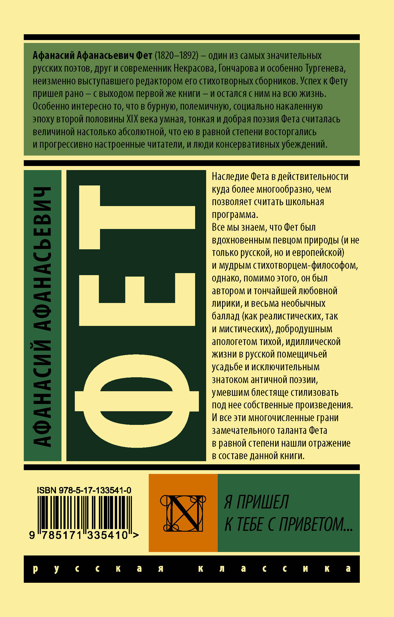 Наследие Фета в действительности куда более многообразно, чем позволяет считать школьная программа. Все мы знаем, что Фет был вдохновенным певцом природы (и не только русской, но и европейской) и мудрым стихотворцем-философом, однако, помимо этого, он был автором и тончайшей любовной лирики, и весьма необычных баллад (как реалистических, так и мистических), добродушным апологетом тихой, идиллической жизни в русской помещичьей усадьбе и исключительным знатоком античной поэзии, умевшим блестяще стилизовать под нее собственные произведения. И все эти многочисленные грани замечательного таланта Фета в равной степени нашли отражение в составе данной книги.| Издательство | ИЗДАТЕЛЬСТВО "АСТ" |