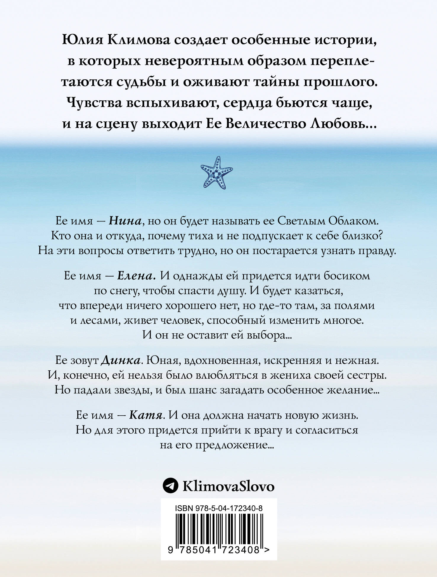 Истории Юлии Климовой, собранные в книге - о разных людях с совершенно несхожими судьбами. Но все они - нежные ли, пронзительные или озорные - непременно о любви. Одни персонажи бесцеремонно явятся на порог и очаруют вас своей непринужденностью. Другие - осторожно постучатся в ваше сердце и будут с трепетом ждать, когда вы впустите их. В руках их - любовь, у каждого своя, и каждый готов поделиться с вами ее частицей. Любовь пришла - вам осталось лишь протянуть руку и открыть дверь. Ее имя - Нина, но он будет называть ее Светлым Облаком. Кто она и откуда, почему тиха и не подпускает к себе близко? На эти вопросы ответить трудно, но он постарается узнать правду. Ее имя - Елена. И однажды ей придется идти босиком по снегу, чтобы спасти душу. И будет казаться, что впереди ничего хорошего нет, но где-то там, за полями и лесами, живет человек, способный изменить многое. И он не оставит ей выбора… Ее зовут Динка. Юная, вдохновенная, искренняя и нежная. И, конечно, ей нельзя было влюбляться в жениха своей сестры. Но падали звезды, и был шанс загадать особенное желание… Ее имя - Катя. И она должна начать новую жизнь. Но для этого придется прийти к врагу и согласиться на его предложение…
