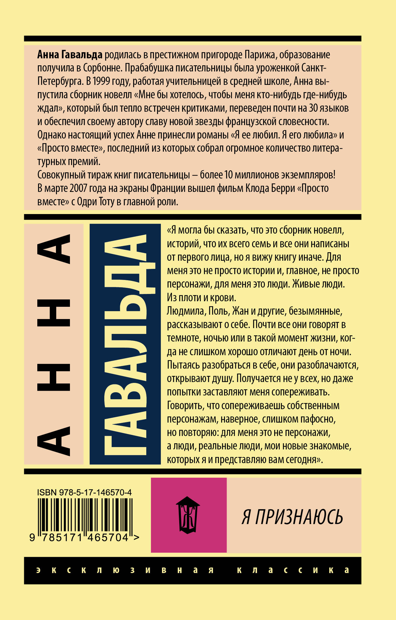 Я могла бы сказать, что это сборник новелл, историй, что их всего семь и все они написаны от первого лица, но я вижу книгу иначе. Для меня это не просто истории и, главное, не просто персонажи, для меня это люди. Живые люди. Из плоти и крови. Людмила, Поль, Жан и другие, безымянные, рассказывают о себе. Почти все они говорят в темноте, ночью или в такой момент жизни, когда не слишком хорошо отличают день от ночи. Пытаясь разобраться в себе, они разоблачаются, снимают доспехи, открывают душу. Получается не у всех, но даже попытки заставляют меня сопереживать. Говорить, что сопереживаешь собственным персонажам, наверное, слишком пафосно, но повторяю: для меня это не персонажи, а люди, реальные люди, мои новые знакомые, которых я и представляю вам сегодня.| Издательство | ИЗДАТЕЛЬСТВО "АСТ" |