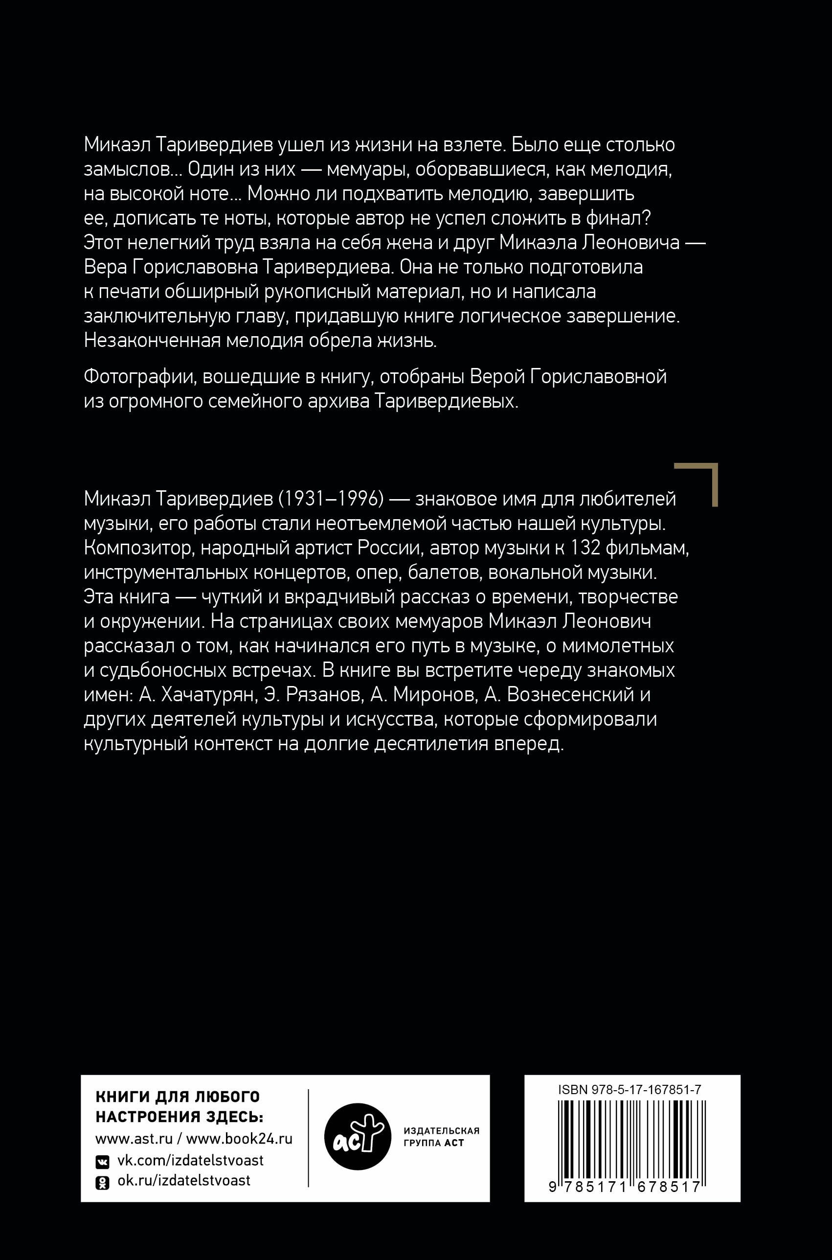 "Микаэл Таривердиев -- знаковое имя для любителей музыки, его работы стали неотъемлемой частью нашей культуры. Композитор, народный артист России, автор музыки к 132 фильмам, инструментальных концертов, опер, балетов, вокальной музыки. Этак книга -- чуткий и вкрадчивый рассказ о времени, творчестве и окружении. На страницах своих мемуаров Микаэл Леонович рассказал о том, как начинался его путь в музыке, о мимолетных и судьбоносных встречах. В книге вы встретите череду знакомых имен: А. Хачатурян, Э. Рязанов, А. Миронов, А. Вознесенский и других деятелей культуры и искусства, которые сформировали культурный контекст на долгие десятилетия вперед".| Издательство | Издательство "АСТ" |