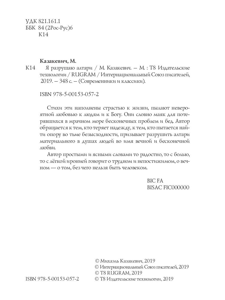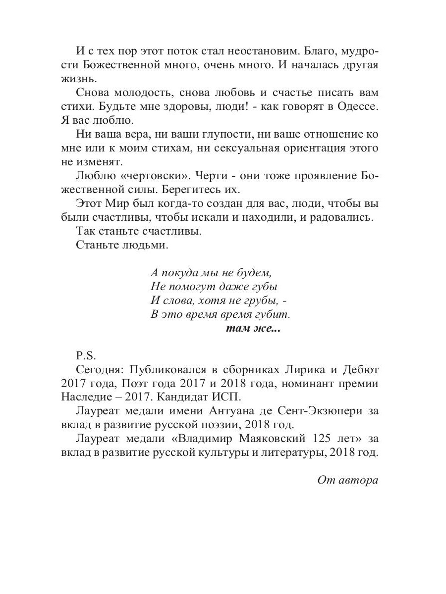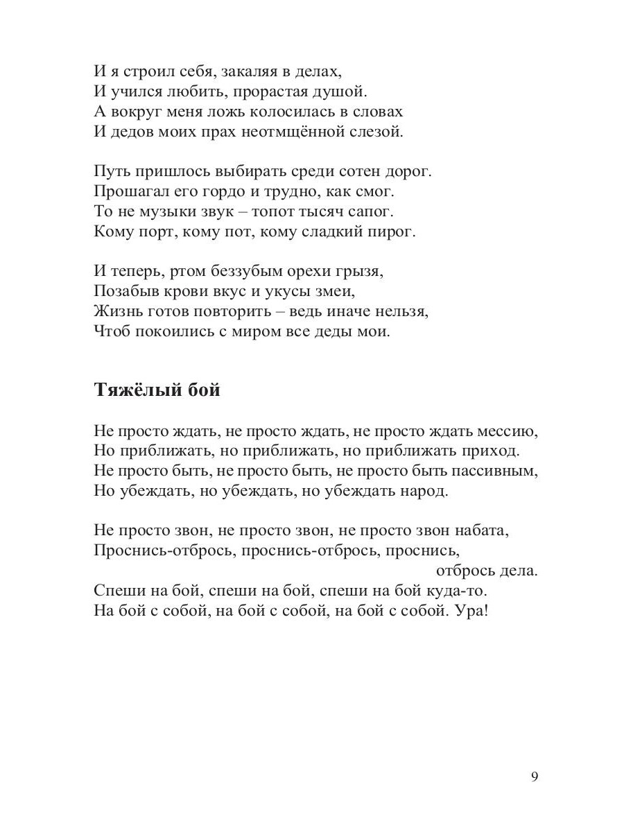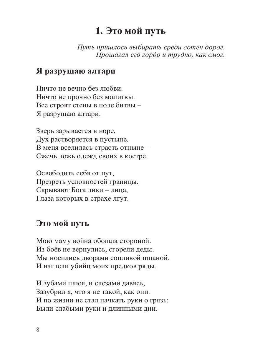 Стихи эти наполнены страстью к жизни, пылают невероятной любовью к людям и к Богу. Они словно маяк для потерявшихся в мрачном море бесконечных проблем и бед. Автор обращается к тем, кто теряет надежду, к тем, кто пытается найти опору во тьме безысходности, призывает разрушить алтари материального в душах людей во имя вечной и бесконечной любви. Автор простыми и ясными словами то радостно, то с болью, то с лёгкой иронией говорит о трудном и непостижимом, о вечном - о том, без чего нельзя быть человеком.