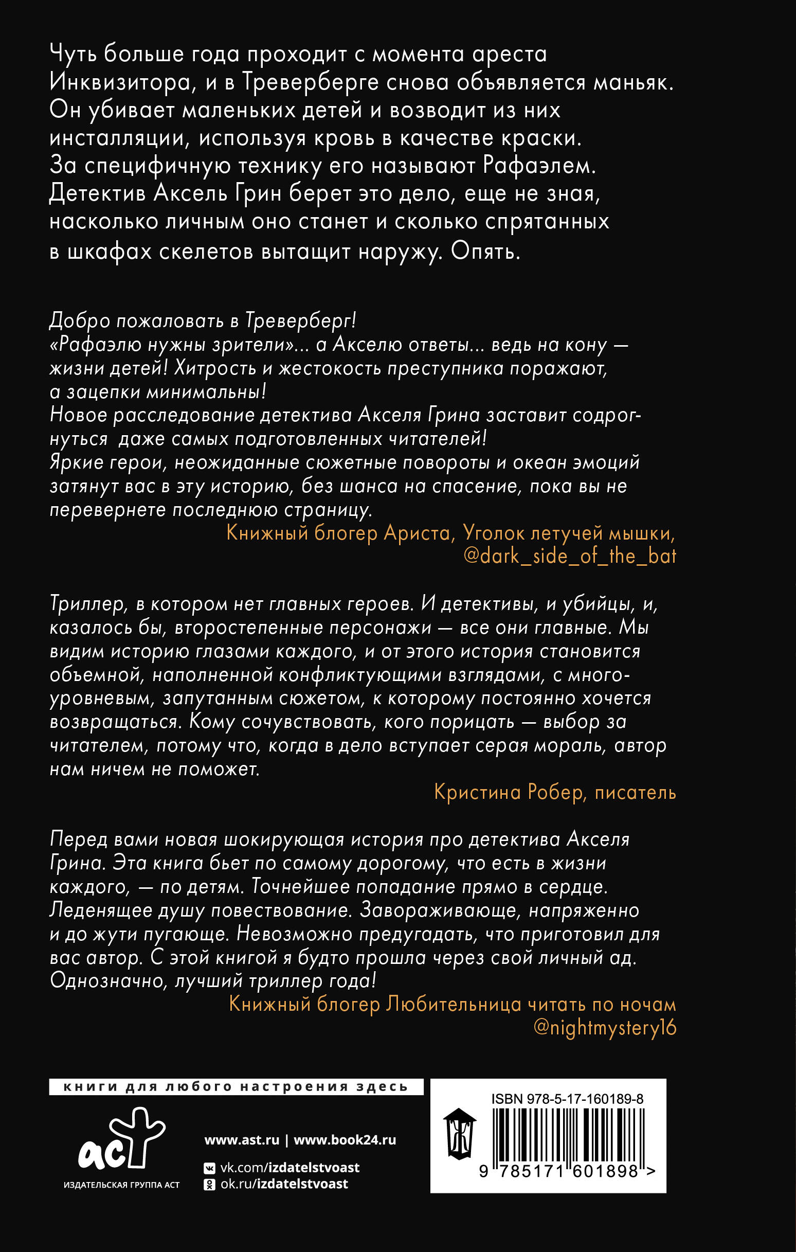 Чуть больше года проходит с момента ареста Инквизитора, и в Треверберге снова объявляется маньяк. Он убивает маленьких детей и возводит из них инсталляции, используя кровь в качестве краски. За специфичную технику его называют Рафаэлем. Детектив Аксель Грин берет это дело, еще не зная, насколько личным оно станет и сколько спрятанных в шкафах скелетов вытащит наружу. Опять.| Издательство | Издательство "АСТ" |