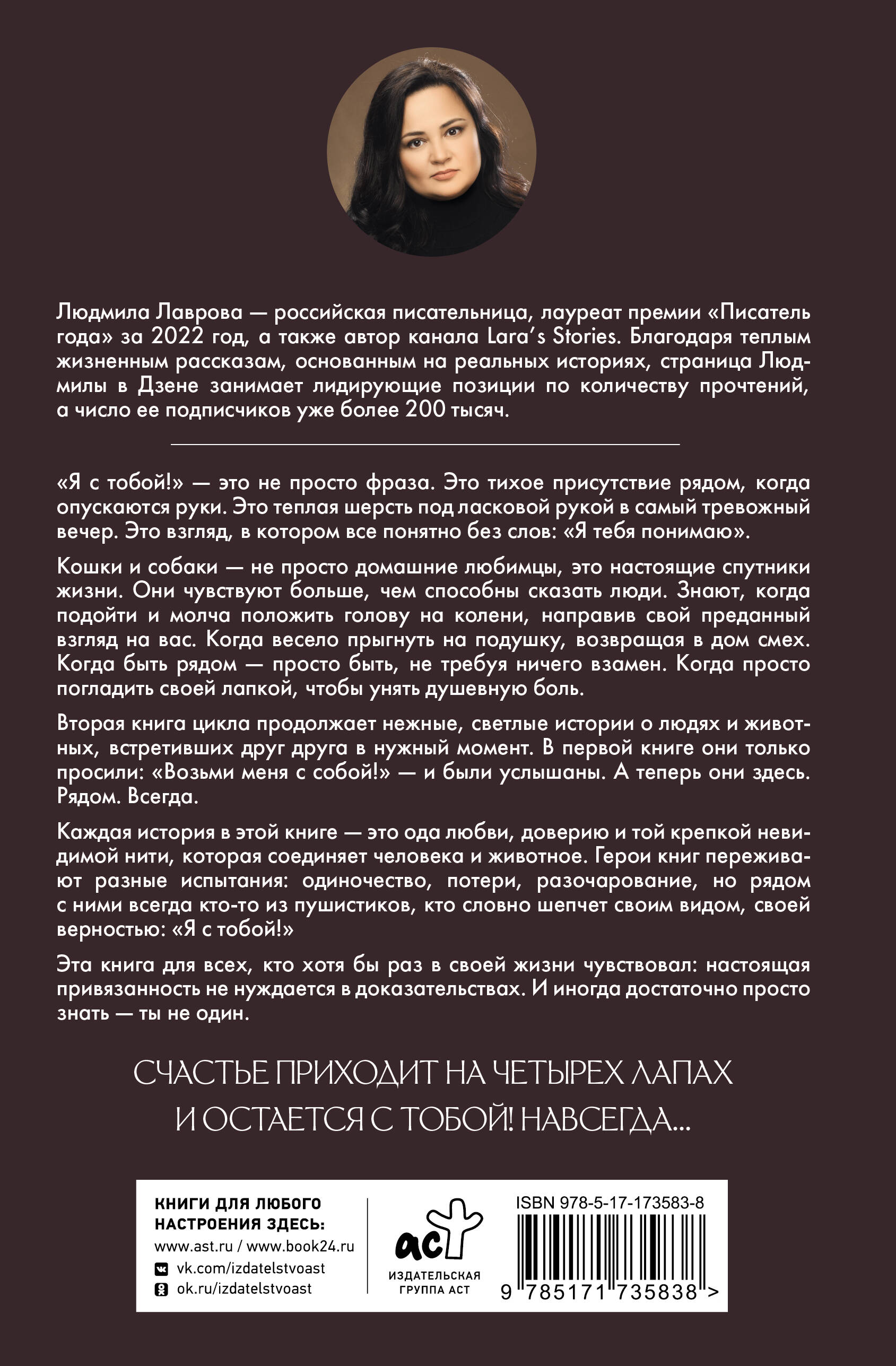 Каждая история в этой книге - это ода любви, доверию и той крепкой невидимой нити, которая соединяет человека и животное. Герои книг переживают разные испытания: одиночество, потери, разочарование, но рядом с ними всегда кто-то из пушистиков, кто словно шепчет своим видом, своей верностью: «Я с тобой!»| Издательство | Издательство "АСТ" |